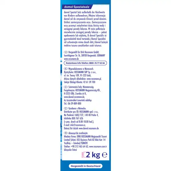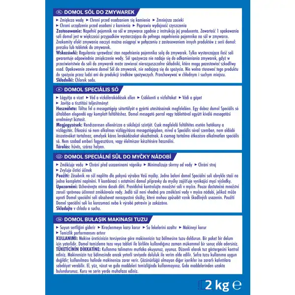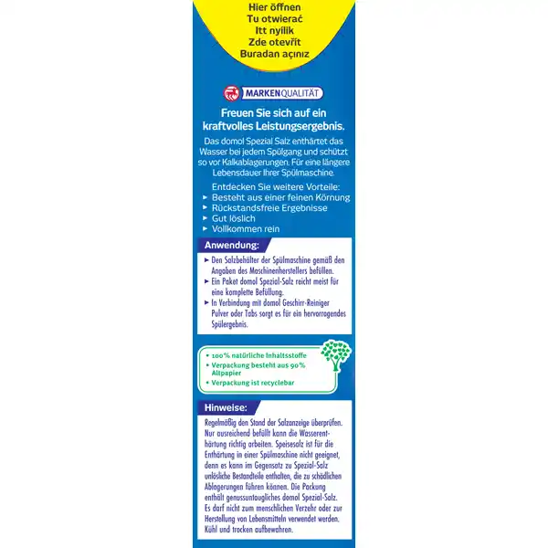 Regelmäßig den Stand der Salzanzeige überprüfen. Nur ausreichend befüllt kann die Wasserenthärtung richtig arbeiten. Speisesalz ist für die Enthärtung in einer Spülmaschine nicht geeignet, denn es kann im Gegensatz zu Spezial-Salz unlösliche Bestandteile enthalten, die zu schädlichen Ablagerungen führen können. Die Packung enthält genussuntaugliches domol Spezial-Salz. Es darf nicht zum menschlichen Verzehr oder zur Herstellung von Lebensmitteln verwendet werden.
