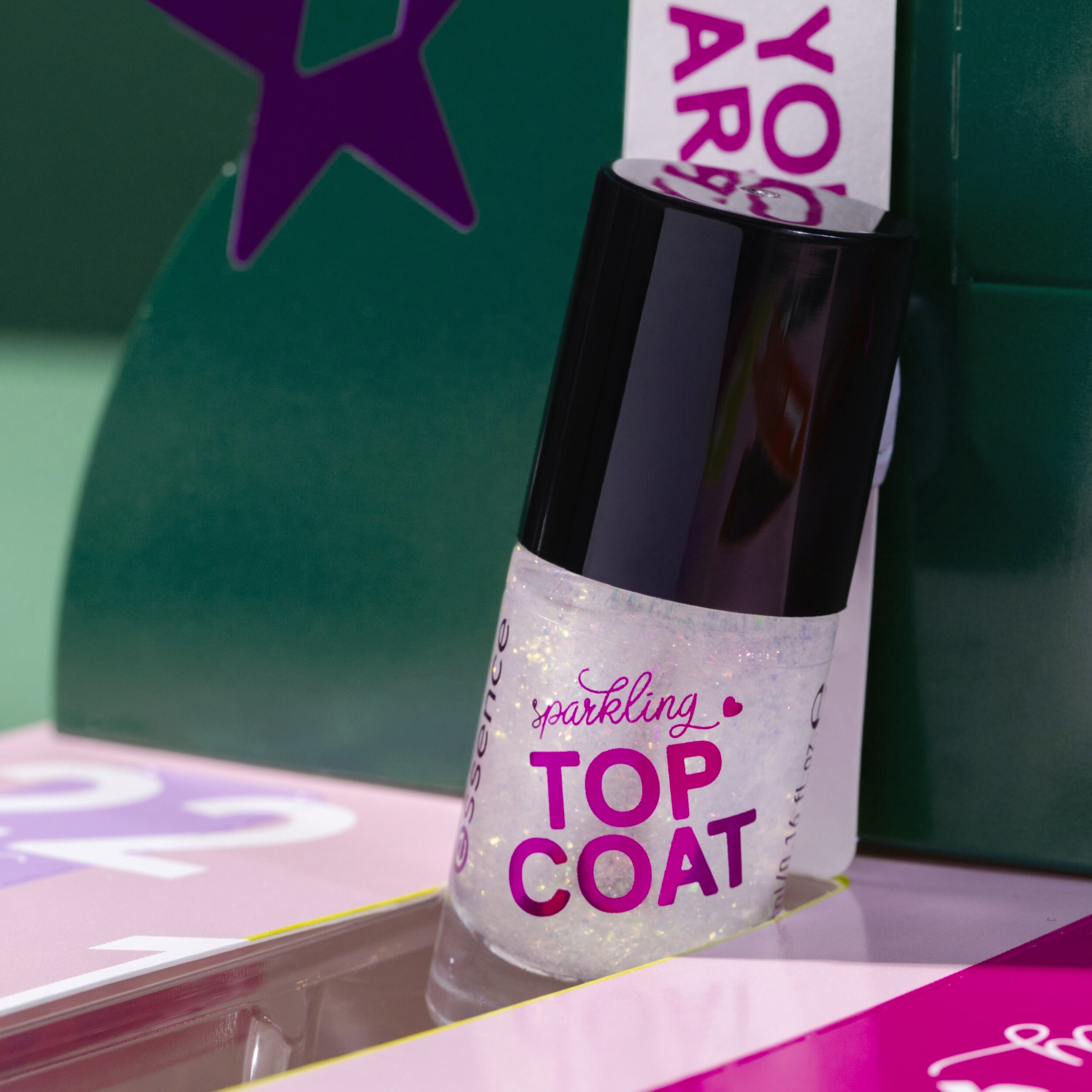 essence sparkling top coat: BUTYL ACETATE, NITROCELLULOSE, ETHYL ACETATE, ACETYL TRIBUTYL CITRATE, ISOPROPYL ALCOHOL, PHTHALIC ANHYDRIDE/TRIMELLITIC ANHYDRIDE/GLYCOLS COPOLYMER, SILICA, N-BUTYL ALCOHOL, CALCIUM SODIUM BOROSILICATE, CALCIUM ALUMINUM BOROSILICATE, TIN OXIDE, CI 77891 (TITANIUM DIOXIDE)