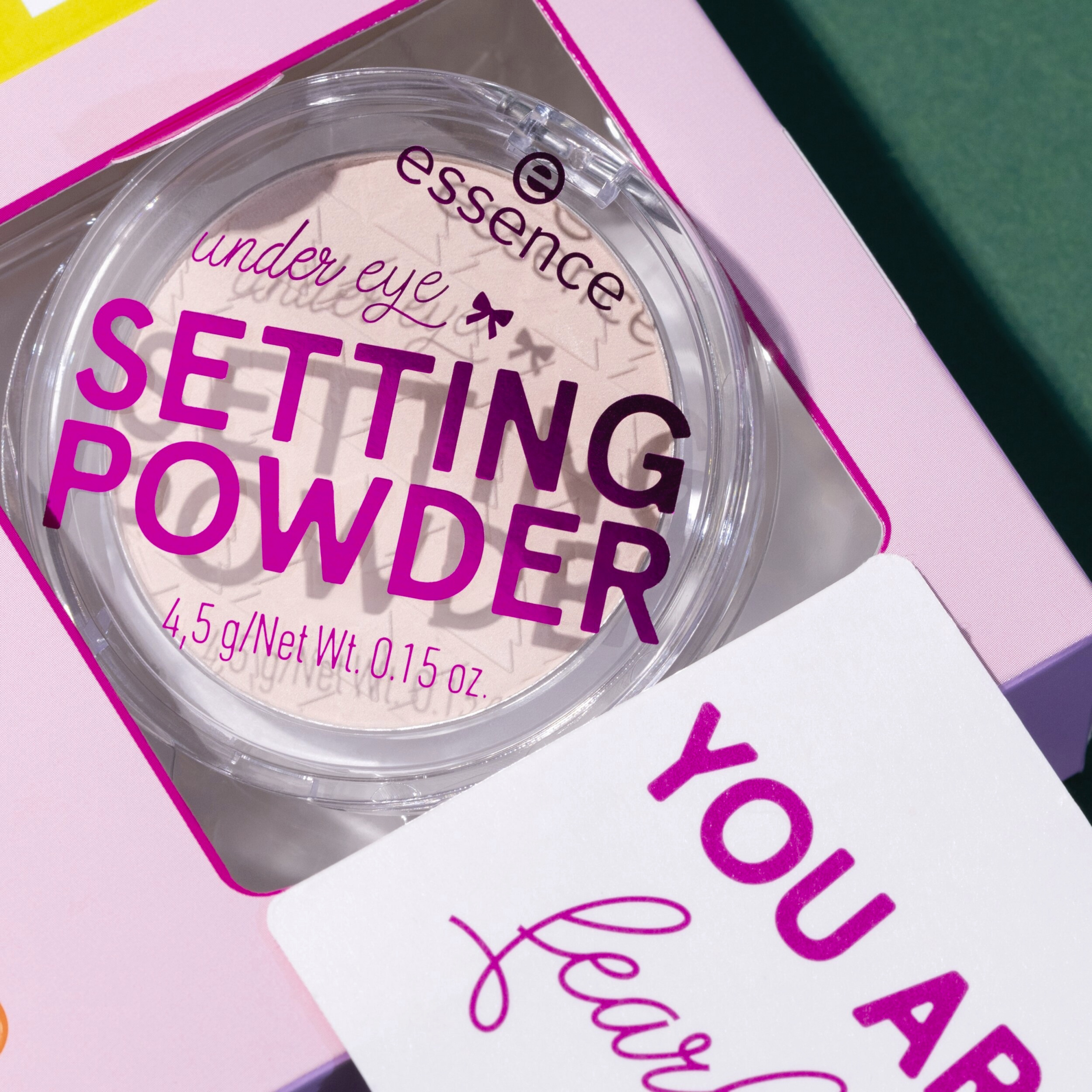 essence under eye setting powder: MICA, TALC, MAGNESIUM STEARATE, CETEARYL ETHYLHEXANOATE, SILICA, VINYL DIMETHICONE/METHICONE SILSESQUIOXANE CROSSPOLYMER, HYDROGENATED POLYISOBUTENE, OCTYLDODECYL STEAROYL STEARATE, ETHYLHEXYLGLYCERIN, PHENOXYETHANOL, CI 77163 (BISMUTH OXYCHLORIDE), CI 77491 (IRON OXIDES), CI 77742 (MANGANESE VIOLET), CI 77891 (TITANIUM DIOXIDE).