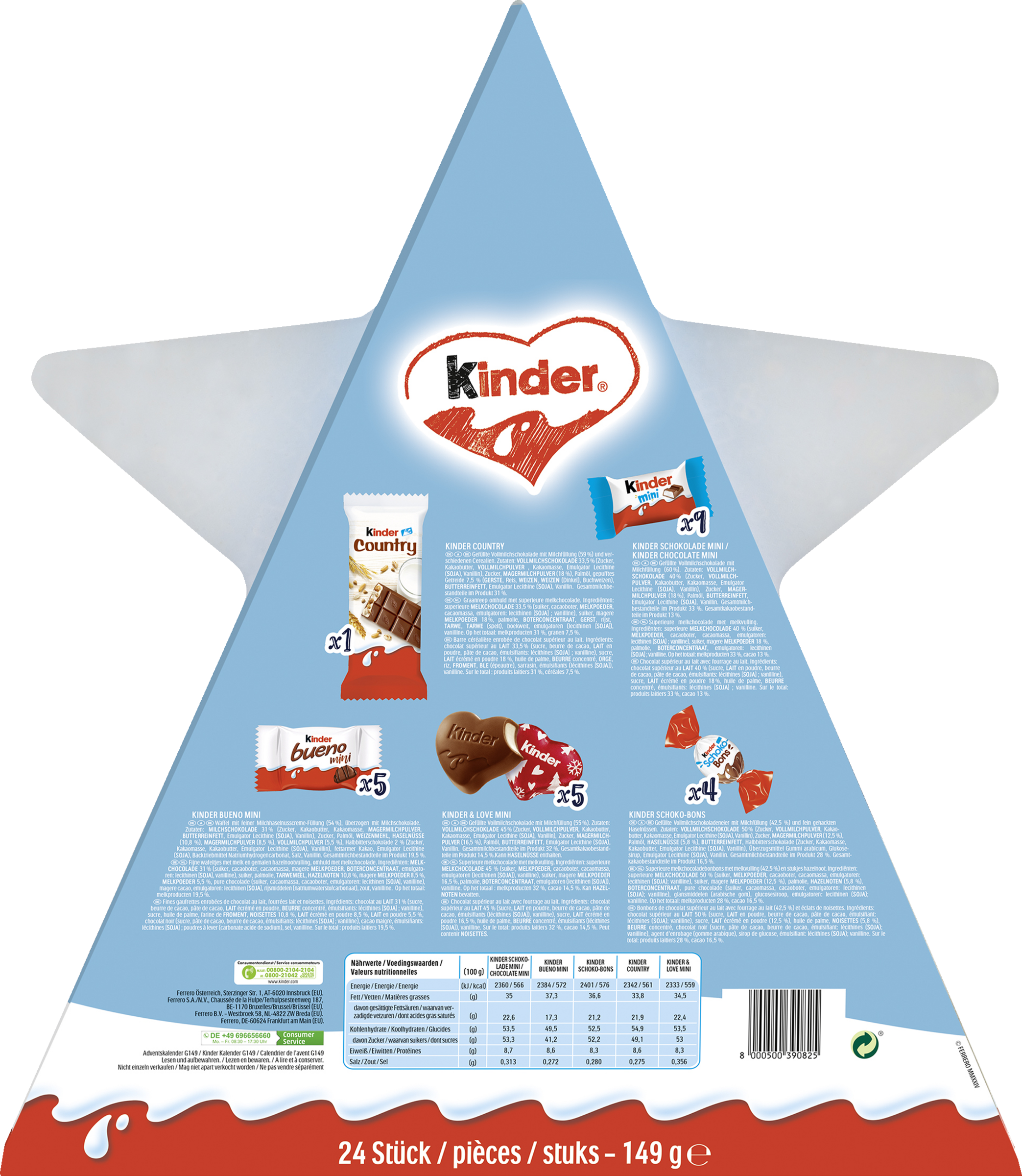 - enthält 9x kinder Schokolade mini, 5x kinder bueno mini, 5x kinder & Love Mini, 4x kinder Schoko-Bons, 1x kinder Country