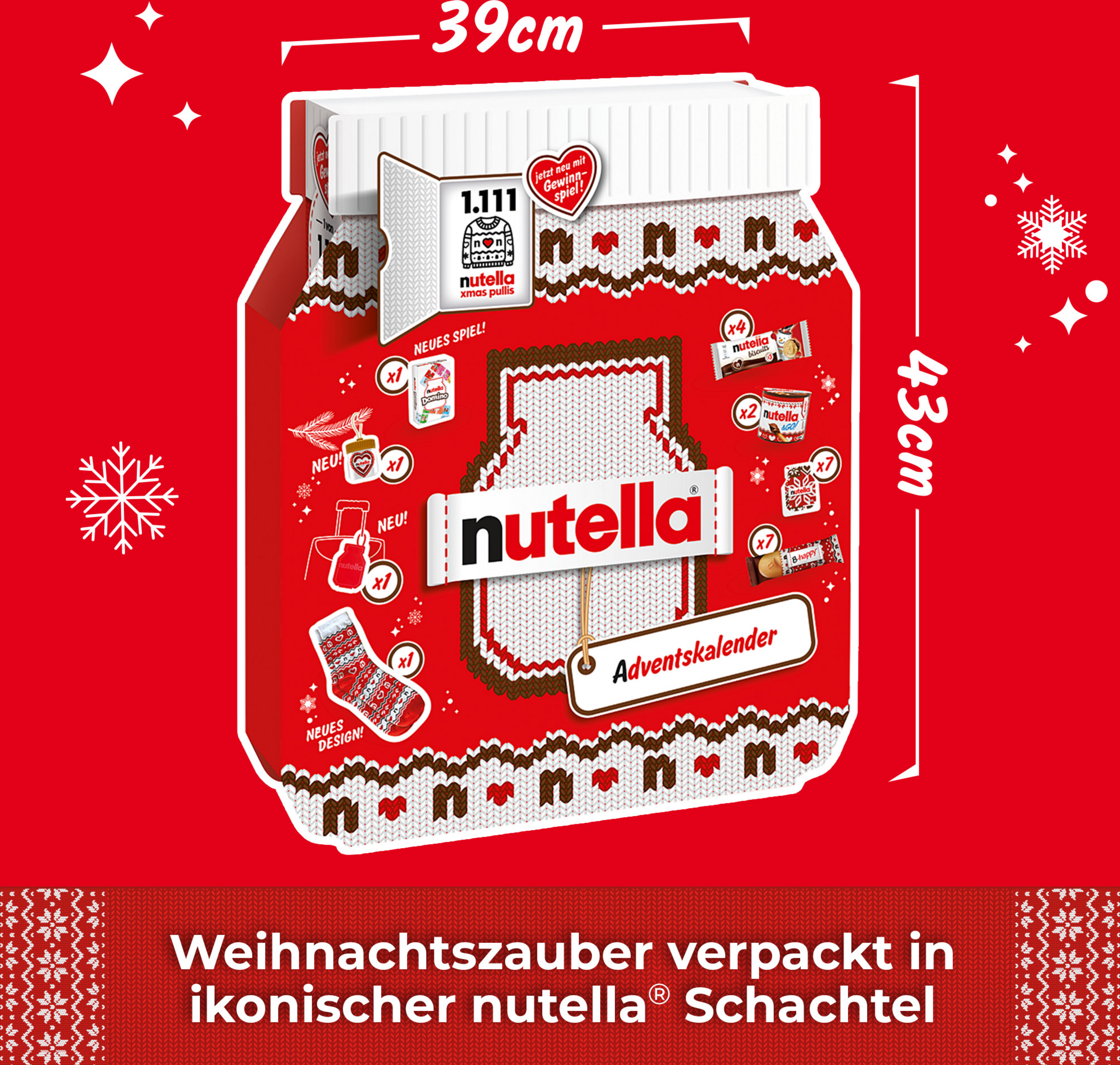 Starte jeden Morgen in der Adventszeit mit einem Lächeln! Der offizielle Nutella Adventskalender 2025 versüßt dir das Warten auf Weihnachten auf die leckerste Art und Weise. Hinter 24 Türchen versteckt sich die ganze Vielfalt der Nutella-Welt. Ob als klassischer Brotaufstrich, als knuspriger Snack für zwischendurch oder als kleine Überraschung – hier kommt jeder auf seine Kosten. Das perfekte Geschenk für jeden Nutella-Liebhaber oder um sich selbst die Vorweihnachtszeit zu versüßen.