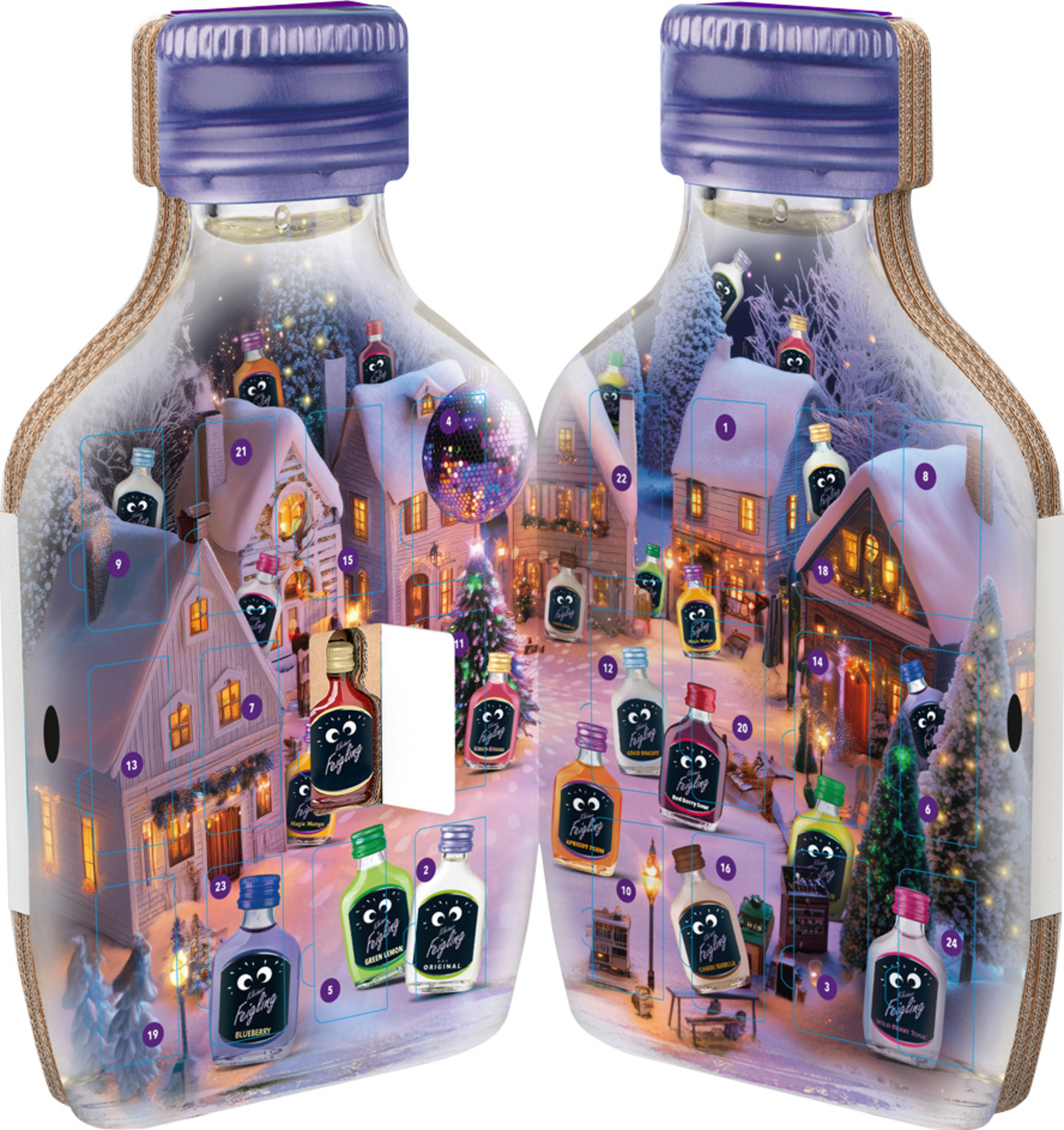 Mit dem Adventskalender zum Aufklappen startet bei Kleiner Feigling die große Weihnachtsparty schon am 1. Dezember! Das Design in Form einer Kleinen Feigling XXL-Flasche ist ein echter Hingucker und sorgt für 24 Tage ansteckende Vorfreude auf das große Fest! Hinter jedem Türchen steckt eine 0,02l-Flasche Kleiner Feigling, ein bunter Mix aus verschiedenen und zum Teil nur in diesem Adventskalender erhältlichen Sorten mit toller Extra-Überraschung am 06. und 24.12! Auf der Außenseite weihnachtlich geschmückt, geht auf der Innenseite die fröhlichste Weihnachtsparty los!