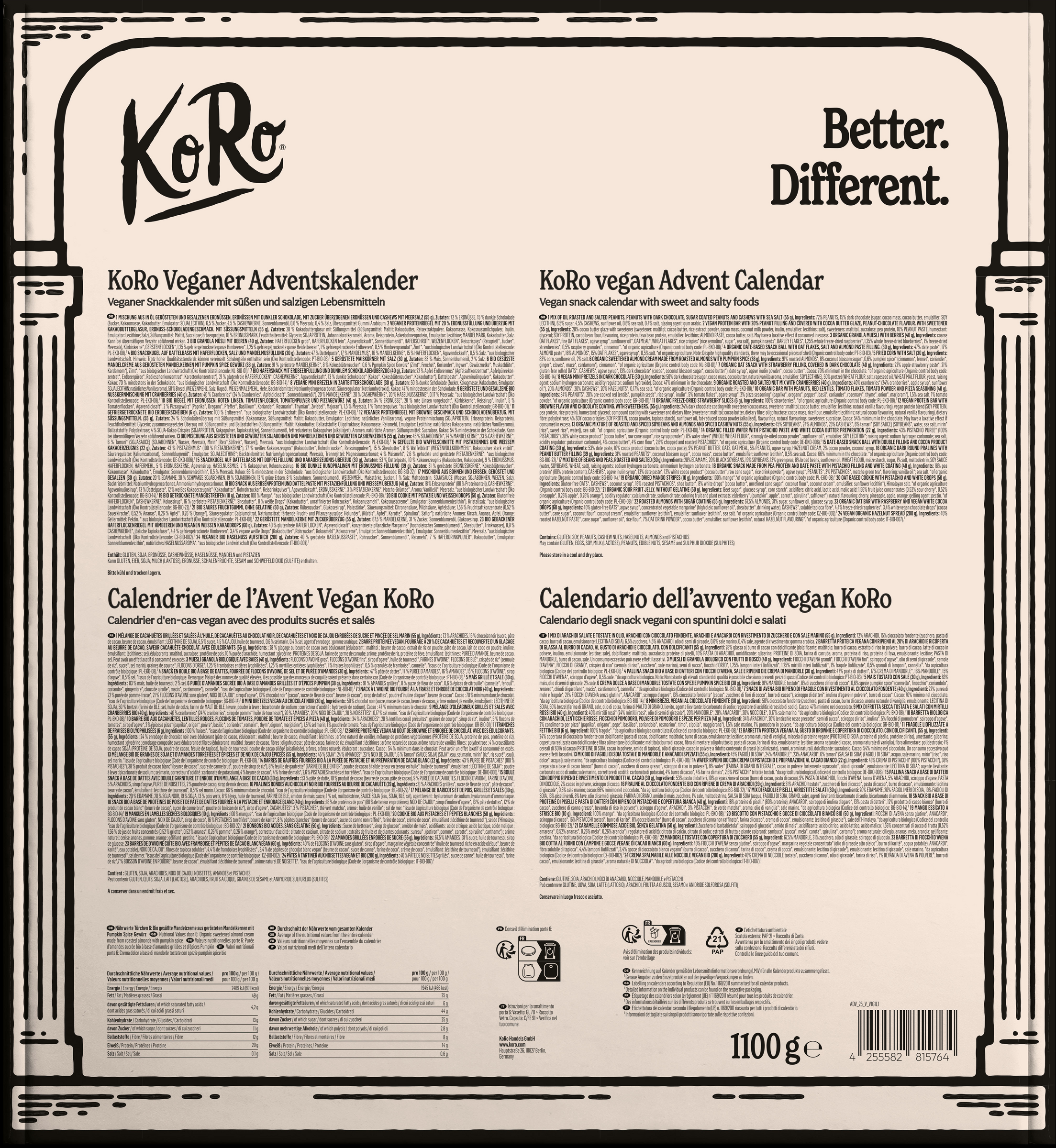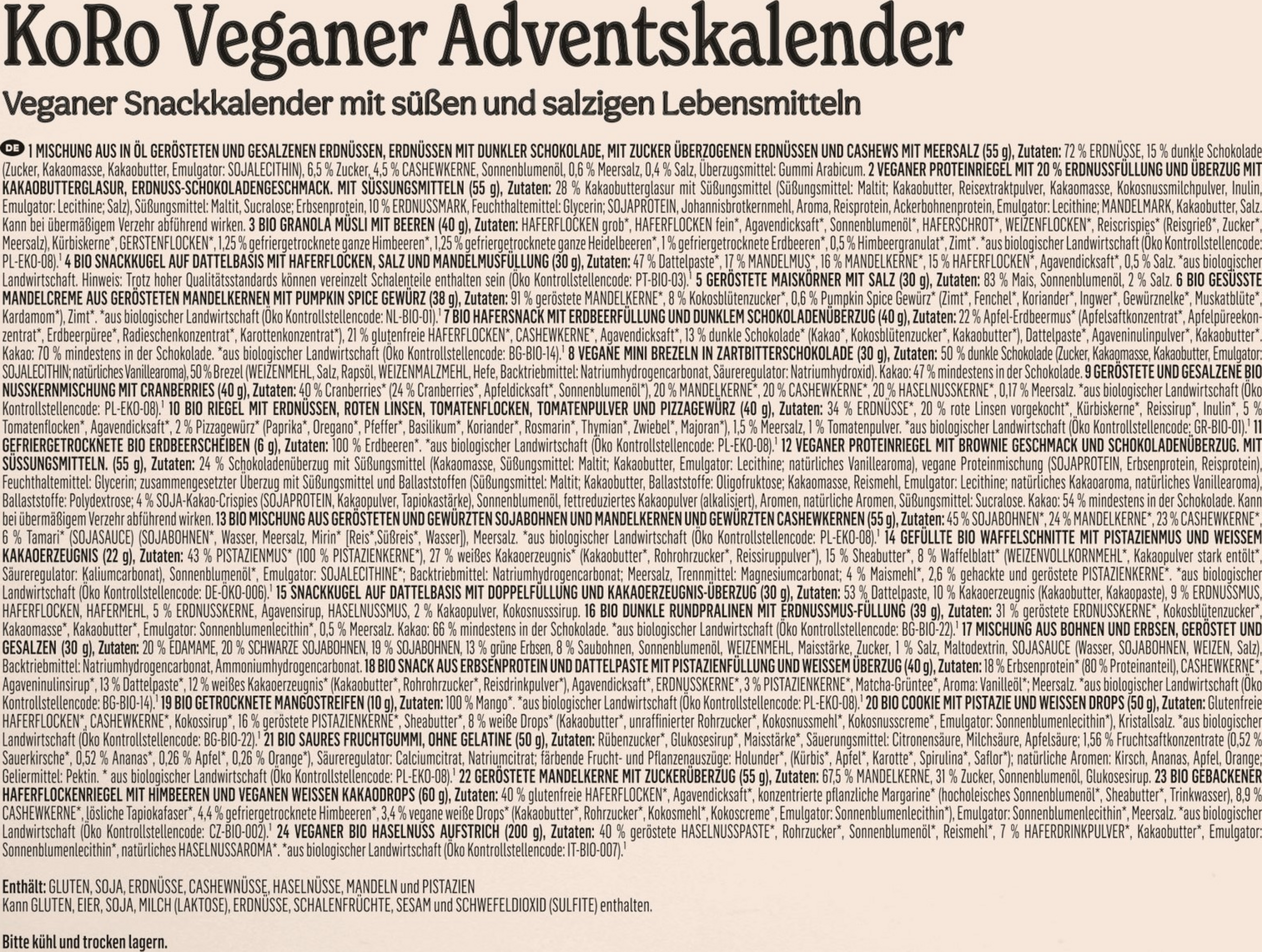Bei KoRos Adventskalender verbirgt sich hinter jedem Türchen eine vegane Leckerei aus dem KoRo-Sortiment. So kannst Du Dich quer durch KoRos Produkte probieren und entdeckst vielleicht noch den ein oder anderen Leckerbissen, den Du bisher noch nicht schnabuliert hast. Damit Dich die Weihnachtszeit nicht kalt erwischt, bestelle lieber gleich KoRos veganen Adventskalender, bevor ihn Dir jemand vor der Nase wegschnappt!