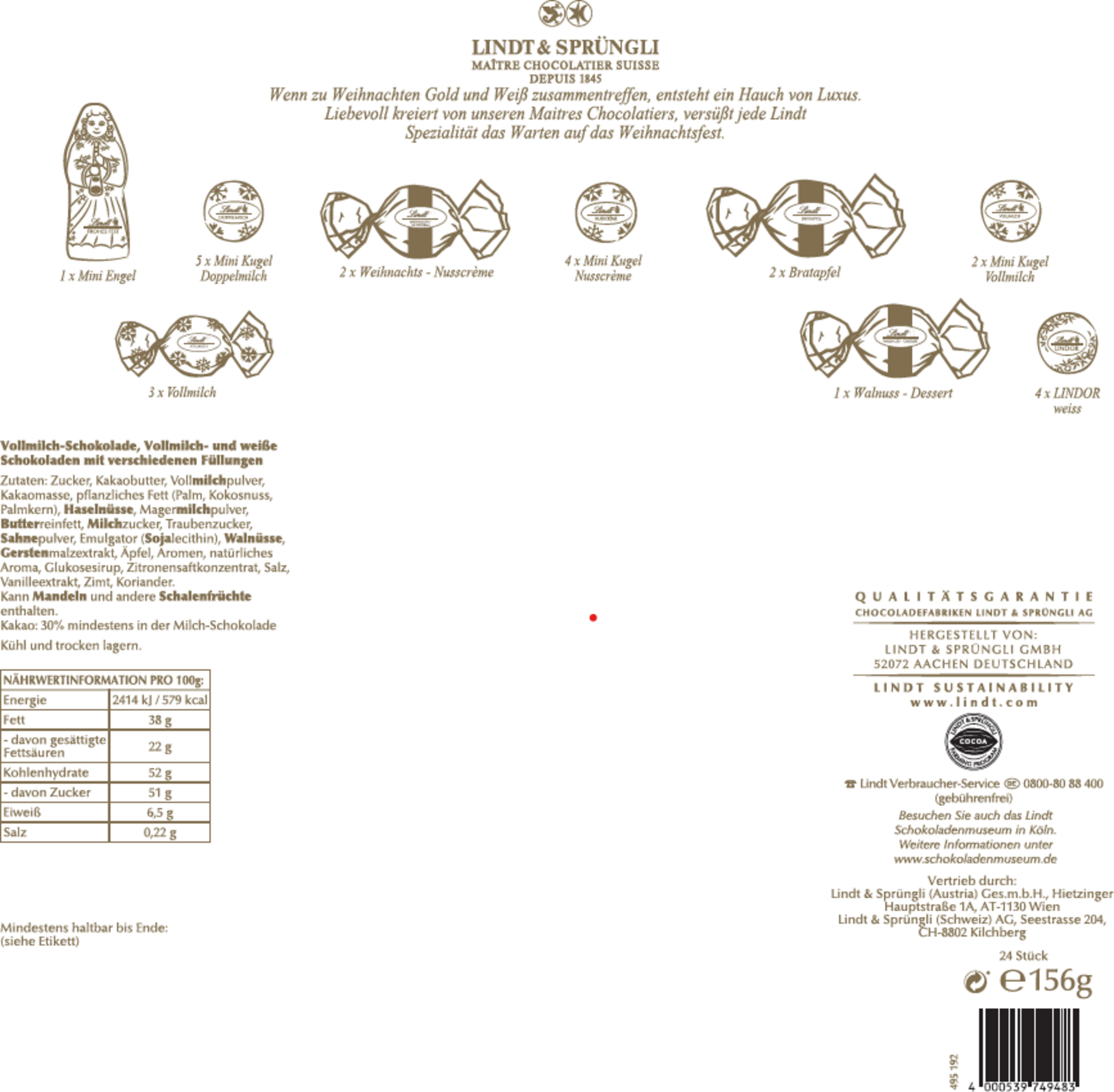 - Sortiment: Mischung aus Alpenmilch, Nusscreme, Double Lait, Bratapfel, Walnuss, Zimt & Koriander, Lindor Weiß