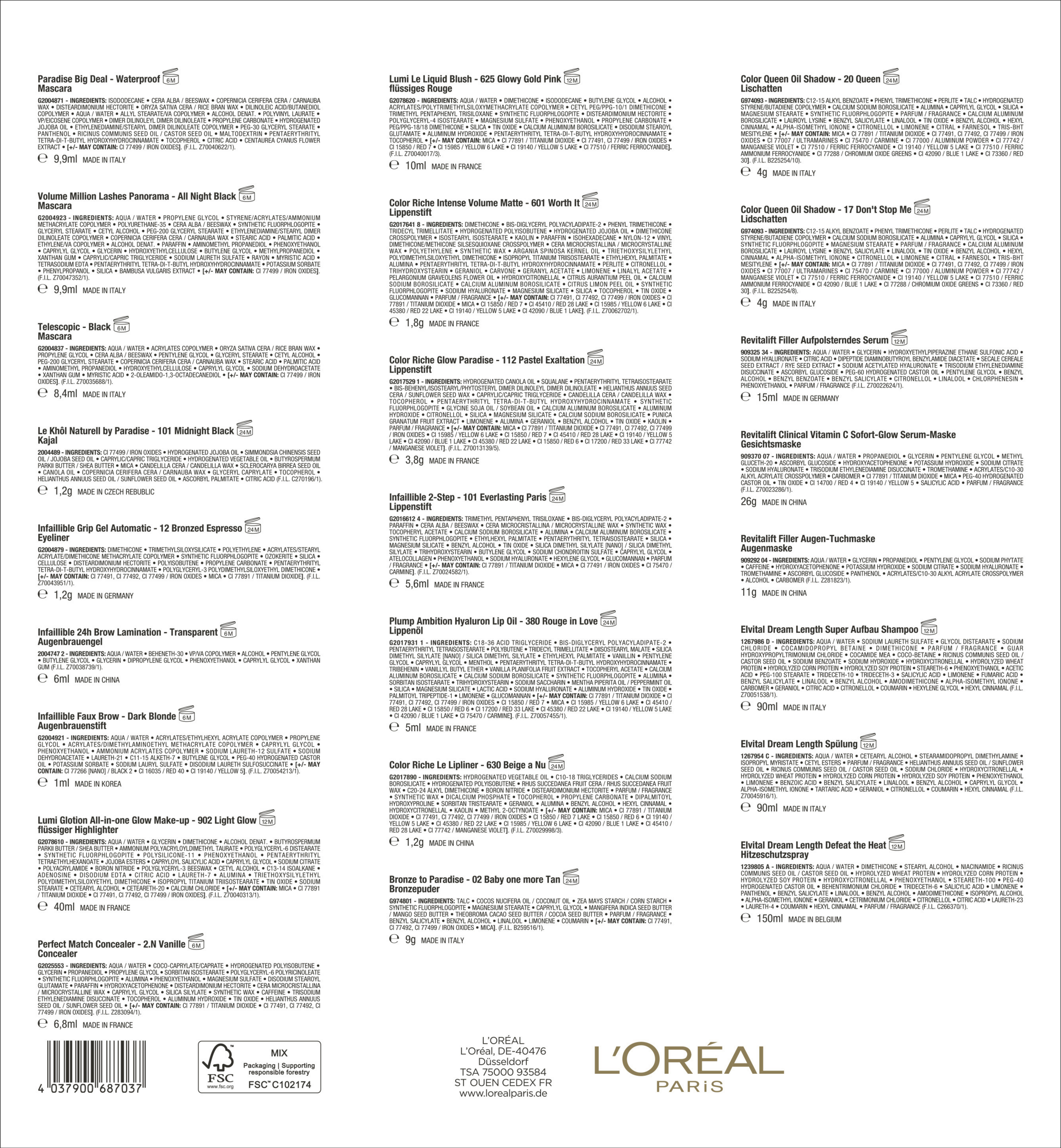 Paradise Big Deal - Waterproof Mascara: ISODODECANE, CERA ALBA / BEESWAX, COPERNICIA CERIFERA CERA / CARNAUBA WAX, DISTEARDIMONIUM HECTORITE, ORYZA SATIVA CERA / RICE BRAN WAX, DILINOLEIC ACID/BUTANEDIOL COPOLYMER, AQUA / WATER, ALLYL STEARATE/VA COPOLYMER, ALCOHOL DENAT., POLYVINYL LAURATE, VP/EICOSENE COPOLYMER, DIMER DILINOLEYL DIMER DILINOLEATE, PROPYLENE CARBONATE, HYDROGENATED JOJOBA OIL, ETHYLENEDIAMINE/STEARYL DIMER DILINOLEATE COPOLYMER, PEG-30 GLYCERYL STEARATE, PANTHENOL, RICINUS COMMUNIS SEED OIL / CASTOR SEED OIL, MALTODEXTRIN, PENTAERYTHRITYL TETRA-DI-T-BUTYL HYDROXYHYDROCINNAMATE, TOCOPHEROL, CITRIC ACID, CENTAUREA CYANUS FLOWER EXTRACT, [+/- MAY CONTAIN: CI 77499 / IRON OXIDES], (F.I.L. Z70040622/1).