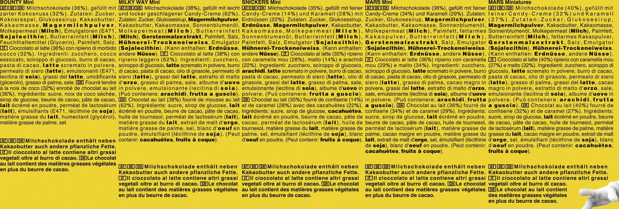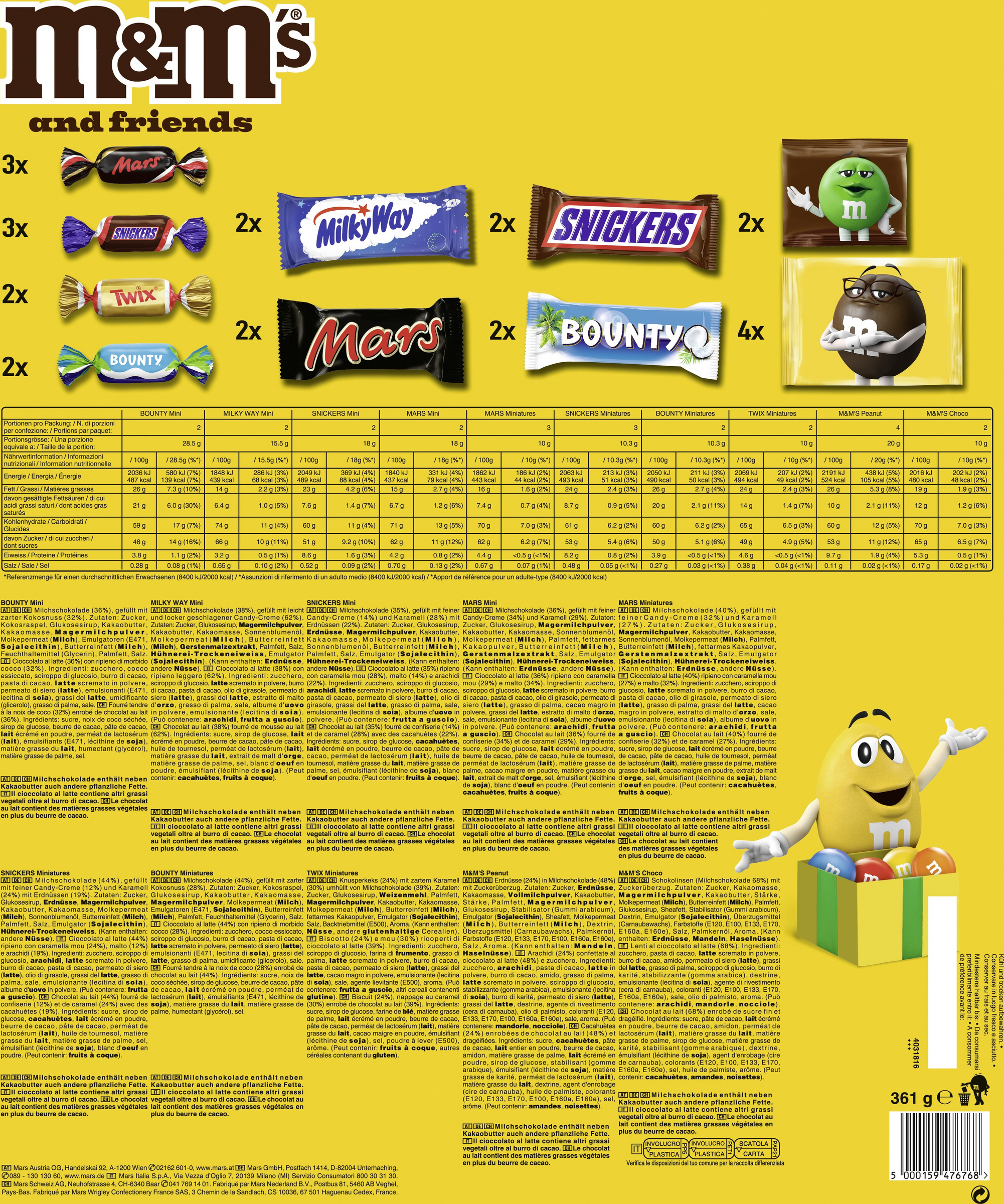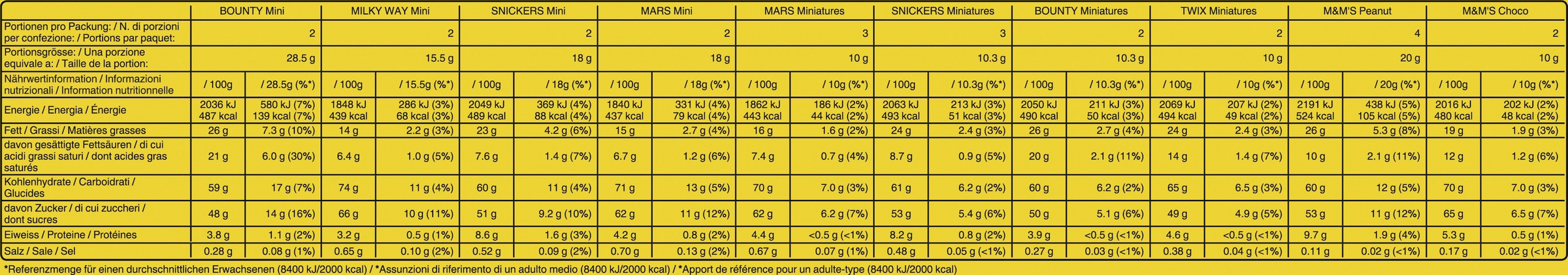 | MILKY WAY Mini - Portionen pro Packung: 2 | SNICKERS Mini - Portionen pro Packung: 2 | MARS Mini - Portionen pro Packung: 2 | MARS Miniatures - Portionen pro Packung: 3 | SNICKERS Miniatures - Portionen pro Packung: 3 | BOUNTY Miniatures - Portionen pro Packung: 2 | TWIX Miniatures - Portionen pro Packung: 2 | M&M'S Peanut - Portionen pro Packung: 4 | M&M'S Choco - Portionen pro Packung: 2 | BOUNTY Mini - Portionen pro Packung: 2 | |||||||||||||||||||||||||||||||