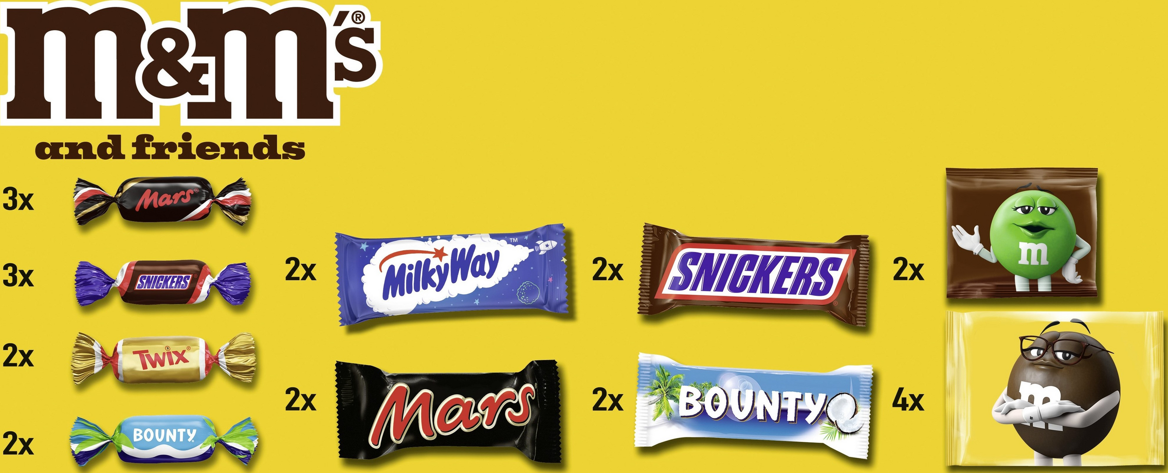 - Inhalt: 24 einzeln verpackte Überraschungen mit M&M’s, Mars, Snickers, Bounty, Twix und Milky Way