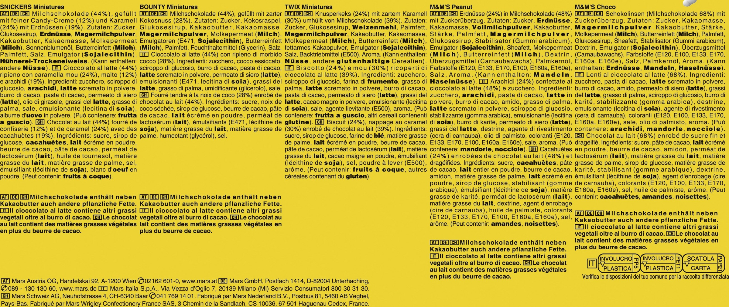 MARS Miniatures: Zucker, Glukosesirup, MAGERMILCHPULVER, Kakaobutter, Kakaomasse, Sonnenblumenöl, Molkepermeat (MILCH), Palmfett, Butterreinfett (MILCH), fettarmes Kakaopulver, GERSTENMALZEXTRAKT, Salz, Emulgator (SOJALECITHIN), HÜHNEREI-TROCKENEIWEISS. (Kann enthalten: ERDNÜSSE, andere NÜSSE).