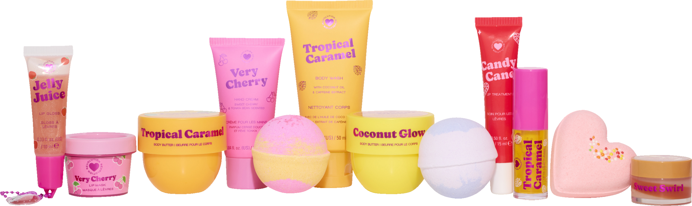 Body Wash – Tropical Caramel Mini: AQUA (WATER, EAU), AMMONIUM LAURYL SULFATE, COCAMIDE MEA, GLYCOL DISTEARATE, HYDROXYETHYLCELLULOSE, PHENOXYETHANOL, PARFUM (FRAGRANCE), COCAMIDOPROPYL BETAINE, PEG-150 DISTEARATE, DISODIUM EDTA, ETHYLHEXYLGLYCERIN, SODIUM CHLORIDE, COCOS NUCIFERA (COCONUT) OIL, CAFFEINE, CYCLODEXTRIN, CITRIC ACID, CI 15510 (ORANGE 4), CI 19140 (YELLOW 5), CI 42090 (BLUE 1), CI 17200 (RED 33), BENZYL SALICYLATE.