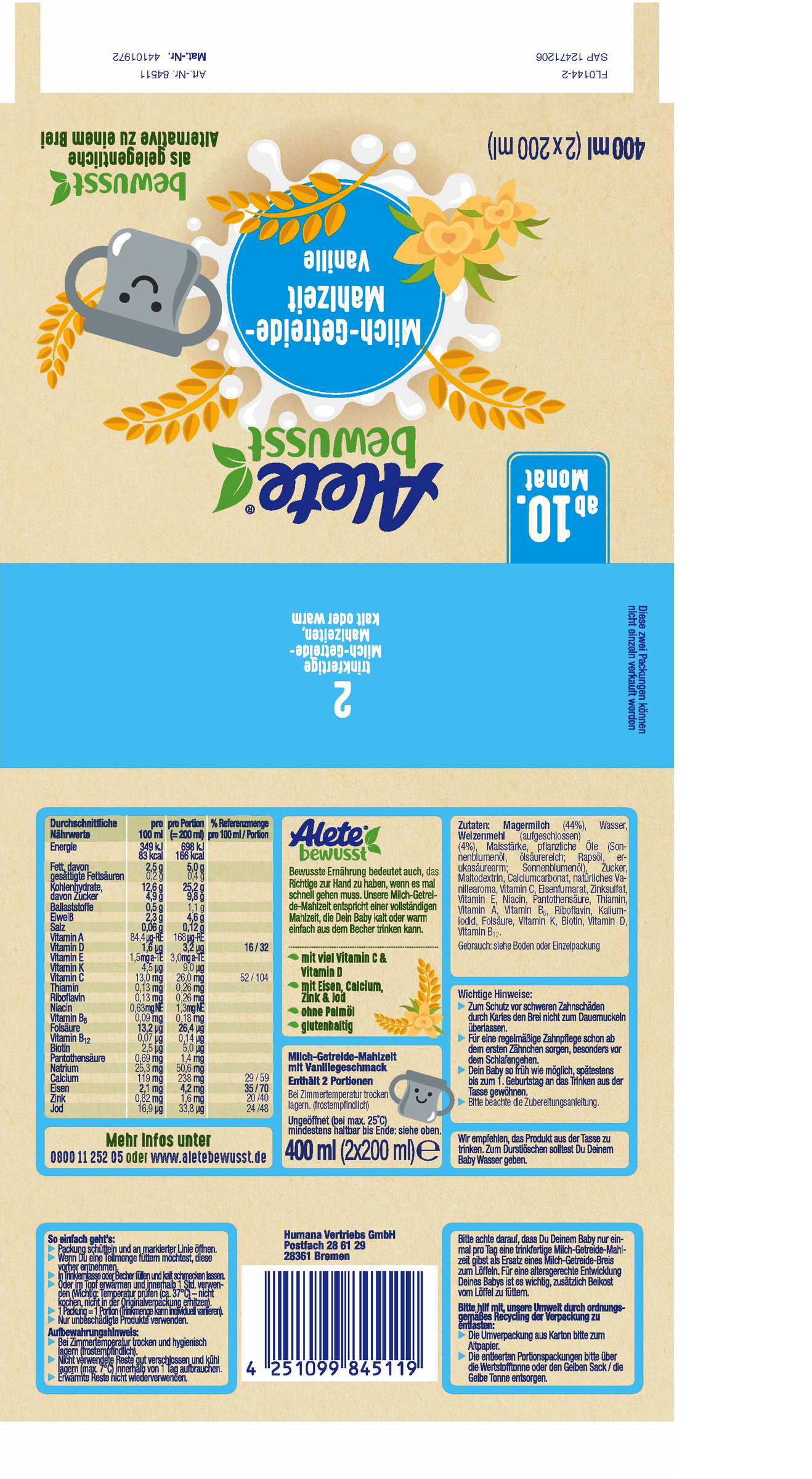 MAGERMILCH (44%), Wasser, WEIZENMENHL (aufgeschlossen) (4%), Maisstärke, pflanzliche Öle (Sonnenblumenöl, ölsäurereich; Rapsöl, erukasäurearm; Sonnenblumenöl), Zucker, Maltodextrin, Calciumcarbonat, natürliches Vanillearoma, Vitamin C, Eisenfumarat, Zinksulfat, Vitamin E, Niacin, Pantothensäure, Thiamin, Vitamin A, Vitamin B6, Riboflavin, Kaliumjodid, Folsäure, Vitamin K, Biotin, Vitamin D, Vitamin B12.
