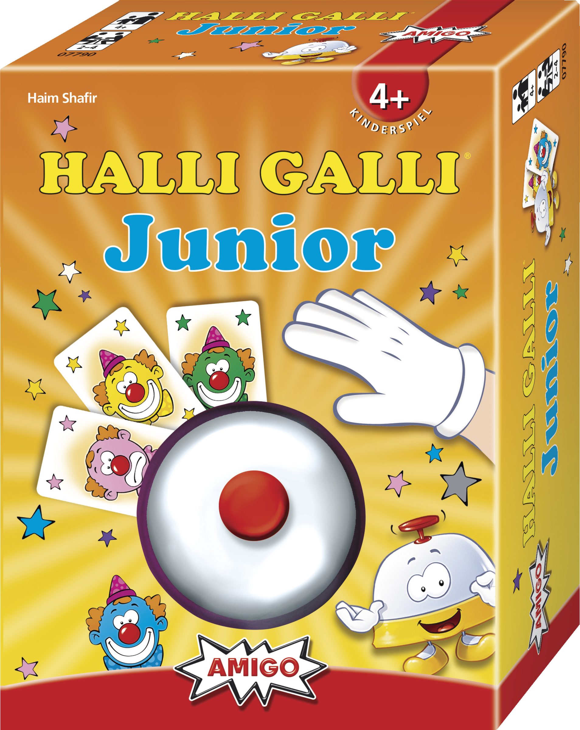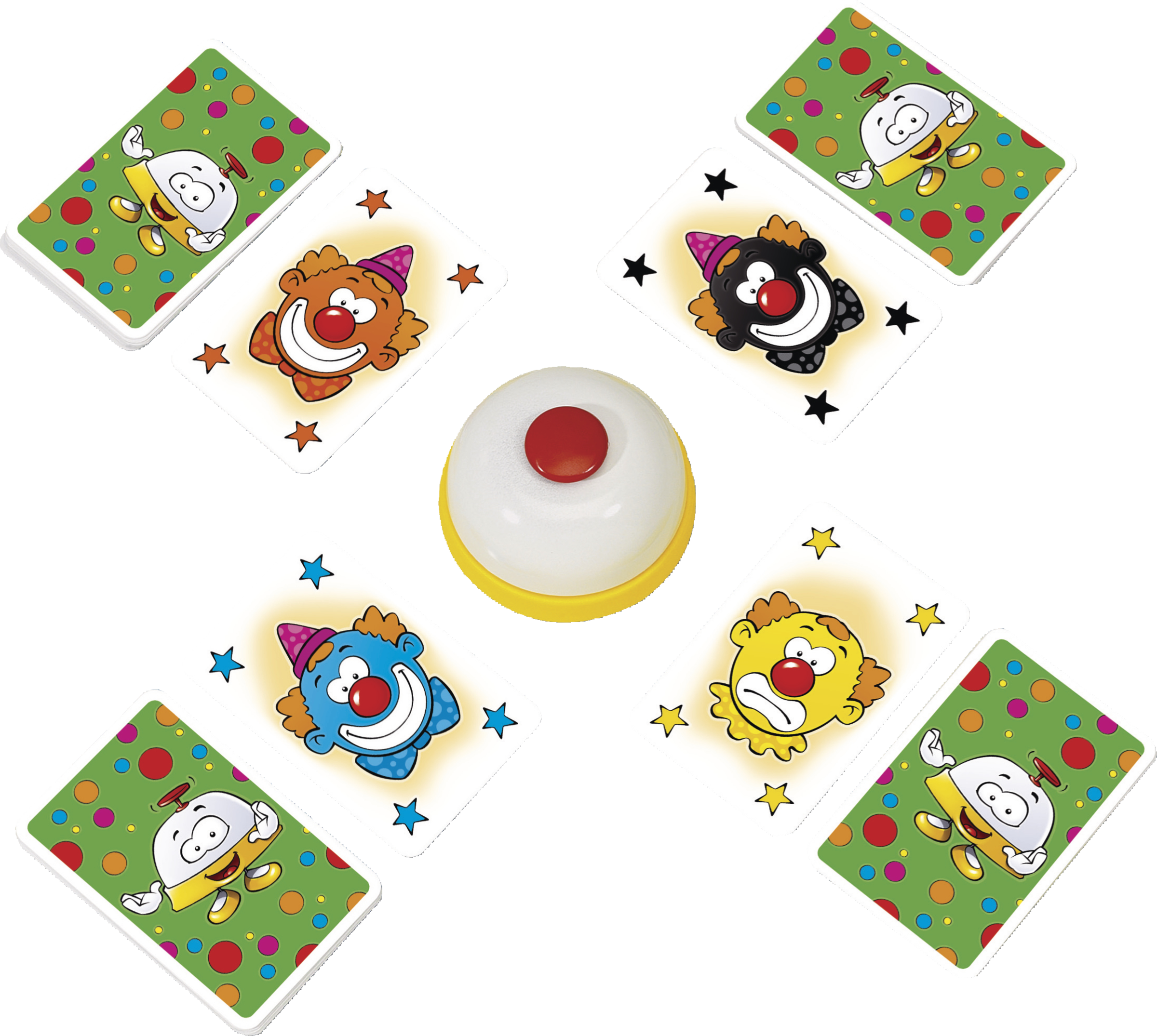 Auf die Glocke - fertig - los! Rote, grüne oder blaue Clowns liegen auf dem Tisch. Immer wenn zwei lachende Clowns derselben Farbe zu sehen sind, musst du blitzschnell klingeln. Der Schnellste erhält alle aufgedeckten Clowns. Bei traurigen Clowns darfst du nicht klingeln, sonst musst du Karten abgeben. Hast du am ende die meisten Clowns, bist du der Gewinner! Der Riesenspaß mit der Glocke von Haim Shafir als Kinderspiel!