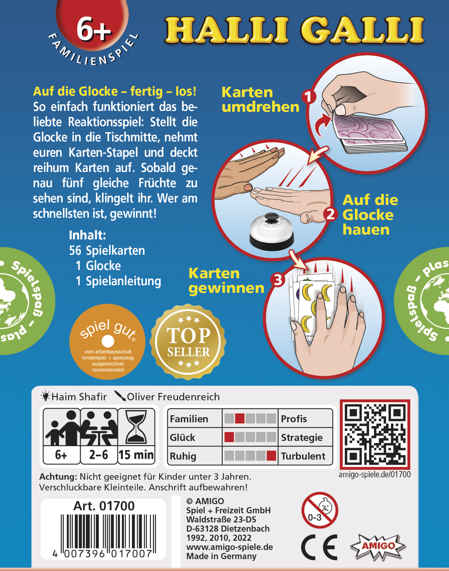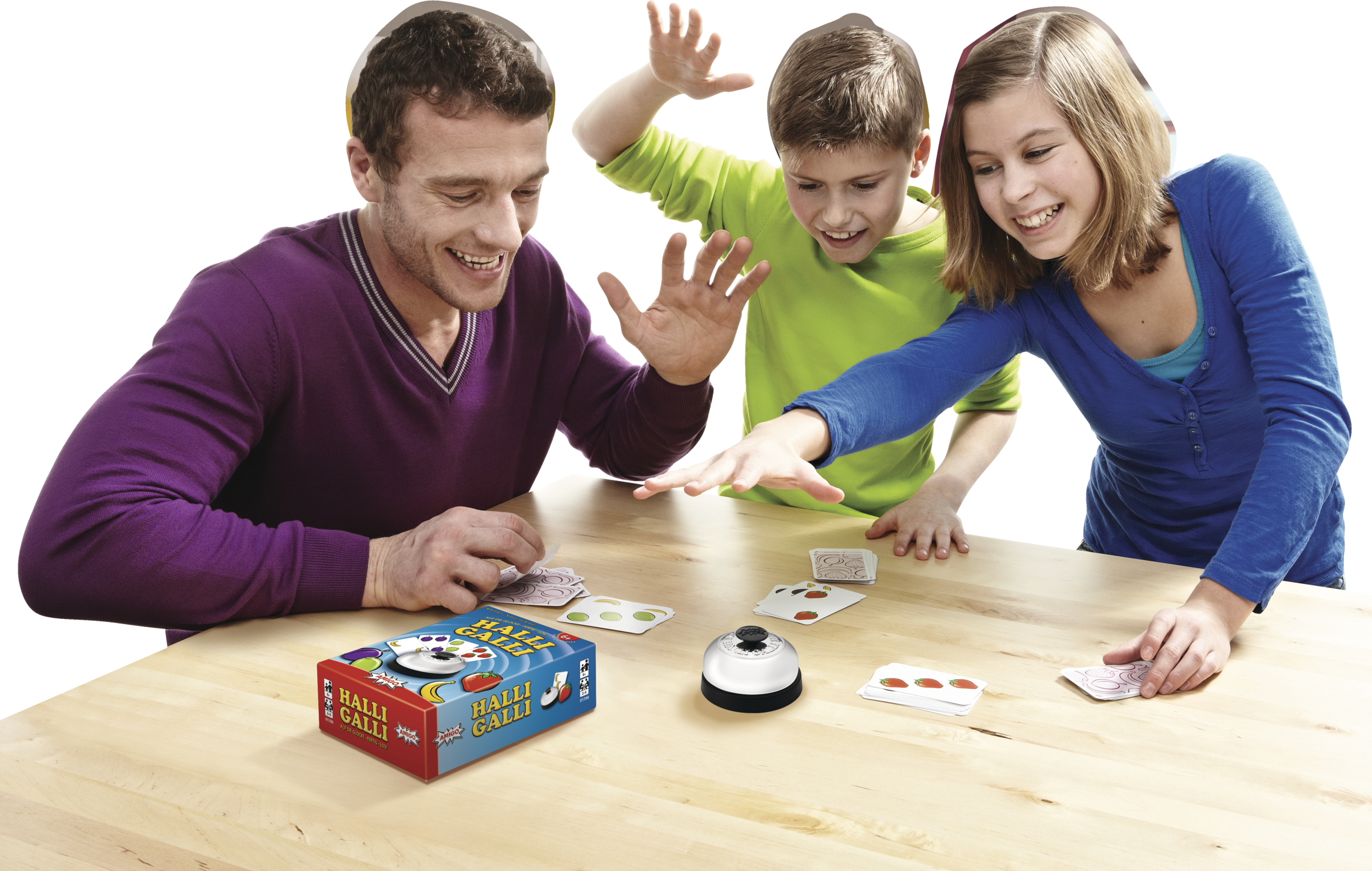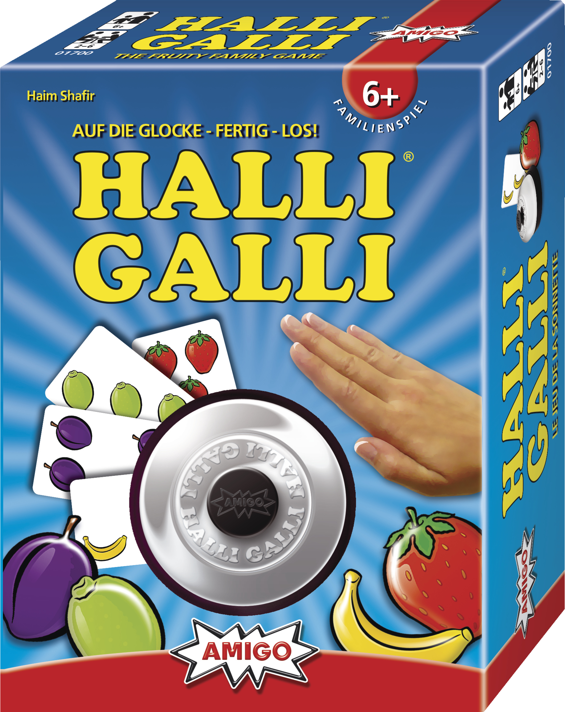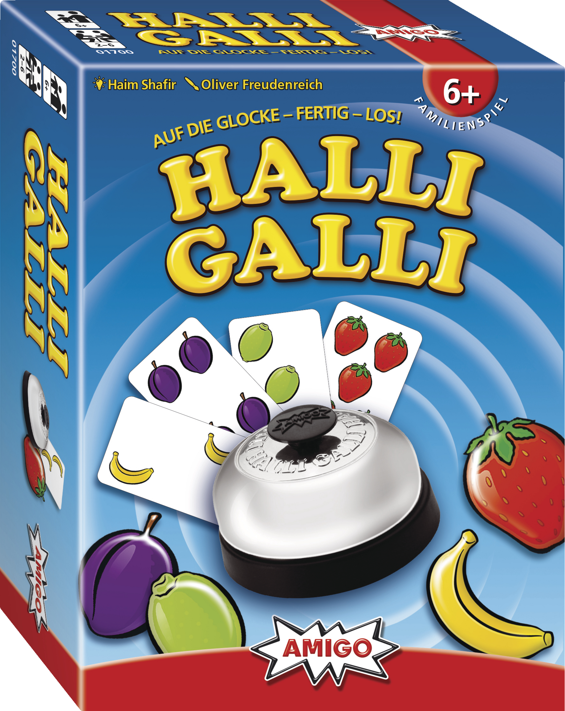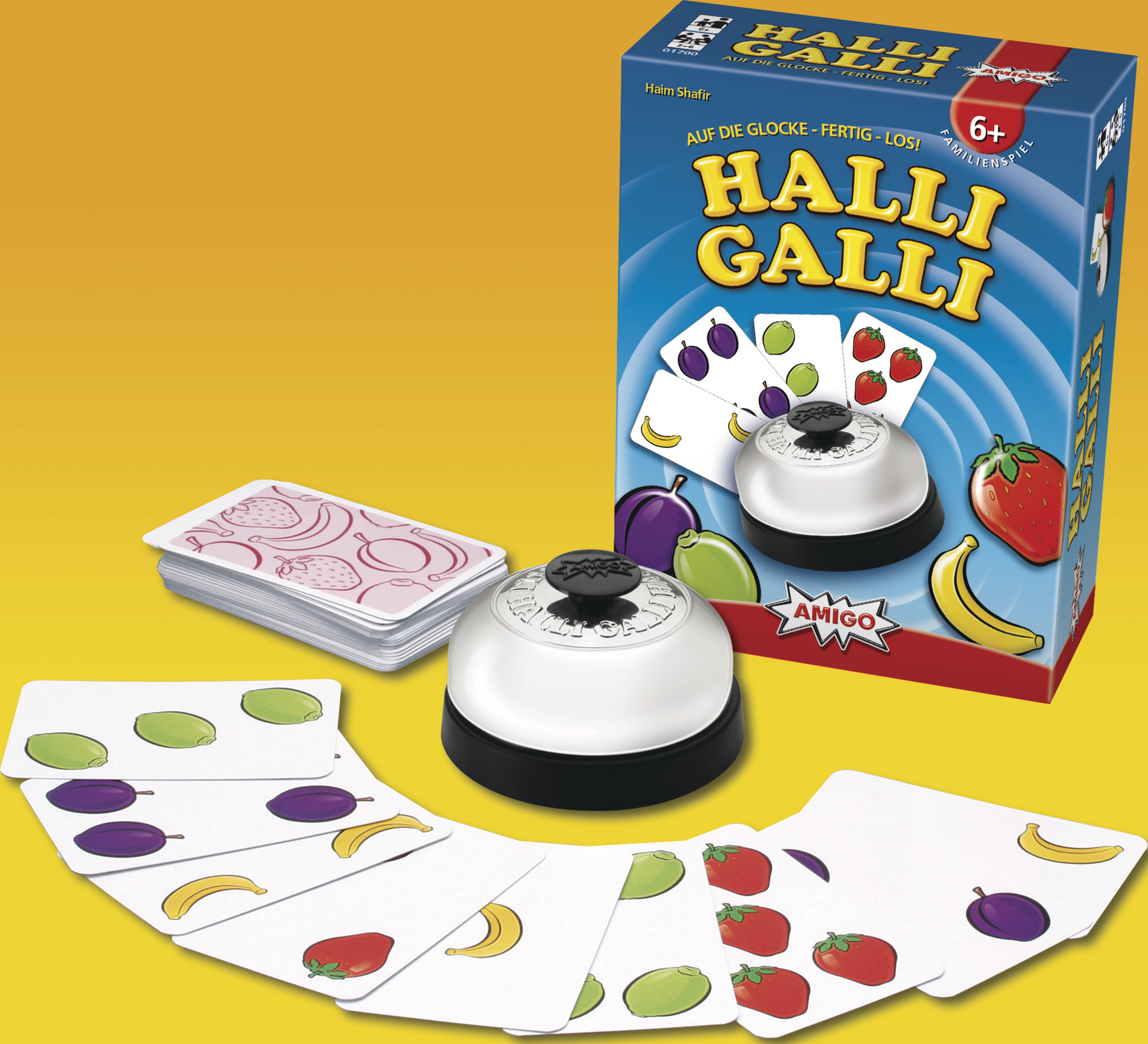 Da haben wir den Salat. Ein großer Obstsalat mit Bananen, Erdbeeren, Limonen und Pflaumen, das ist Halli Galli: Schnelligkeit und ein gutes Auge sind hier Trumpf. Reihum deckt jeder Spieler eine Karte auf. Sobald auf allen offenen Karten zusammen genau fünf Früchte einer Sorte liegen, gewinnt der Spieler, der zuerst klingelt, alle offenliegenden Ablagestapel. Wer am Ende die meisten Karten erklingelt hat, ist Sieger. Halli Galli ist einfach großer Spielspaß für Groß und Klein, setzt auf Reaktionsvermögen und Geschwindigkeit und schult nebenbei noch ein schnelles Auge. Es begeistert mittlerweile seit 25 Jahren Familien und Freunde.