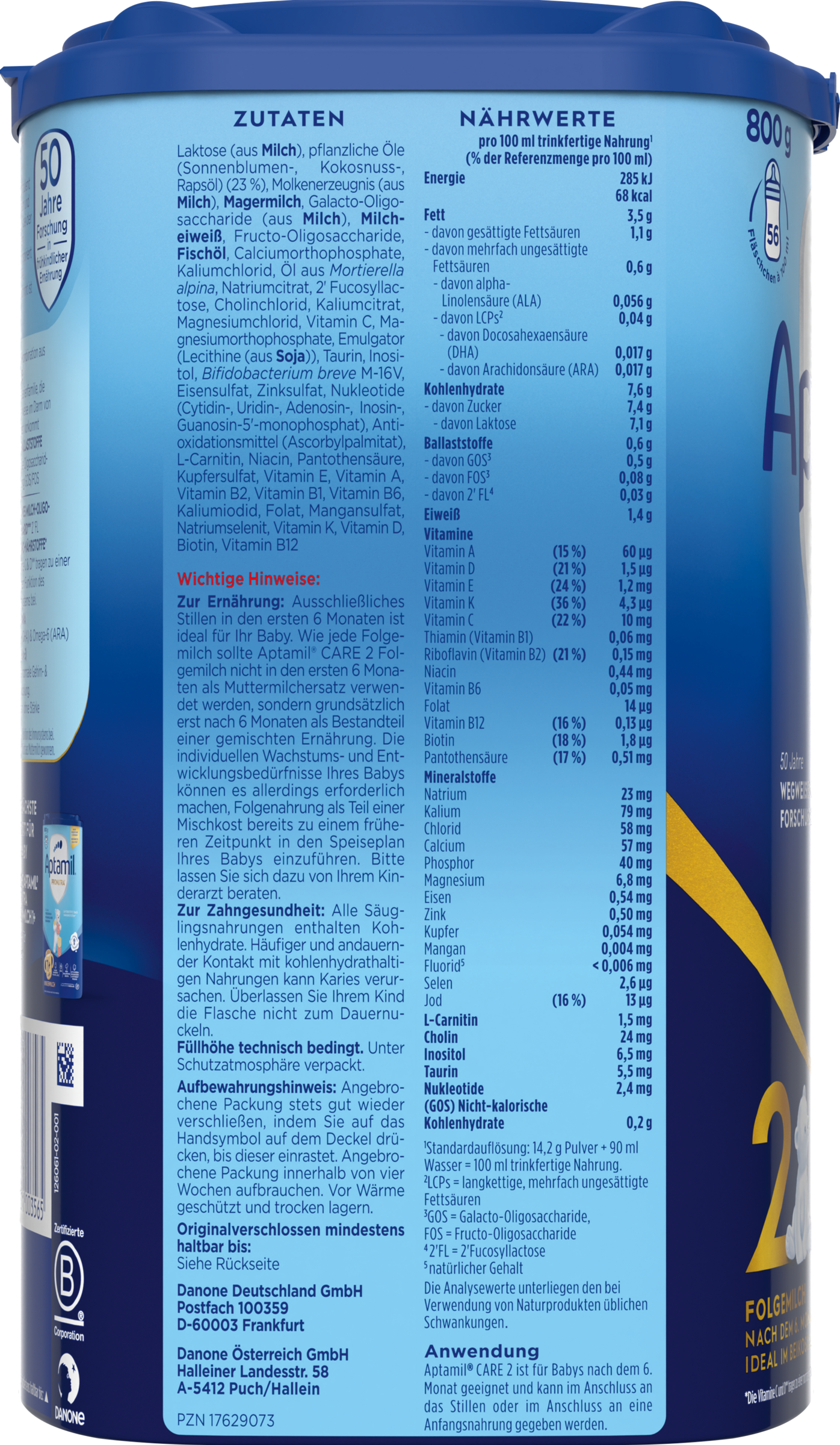 Zur Ernährung: Ausschließliches Stillen in den ersten 6 Monaten ist ideal für Ihr Baby. Wie jede Folgemilch sollte Aptamil CARE 2 Folgemilch nicht in den ersten 6 Monaten als Muttermilchersatz verwendet werden, sondern grundsätzlich erst nach 6 Monaten als Bestandteil einer gemischten Ernährung. Die individuellen Wachstums- und Entwicklungsbedürfnisse Ihres Babys können es allerdings erforderlich machen, Folgenahrungen als Teil einer Mischkost bereits zu einem früheren Zeitpunkt in den Speiseplan Ihres Babys einzuführen. Bitte lassen Sie sich dazu von Ihrem Kinderarzt beraten.