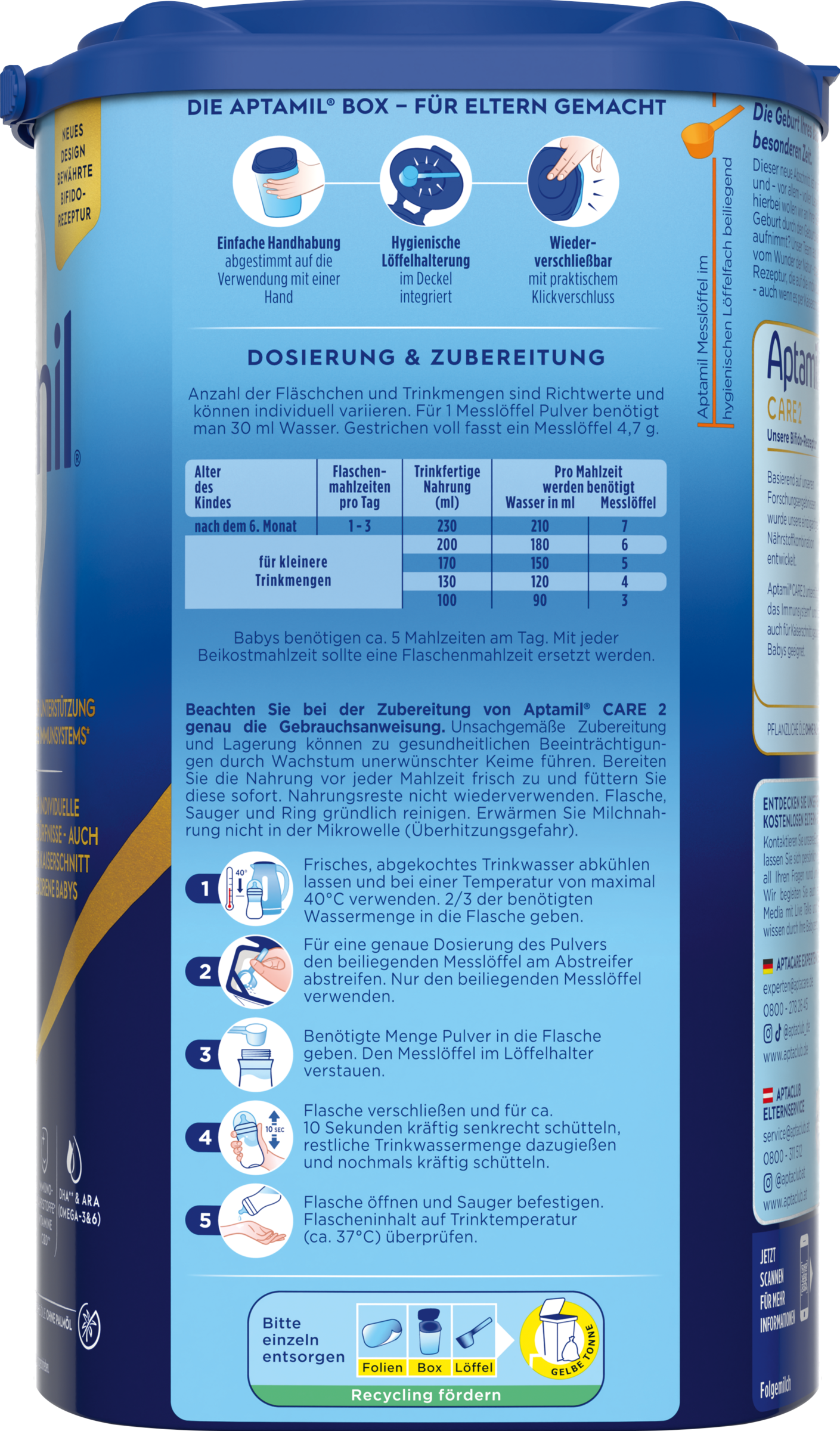 Beachten Sie bei der Zubereitung von Aptamil CARE 2 genau die Gebrauchsanweisung. Unsachgemäße Zubereitung uns Lagerung können zu gesundheitlichen Beeinträchtigungen durch Wachstum unerwünschter Keime führen. Bereiten Sie die Nahrung vor jeder Mahlzeit frisch zu und füttern Sie diese sofort. Nahrungsreste nicht wiederverwenden. Flasche, Sauger und Ring gründlich reinigen. Erwärmen Sie Milchnahrung nicht in der Mikrowelle (Überhitzungsgefahr).