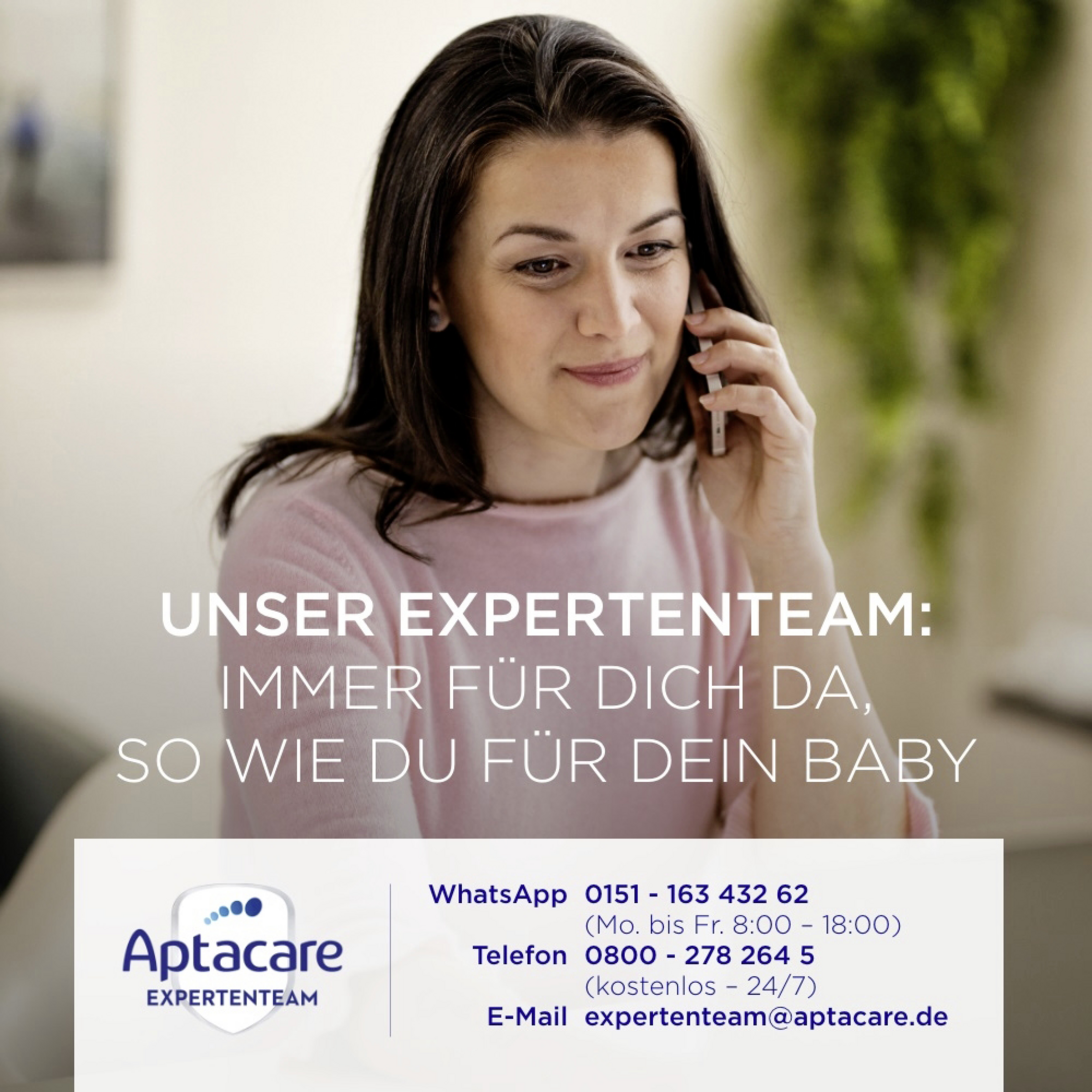 Eure Milchmomente sind so individuell wie ihr. Inspiriert von 50 Jahren Muttermilchforschung bietet Aptamil daher hochwertige Produkte an, die ideal auf eure individuellen Bedürfnisse abgestimmt sind. Darüber hinaus steht euch euer Aptacare Expertenteam persönlich, empathisch und kompetent zur Seite -für all eure Fragen rund um Schwangerschaft, Stillen, die Ernährung eures Babys sowie mit Informationen zu den Produkten - 24/7.