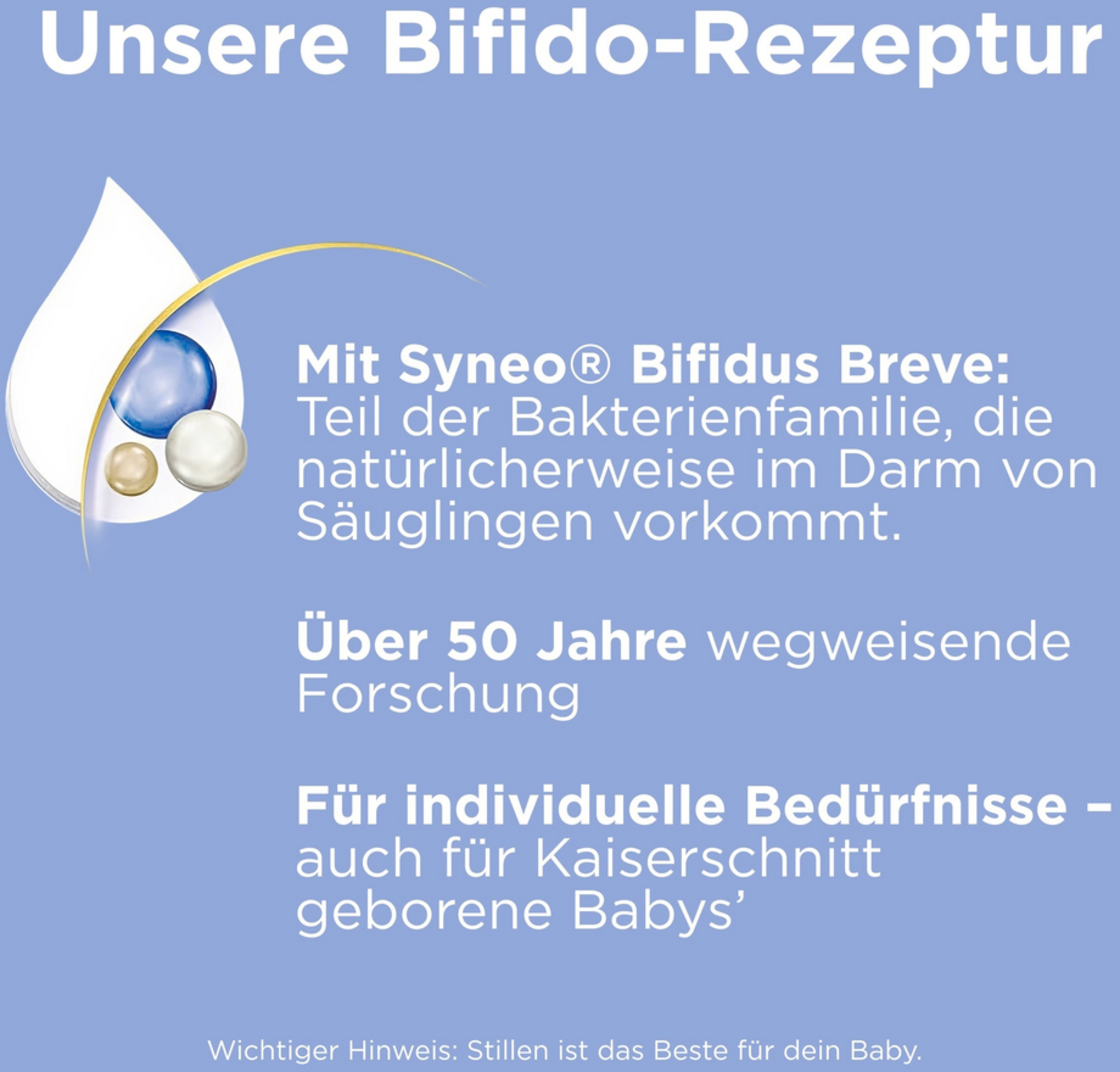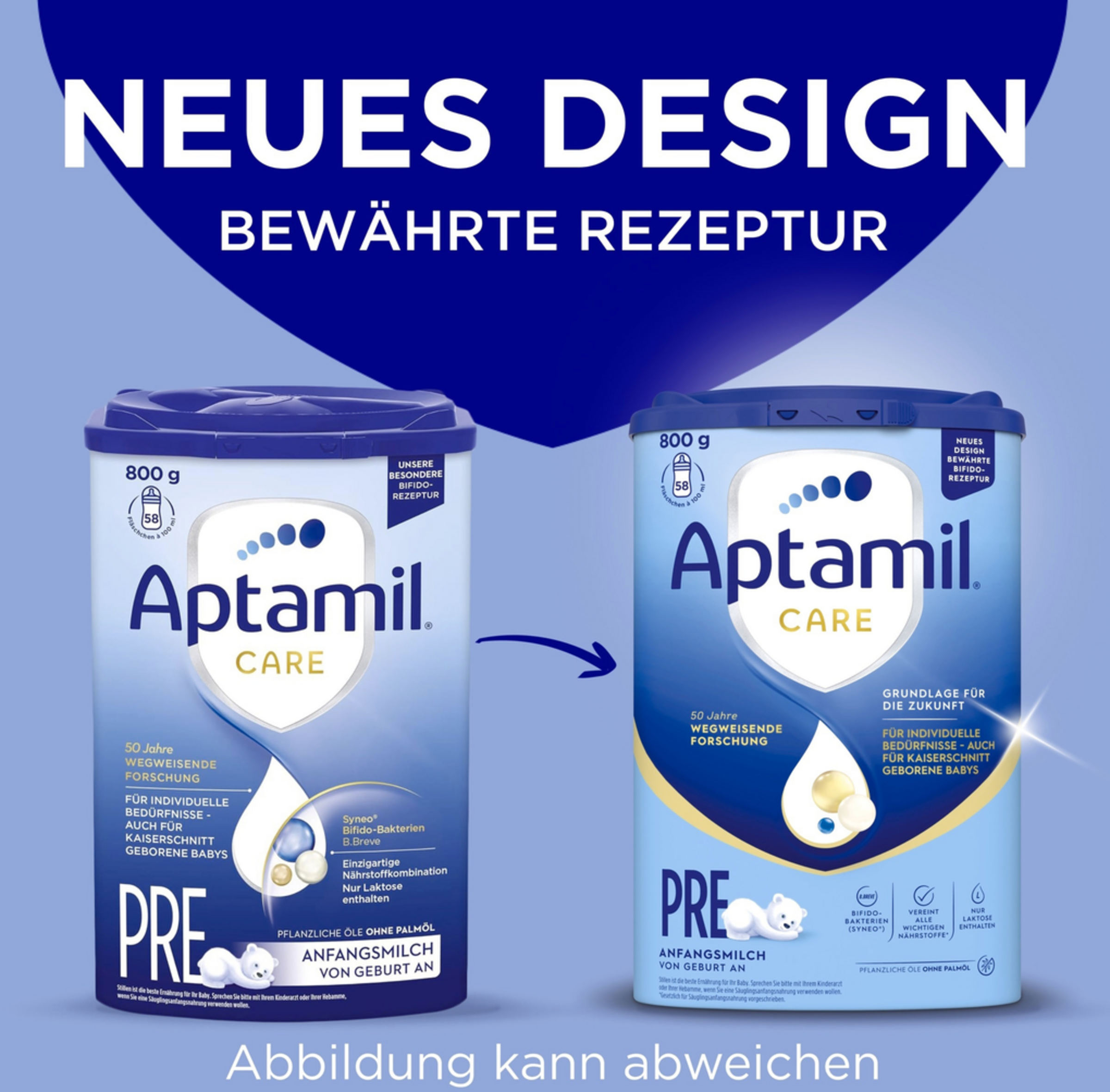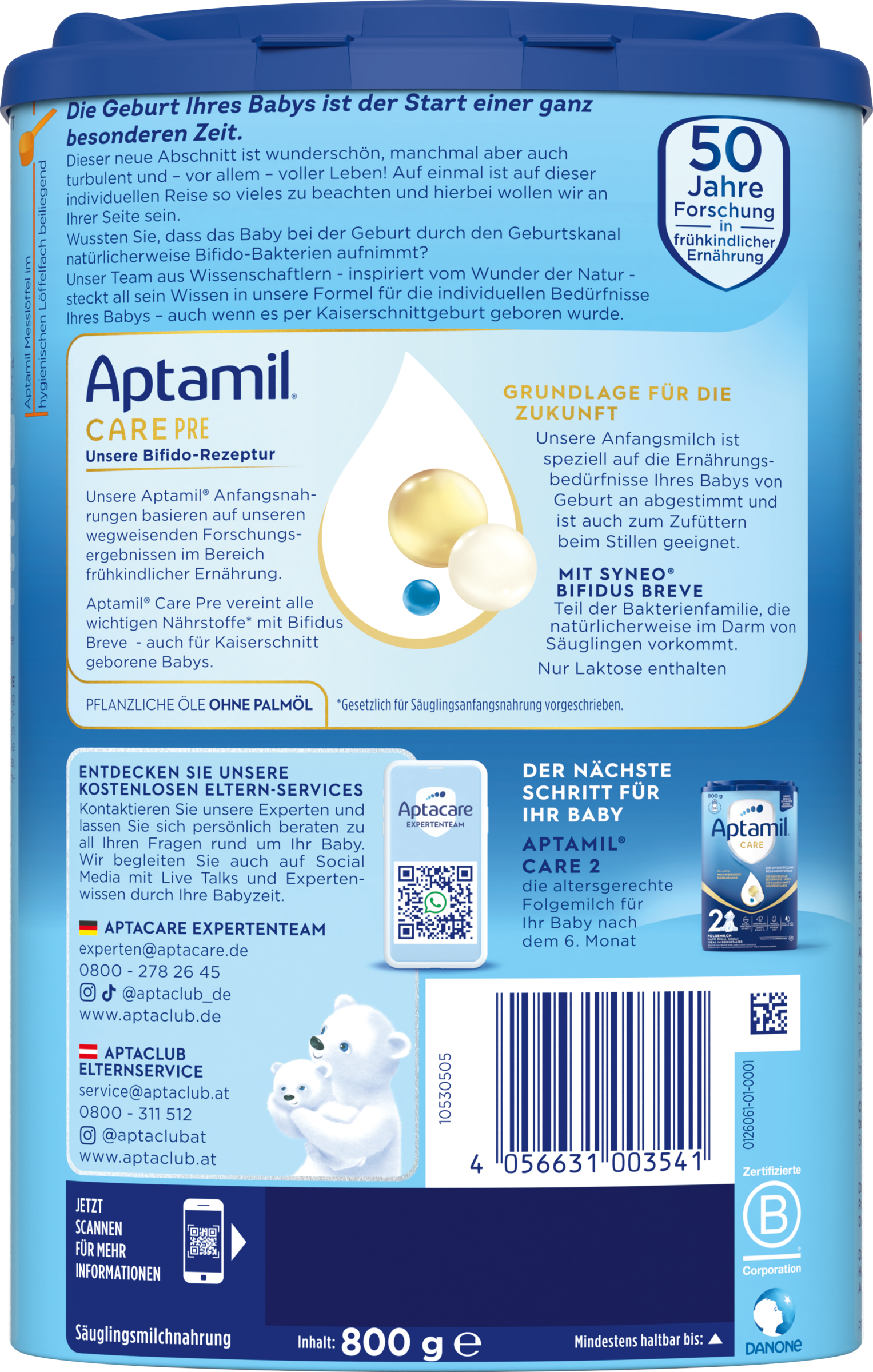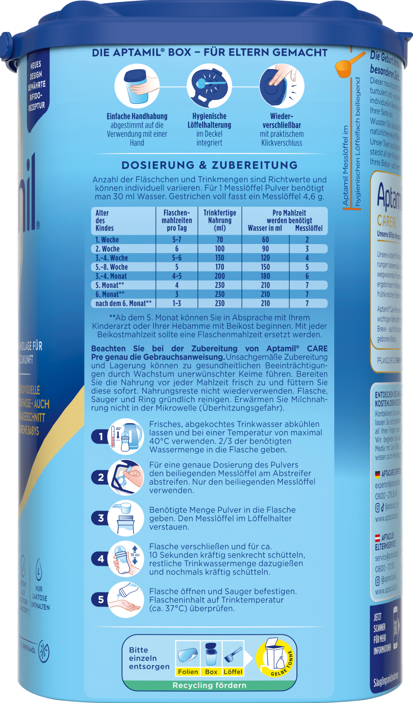 Eure Milchmomente sind so individuell wie ihr. Wie ihr euer Baby ernährt, ist so individuell wie euer Leben. Aptamil®️bietet hochwertige Produkte und Services an, die auf eure individuellen Bedürfnisse abgestimmt sind.Aptamils Wissen basierend auf über 50 Jahren Muttermilchforschung steckt in der Formel für die individuellen Bedürfnisse eures Babys - auch für Kaiserschnitt geborene Babys geeignet. Ihr Wissen, basierend auf 50 Jahren Muttermilchforschung, steckt in der Care Pre-Rezeptur: Hochwertige Inhaltsstoffe kombiniert mit ihrem Fachwissen und in gewohnter Aptamil-Qualität. Aptamil Care Pre enthält den patentierten Syneo Komplex mit Bifidus Breve, Teil einer Bakterienfamilie, die natürlicherweise im Darm von Säuglingen vorkommt und enthält pflanzliche Öle ohne Palmöl.