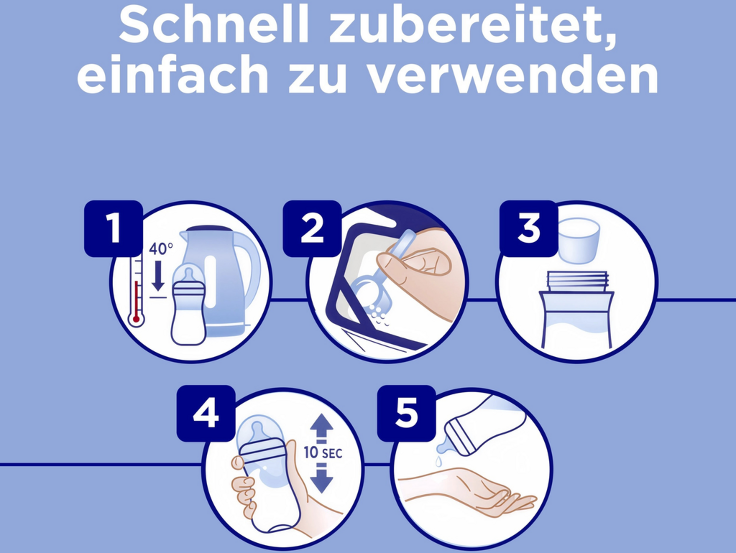 - Frisches, abgekochtes Trinkwasser abkühlen lassen und bei einer Temperatur von maximal 40°C verwenden. 2/3 der benötigten Wassermenge in die Flasche geben.