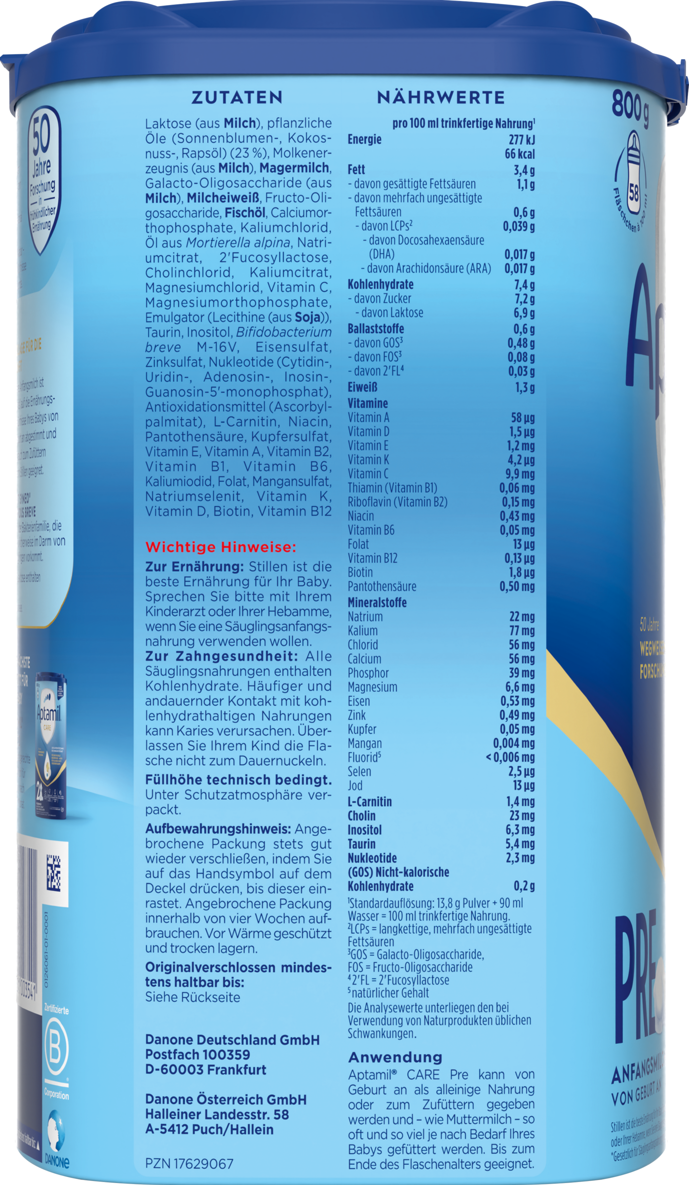 Aptamil CARE Pre kann von Geburt an als alleinige Nahrung oder zum Zufüttern gegeben werden und – wie Muttermilch – so oft und so viel je nach Bedarf Ihres Babys gefüttert werden. Bis zum Ende des Flaschenalters geeignet.