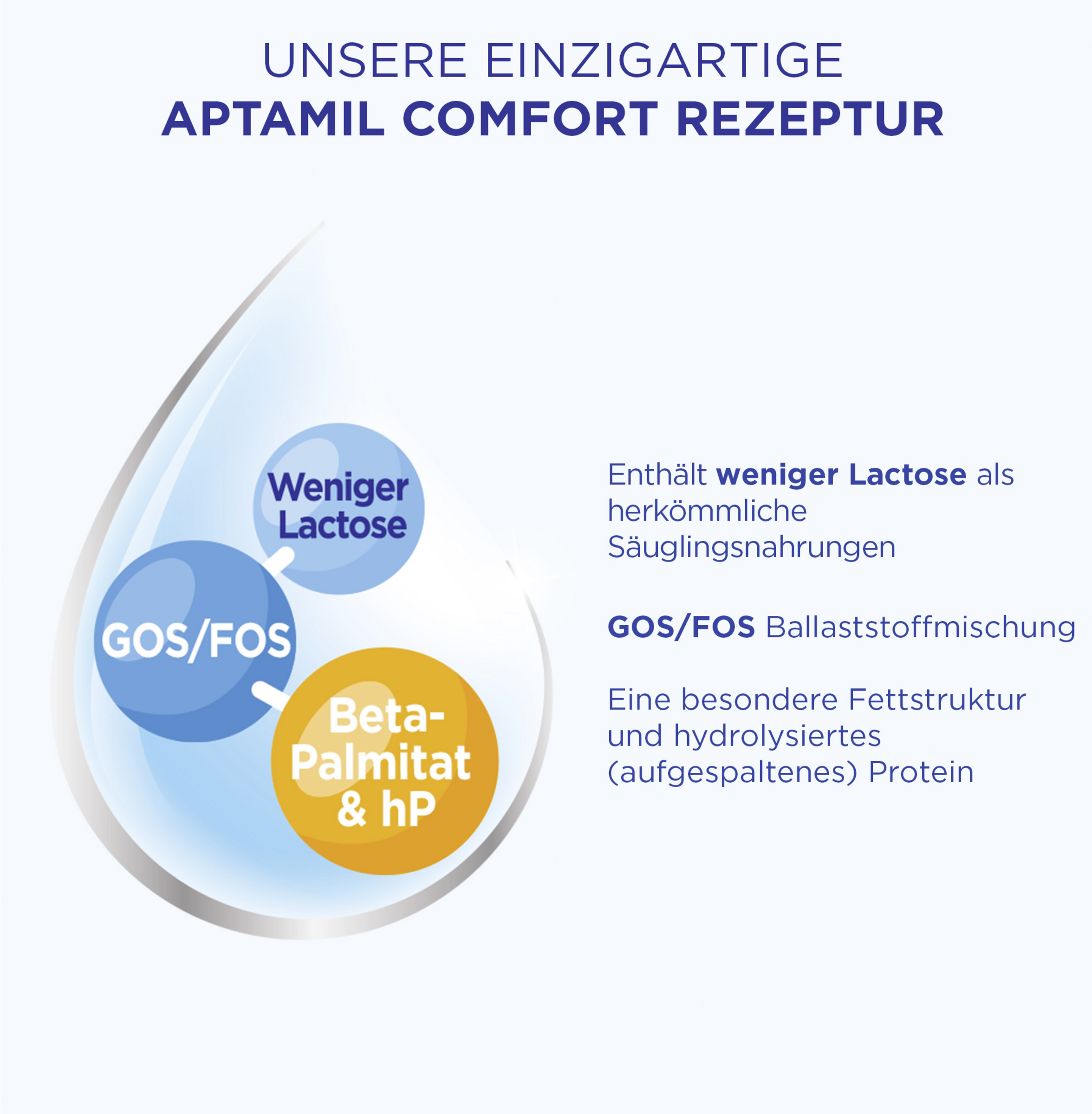 Aptamil COMFORT von Geburt an - Unsere Spezialnahrung bei Verdauungsbeschwerden Unser Aptamil COMFORT von Geburt an, 800g ist geeignet für Babys mit ernährungsbedingten Verdauungsbeschwerden wie Drei-Monats-Koliken, Blähungen und Verstopfung. Die spezielle Rezeptur von Aptamil Comfort enthält GOS/FOS, hydrolysiertes Protein, Beta-Palmitat und weniger Lactose als herkömmliche Nahrungen.