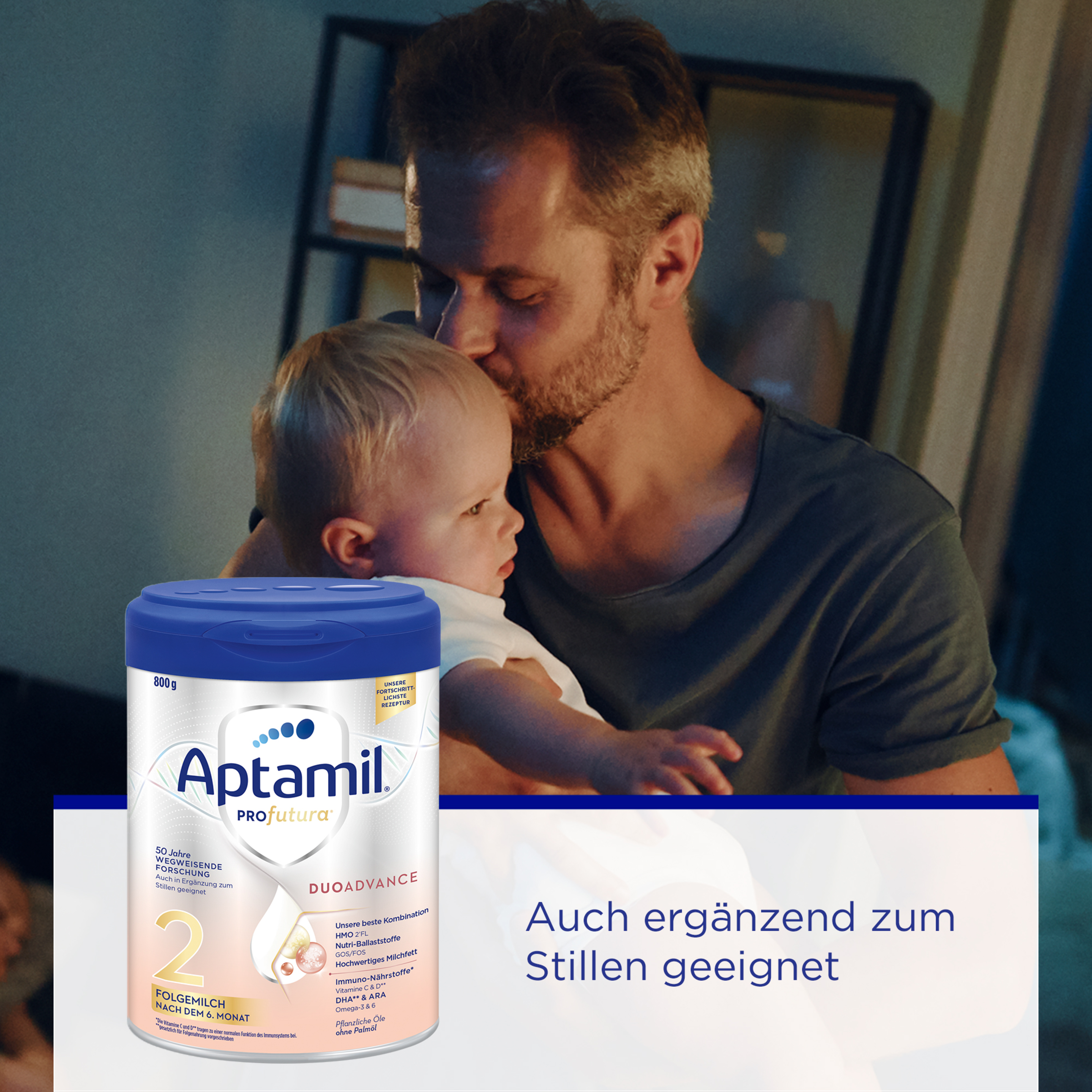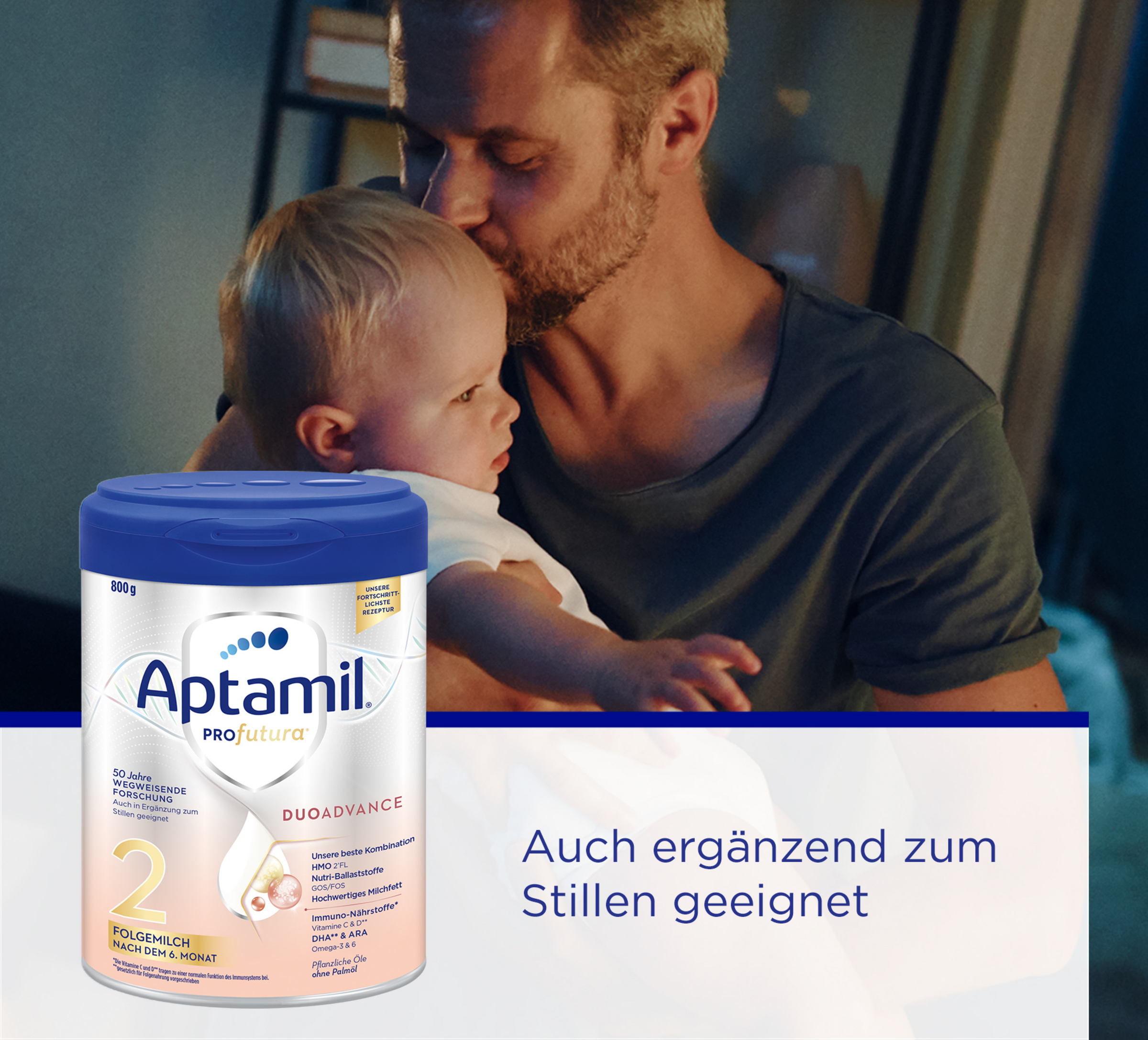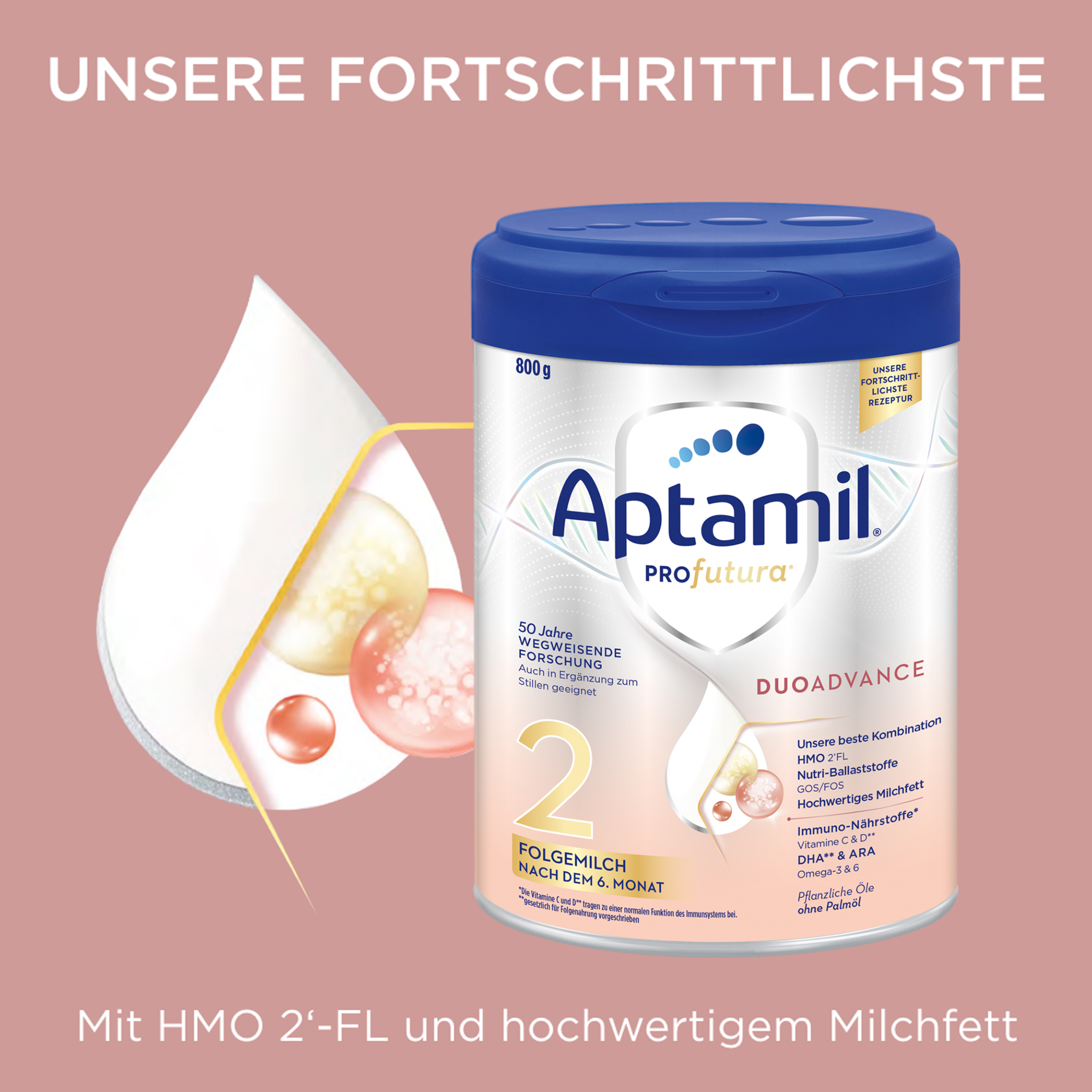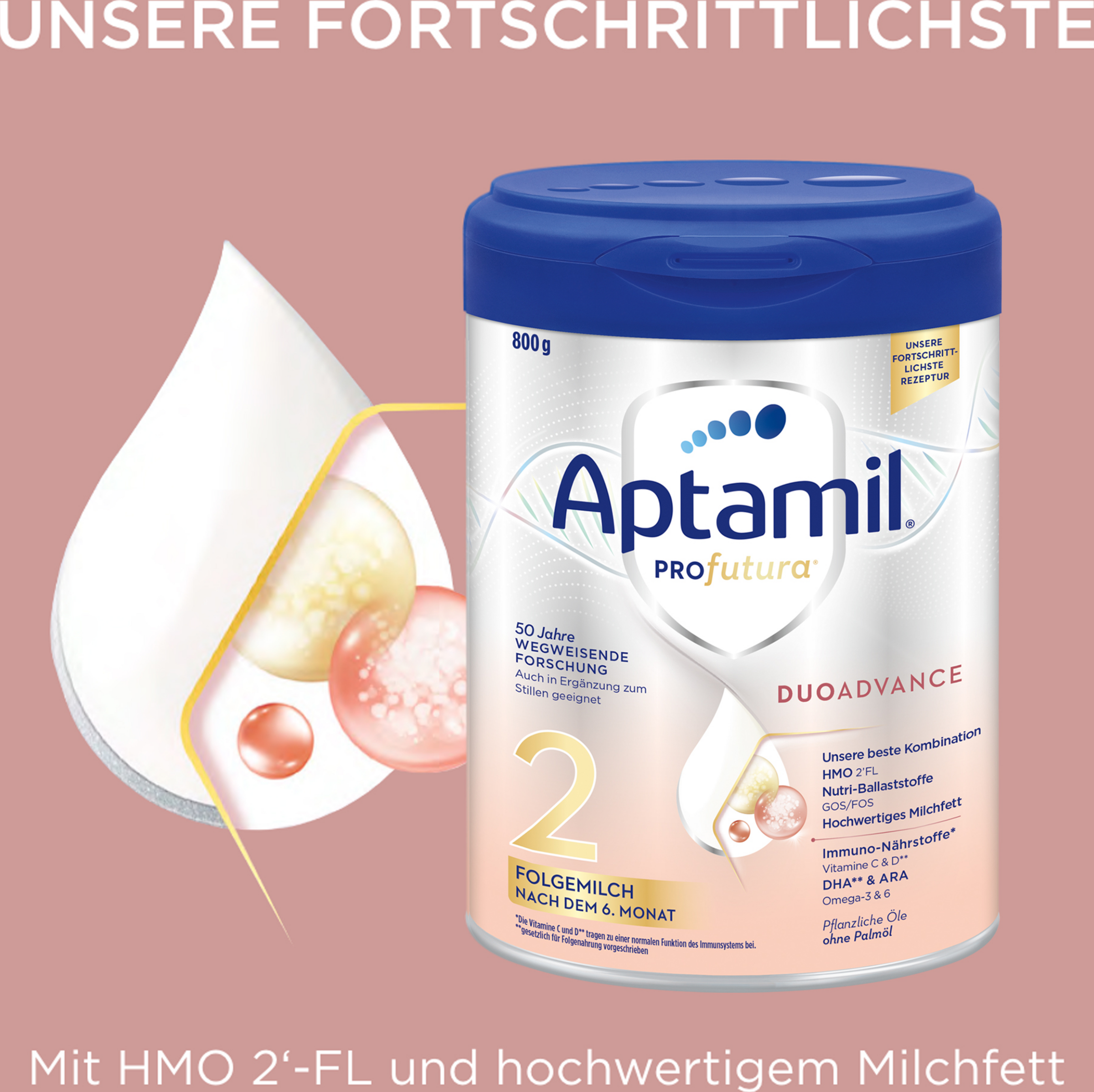 Aptamil PROFUTURA DUOAdvance 2 Folgemilch - Unsere fortschrittlichste Rezeptur, auch ergänzend zum Stillen.Die einzigartige Zusammensetzung von Aptamil PROFUTURA DUOAdvance 2 Folgemilch nach dem 6. Monat, 800g basiert auf 50 Jahren Muttermilchforschung und macht sie zu unserer fortschrittlichsten Rezeptur – geeignet in Kombination mit Muttermilch oder für die Zeit nach dem Stillen. Basierend auf unseren neuesten Forschungsergebnissen zu Muttermilch wurde unsere besondere Zusammensetzung von Aptamil Profutura DUOADVANCE entwickelt: eine innovative Kombination aus hochwertigem Milchfett und dem HMO 2‘-FL - was natürlicherweise in Muttermilch vorkommt*. Somit hat Aptamil Profutura DUOADVANCE den höchsten Oligosaccharid-Gehalt in unserem Aptamil-Portfolio. Aptamil Profutura DUOADVANCE ist auch ergänzend zum Stillen geeignet.