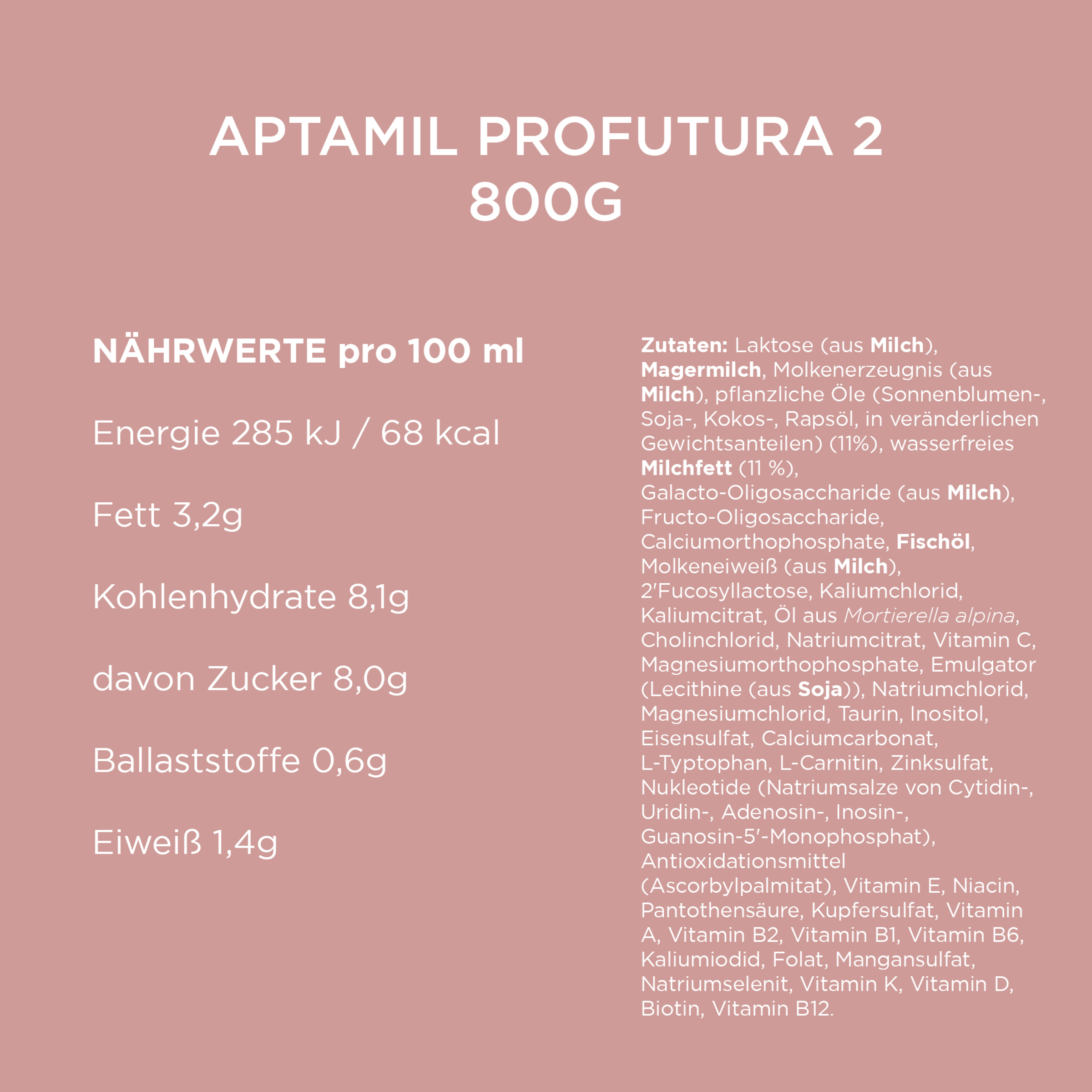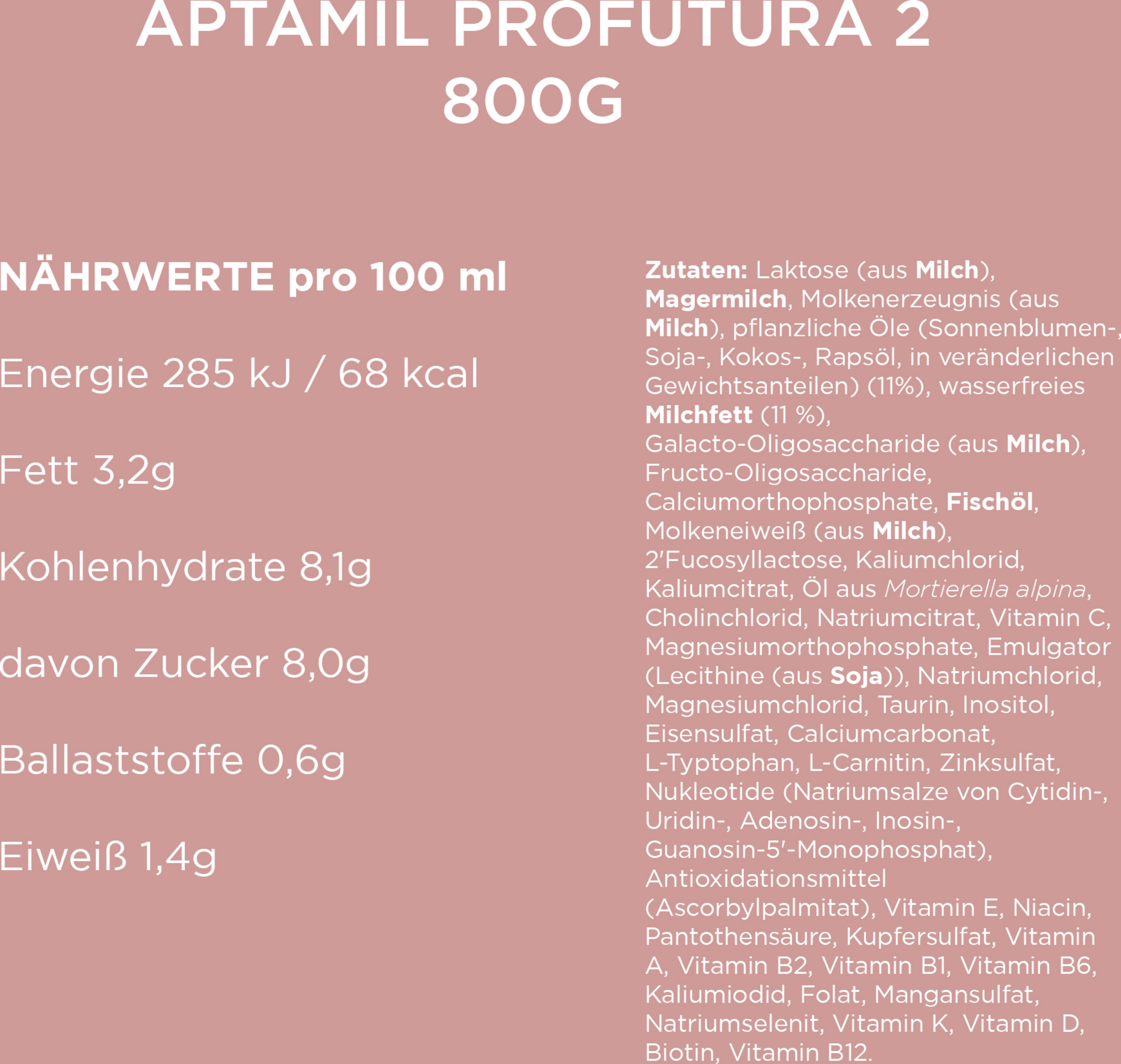 Laktose (aus MILCH), MAGERMILCH, Molkenerzeugnis (aus MILCH), pflanzliche Öle (Raps-, Sonnenblumen-, Kokosnussöl) (11%), MILCHFETT (11%), Galactooligosaccharide (aus MILCH), Fructooligosaccharide, Calciumorthophosphat, FISCHÖL, Molkeneiweiß (aus MILCH), 2’Fucosyllactose, Kaliumchlorid, Kaliumcitrat, Öl aus Mortierella alpina, Cholinchlorid, Natriumcitrat, Vitamin C, Magnesiumorthophosphat, Emulgator (SOJALECITHIN), Natriumchlorid, Magnesiumchlorid, Taurin, Inositol, Eisen-II-Sulfat, Calciumcarbonat, L-Tryptophan, L-Carnitin, Zinksulfat, Nucleotide (Natriumsalze von Cytidin-, Uridin-, Adenosin-, Inosin-, Guanosin-5-Monophosphat), Antioxidationsmittel (Ascorbylpalmitat), Vitamin E, Niacin, Pantothensäure, Kupfersulfat, Vitamin A, Vitamin B2, Vitamin B1, Vitamin B6, Kaliumjodid, Folsäure, Mangan-II-sulfat, Natriumselenit, Vitamin K, Vitamin D, Biotin, Vitamin B12.