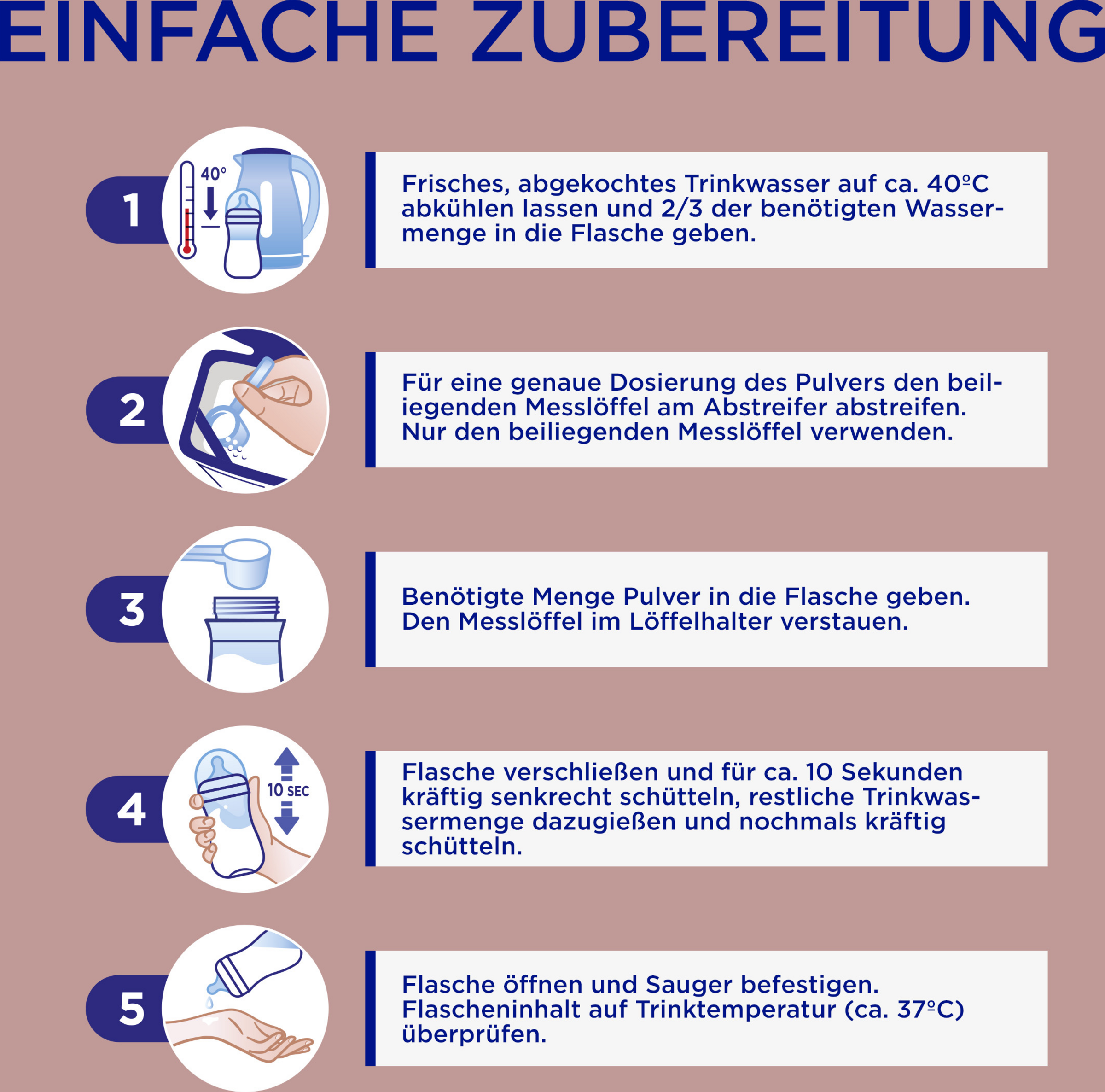 - 1. Frisches, abgekochtes Trinkwasser auf ca. 40°C abkühlen lassen und 2/3 der benötigten Wassermenge in die Flasche geben.
