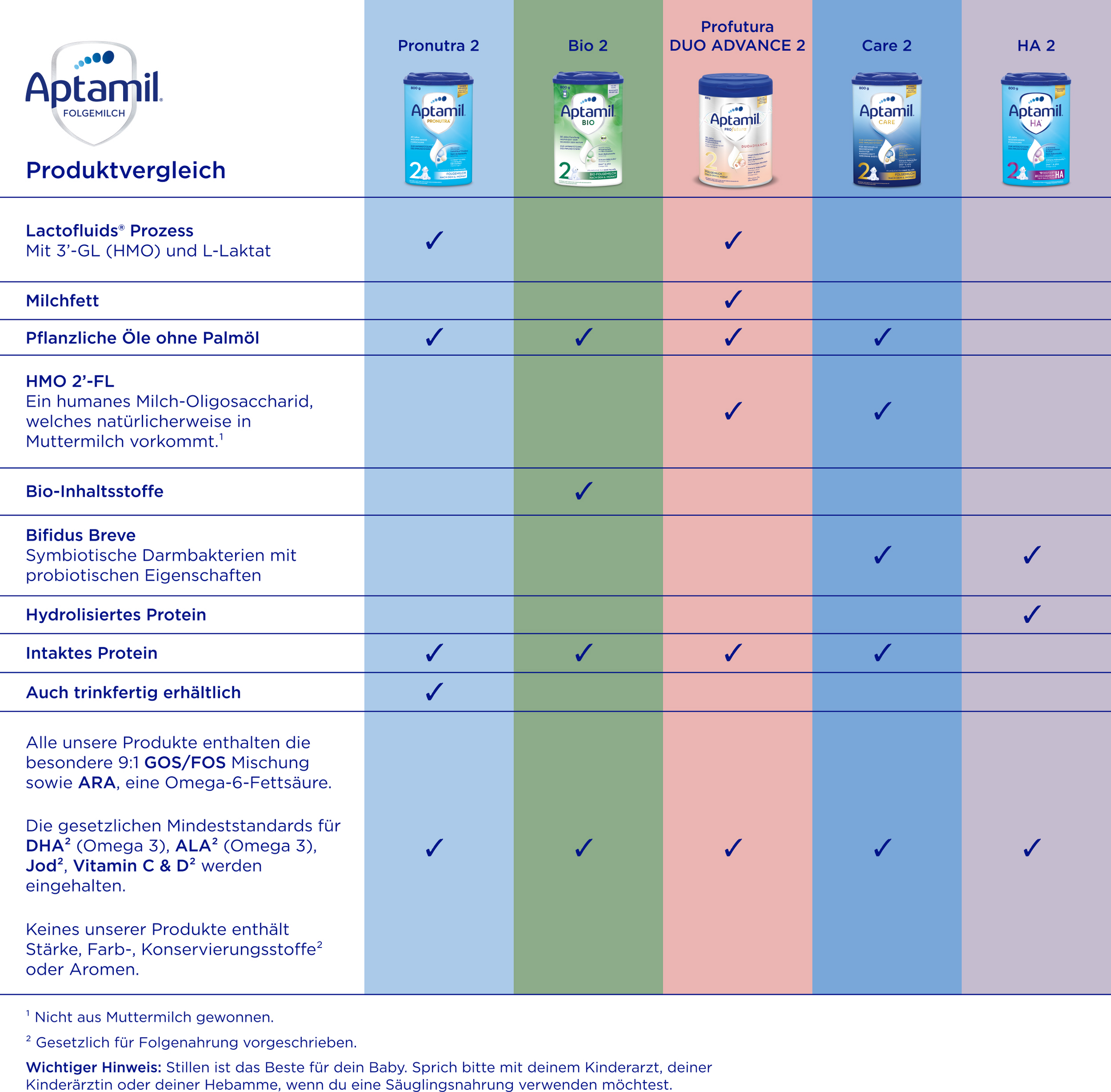 Zur Ernährung: Ausschließliches Stillen in den ersten 6 Monaten ist ideal für Ihr Baby. Wie jede Folgemilch sollte Aptamil® Profutura DUOAdvance 2 Folgemilch nicht in den ersten 6 Monaten als Muttermilchersatz verwendet werden, sondern grundsätzlich erst nach 6 Monaten als Bestandteil einer gemischten Ernährung. Die individuellen Wachstums- und Entwicklungsbedürfnisse Ihres Babys können es allerdings erforderlich machen, Folgenahrungen als Teil einer Mischkost bereits zu einem früheren Zeitpunkt in den Speiseplan Ihres Babys einzuführen. Bitte lassen Sie sich dazu von Ihrem Kinderarzt beraten.
