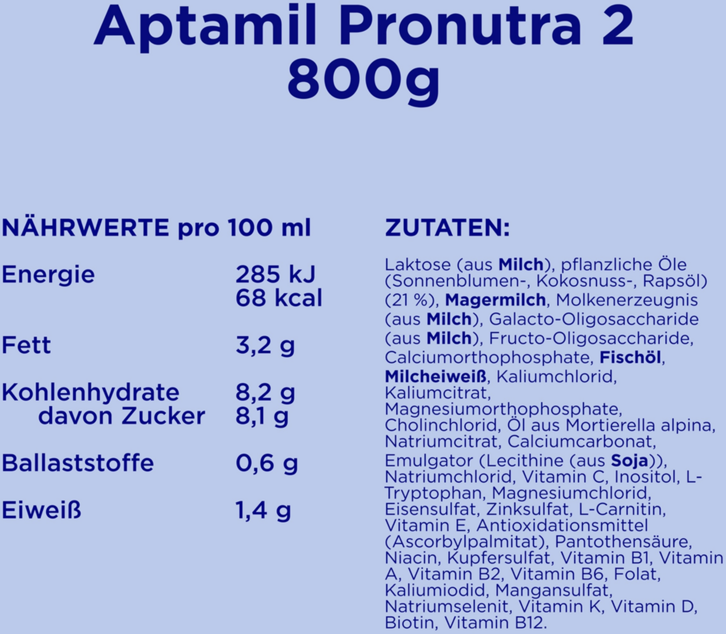 Laktose (aus MILCH), pflanzliche Öle (Sonnenblumen-, Kokosnuss-, Rapsöl) (21 %), MAGERMILCH, Molkenerzeugnis (aus MILCH), Galacto-Oligosaccharide (aus MILCH), Fructo-Oligosaccharide, Calciumorthophosphate, FISCHÖL, Molkeneiweiß (aus MILCH) Kaliumchlorid, Kaliumcitrat, Magnesiumhydrogenphosphat, Cholinchlorid, Öl aus Mortierella alpina, Natriumcitrat, Calciumcarbonat, Emulgator (Lecithine (aus SOJA)), Natriumchlorid, Vitamin C, Inositol, L-Tryptophan, Magnesiumchlorid, Eisensulfat, Zinksulfat, L-Carnitin, Vitamin E, Antioxidationsmittel (Ascorbylpalmitat), Pantothensäure, Niacin, Kupfersulfat, Vitamin B1, Vitamin A, Vitamin B2, Vitamin B6, Folsäure, Kaliumiodid, Mangansulfat, Natriumselenit, Vitamin K, Vitamin D, Biotin, Vitamin B12