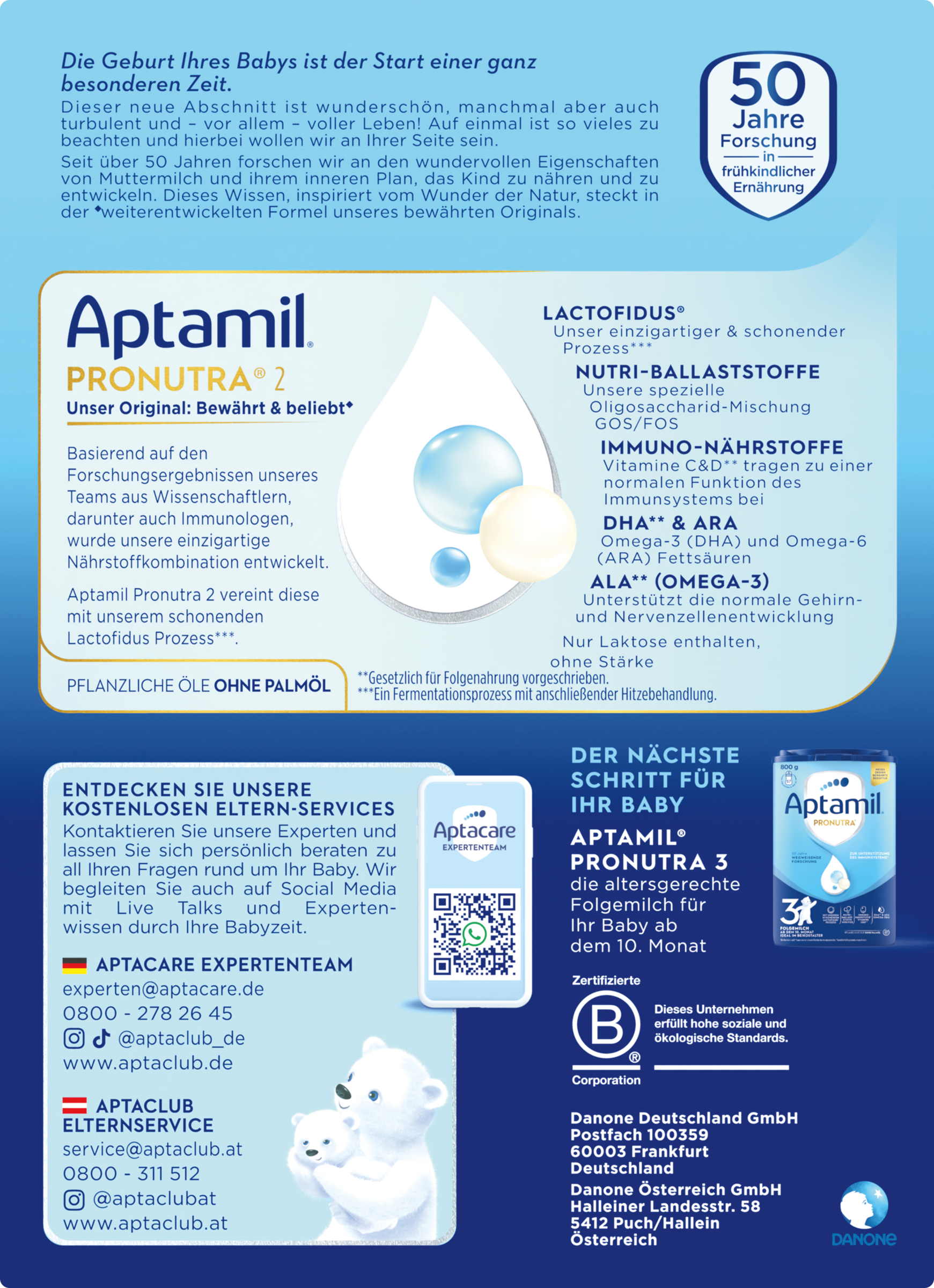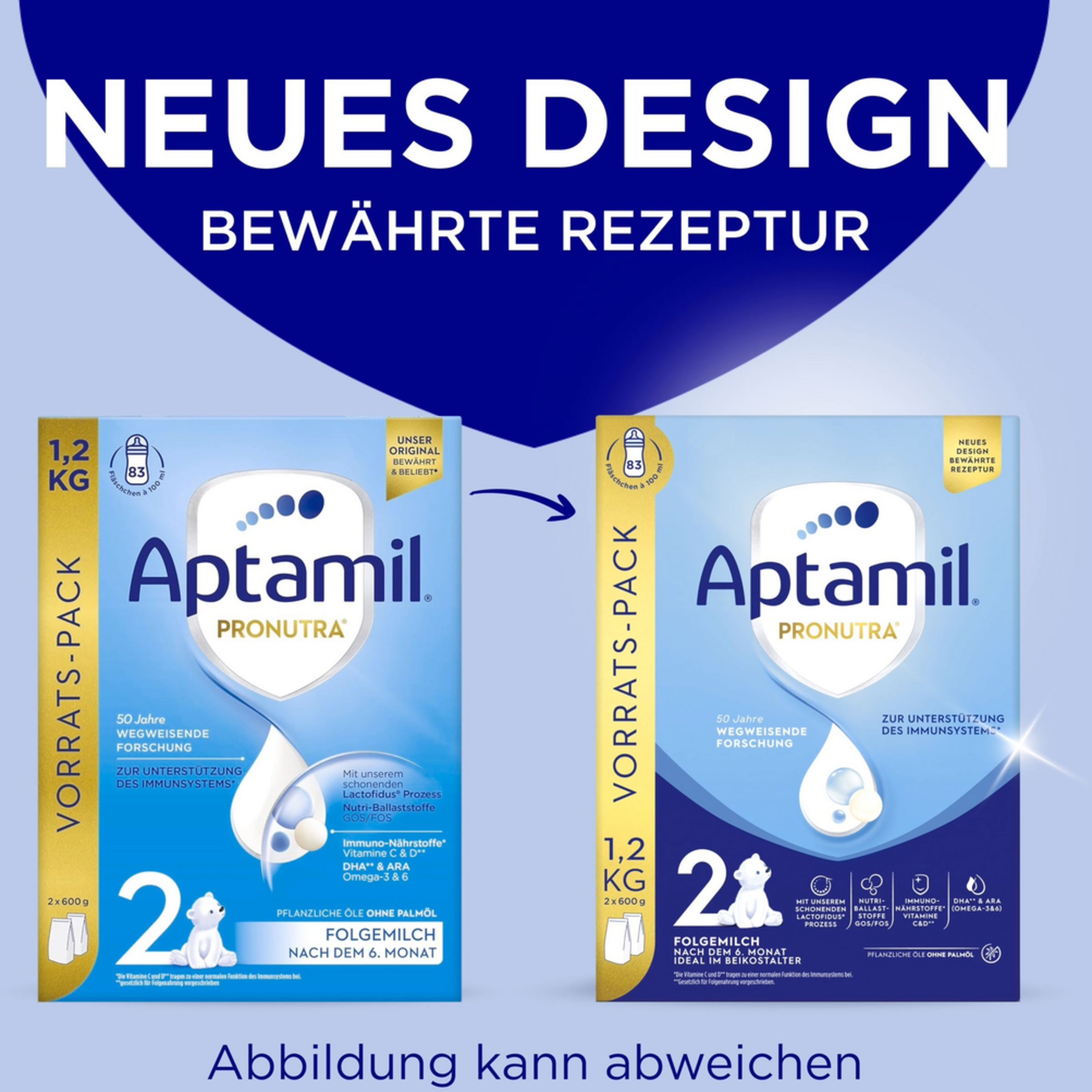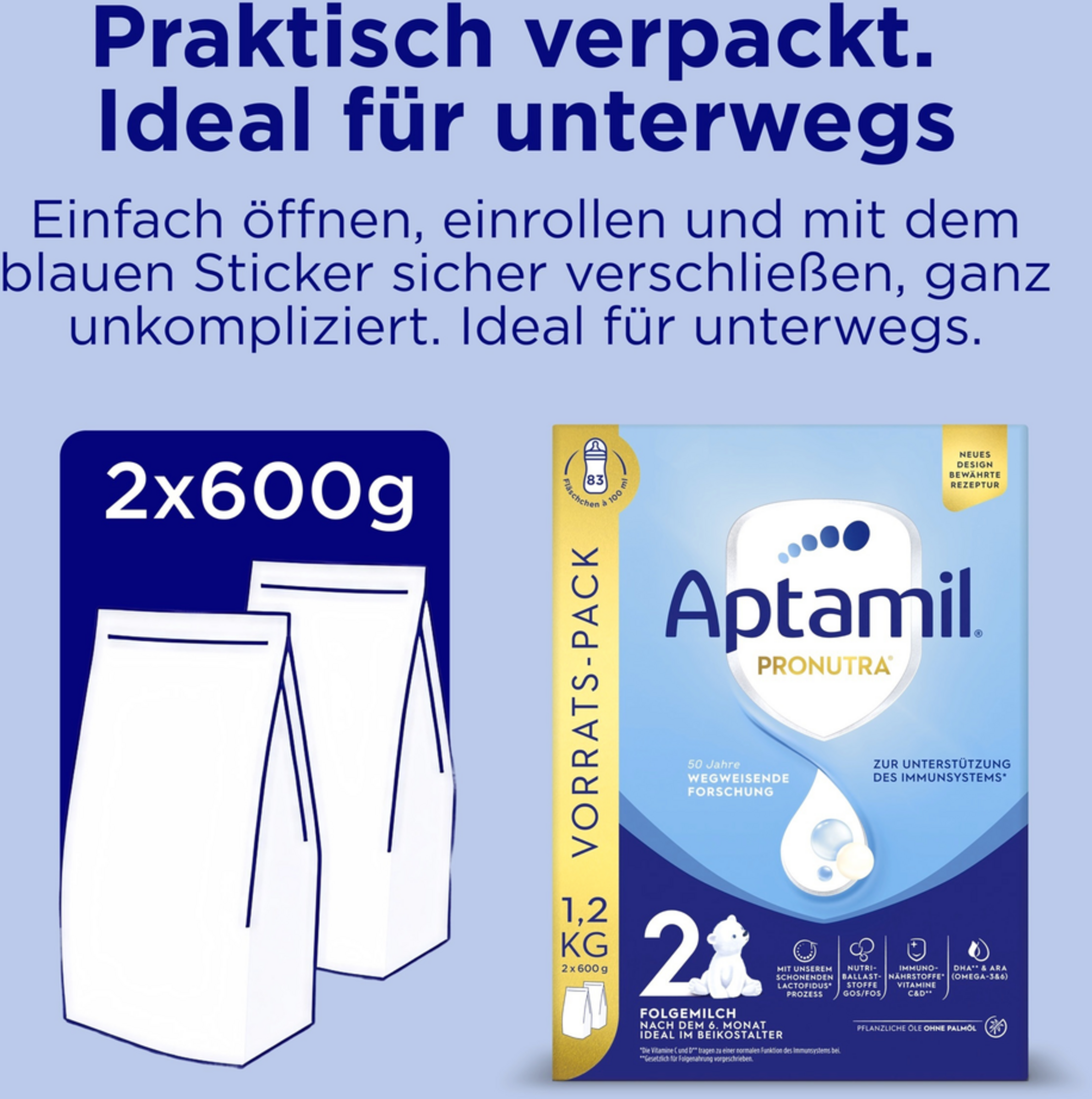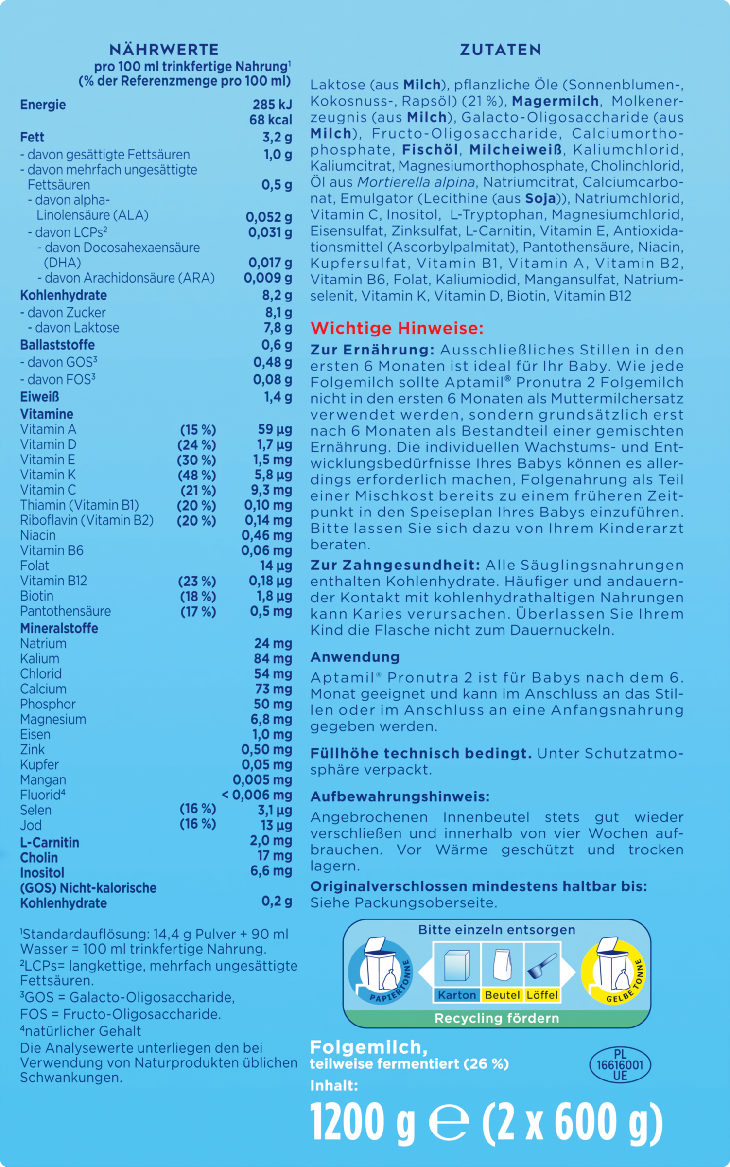 - Zur Ernährung: Ausschließliches Stillen in den ersten 6 Monaten ist ideal für Ihr Baby. Wie jede Folgemilch sollte Aptamil® Pronutra 2 Folgemilch nicht in den ersten 6 Monaten als Muttermilchersatz verwendet werden, sondern grundsätzlich erst nach 6 Monaten als Bestandteil einer gemischten Ernährung. Die individuellen Wachstums- und Entwicklungsbedürfnisse Ihres Babys können es allerdings erforderlich machen, Folgenahrung als Teil einer Mischkost bereits zu einem früheren Zeitpunkt in den Speiseplan Ihres Babys einzuführen. Bitte lassen Sie sich dazu von Ihrem Kinderarzt beraten.