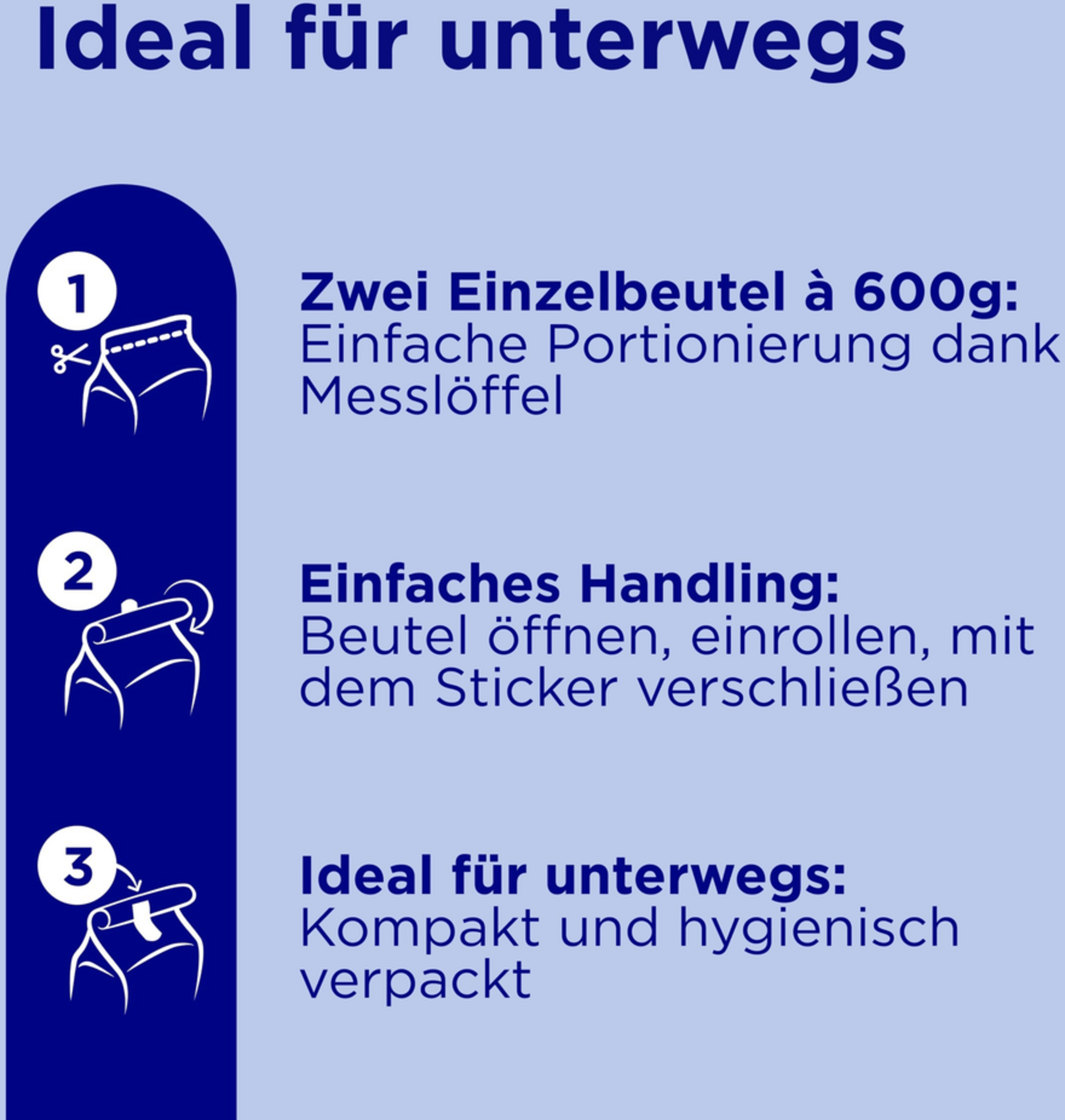 Angebrochene Packung stets gut wieder verschließen, indem Sie auf das Handsymbol auf dem Deckel drücken, bis dieser einrastet. Angebrochene Packung innerhalb von vier Wochen aufbrauchen. Vor Wärme geschützt und trocken lagern.