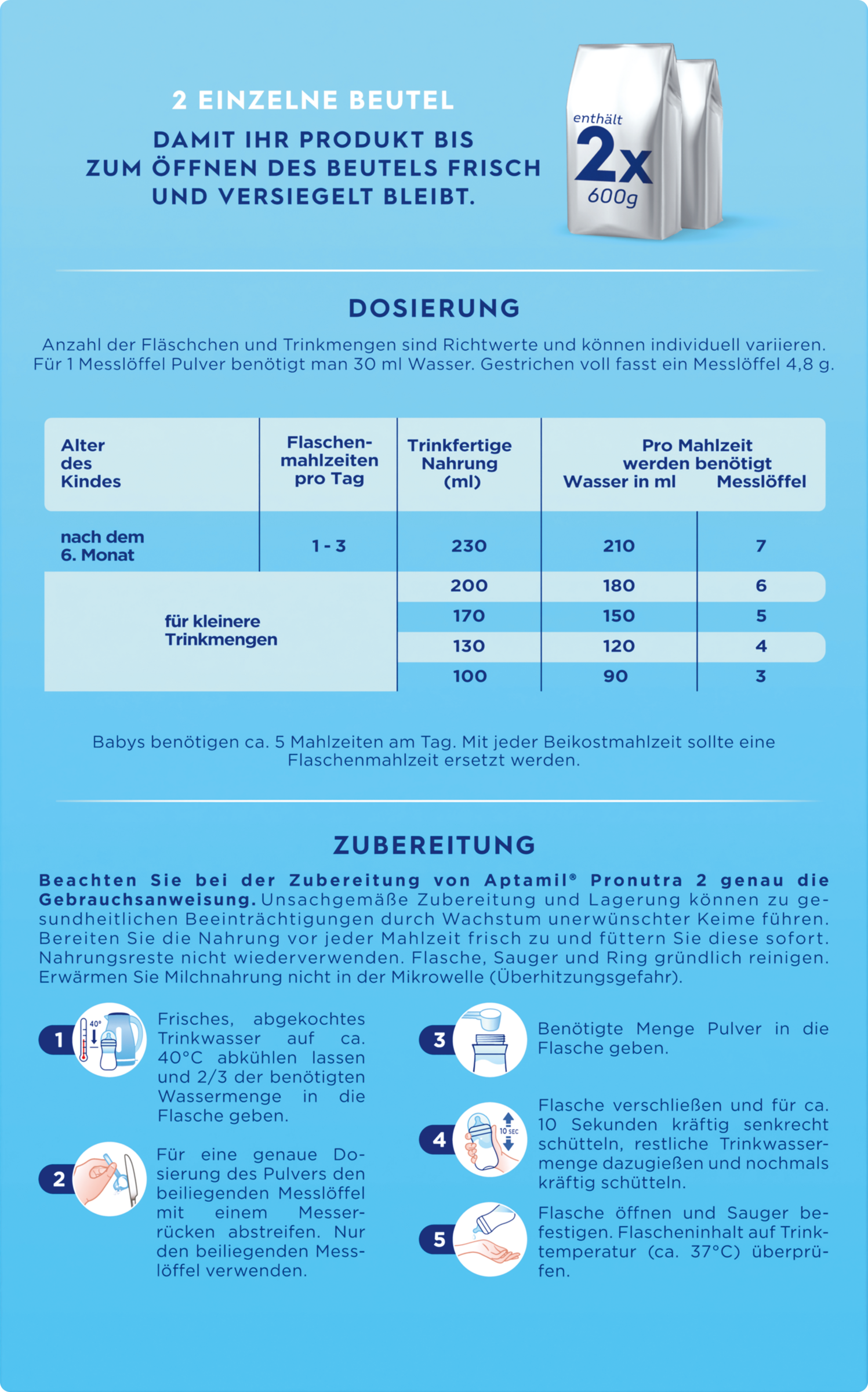 Beachten Sie bei der Zubereitung von Aptamil® Pronutra 2 genau die Gebrauchsanweisung. Unsachgemäße Zubereitung und Lagerung können zu gesundheitlichen Beeinträchtigungen durch Wachstum unerwünschter Keime führen. Bereiten Sie die Nahrung vor jeder Mahlzeit frisch zu und füttern Sie diese sofort. Nahrungsreste nicht wiederverwenden. Flasche, Sauger und Ring gründlich reinigen. Erwärmen Sie Milchnahrung nicht in der Mikrowelle (Überhitzungsgefahr).