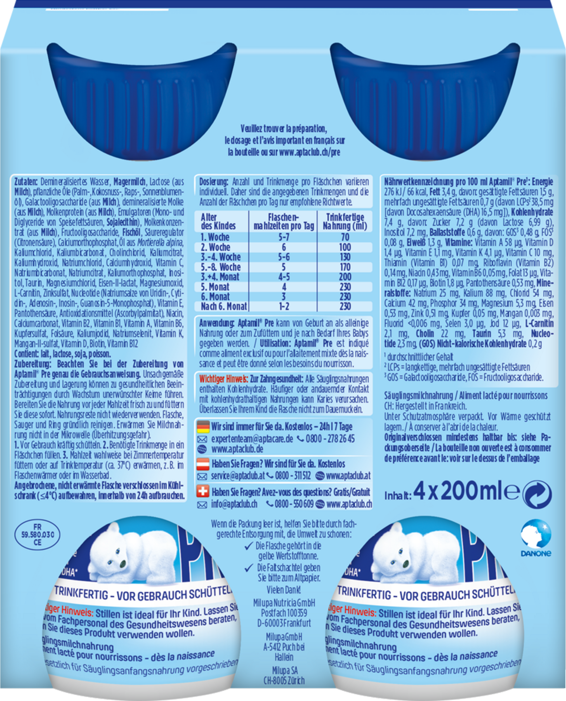 Anzahl und Trinkmenge pro Fläschchen variieren individuell. Daher sind die angegebenen Trinkmengen und die Anzahl der Fläschchen pro Tag nur empfohlene Richtwerte. Bitte beachten Sie die Dosierungstabelle auf der Produktverpackung.