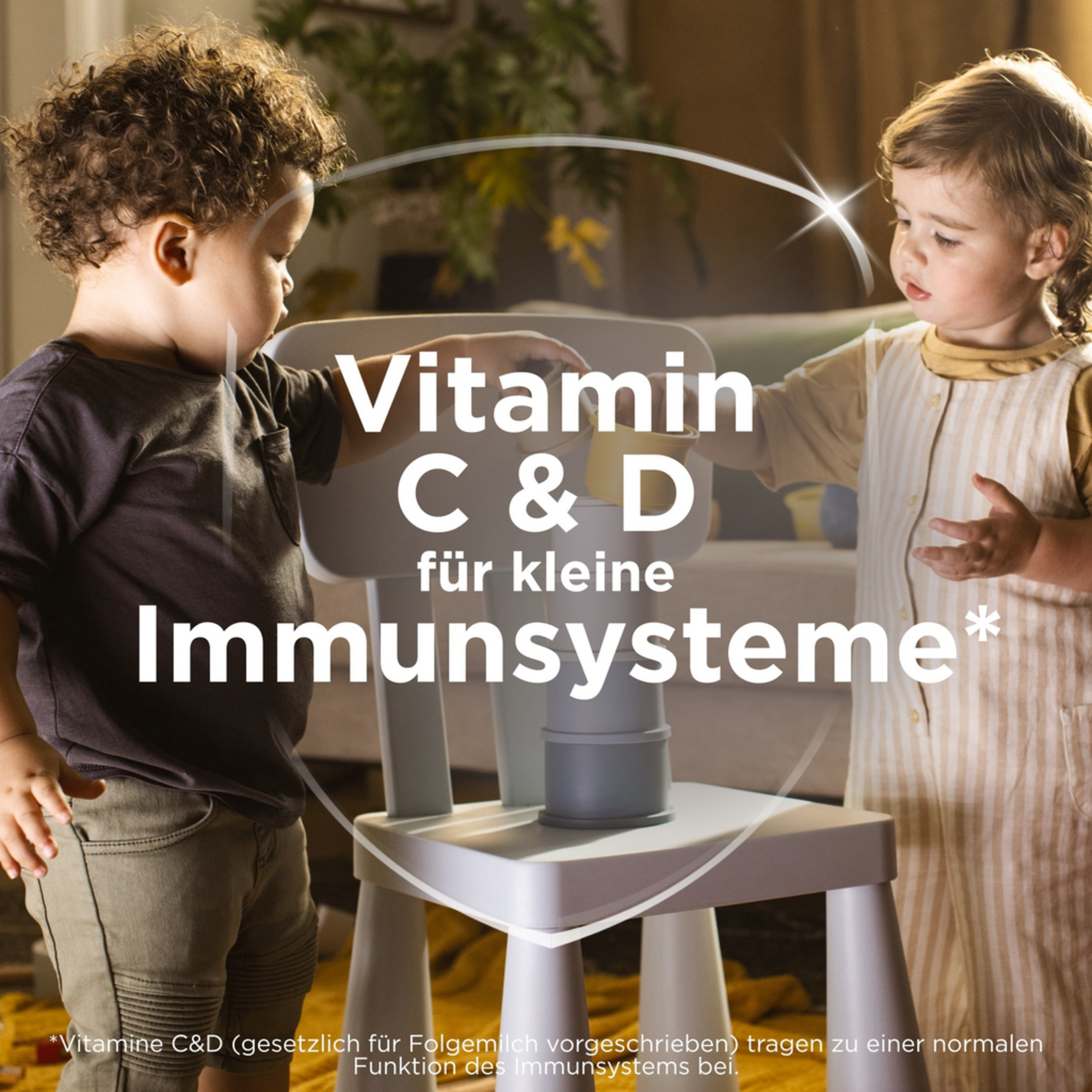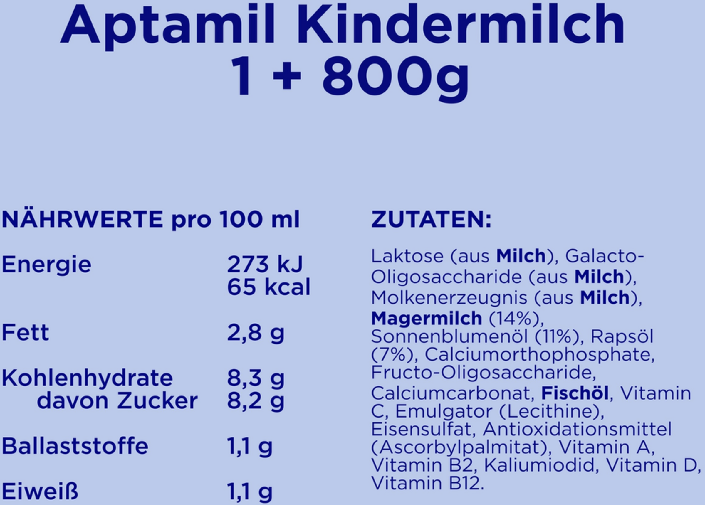 Laktose (aus MILCH), Galacto-Oligosaccharide (aus MILCH), Molkenerzeugnis (aus MILCH), Magermilch (14%), Sonnenblumenöl (11%), Rapsöl (7%), Calciumorthophosphate, Fructo-Oligosaccharide, Calciumcarbonat, FISCHÖL, Vitamin C, Emulgator (Lecithine), Eisensulfat, Antioxidationsmittel (Ascorbylpalmitat), Vitamin A, Vitamin B2, Kaliumiodid, Vitamin D, Vitamin B12