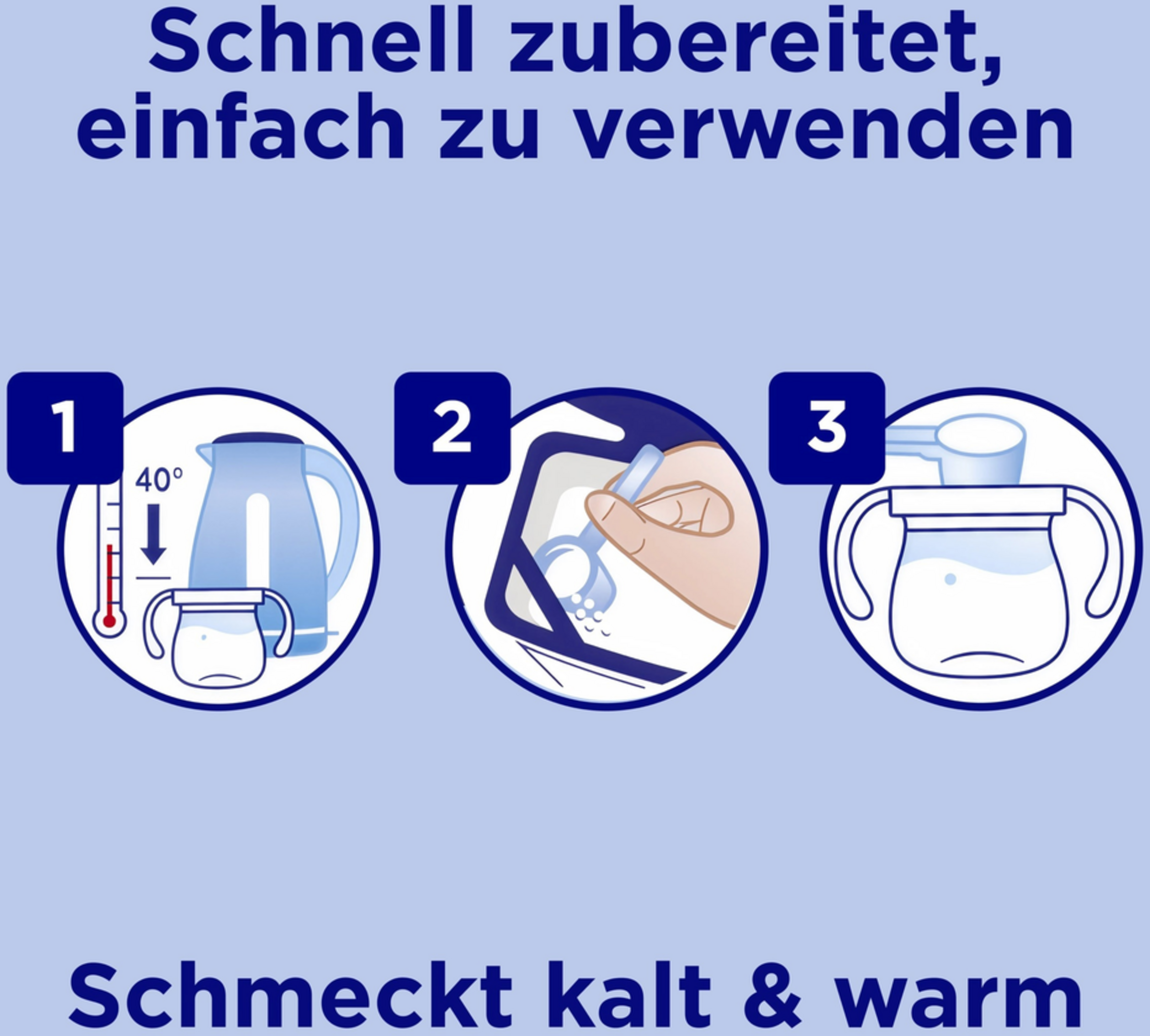 Beachten Sie bei der Zubereitung und Lagerung von Aptamil® Kindermilch 1+ genau die Gebrauchsanweisung. Bereiten Sie diese stets frisch zu und füttern Sie diese sofort. Nahrungsreste nicht wiederverwenden. Aptamil® Kindermilch 1+ kann warm oder kalt zubereitet werden. Erwärmen Sie Aptamil® Kindermilch 1+ nicht in der Mikrowelle (Überhitzungsgefahr).