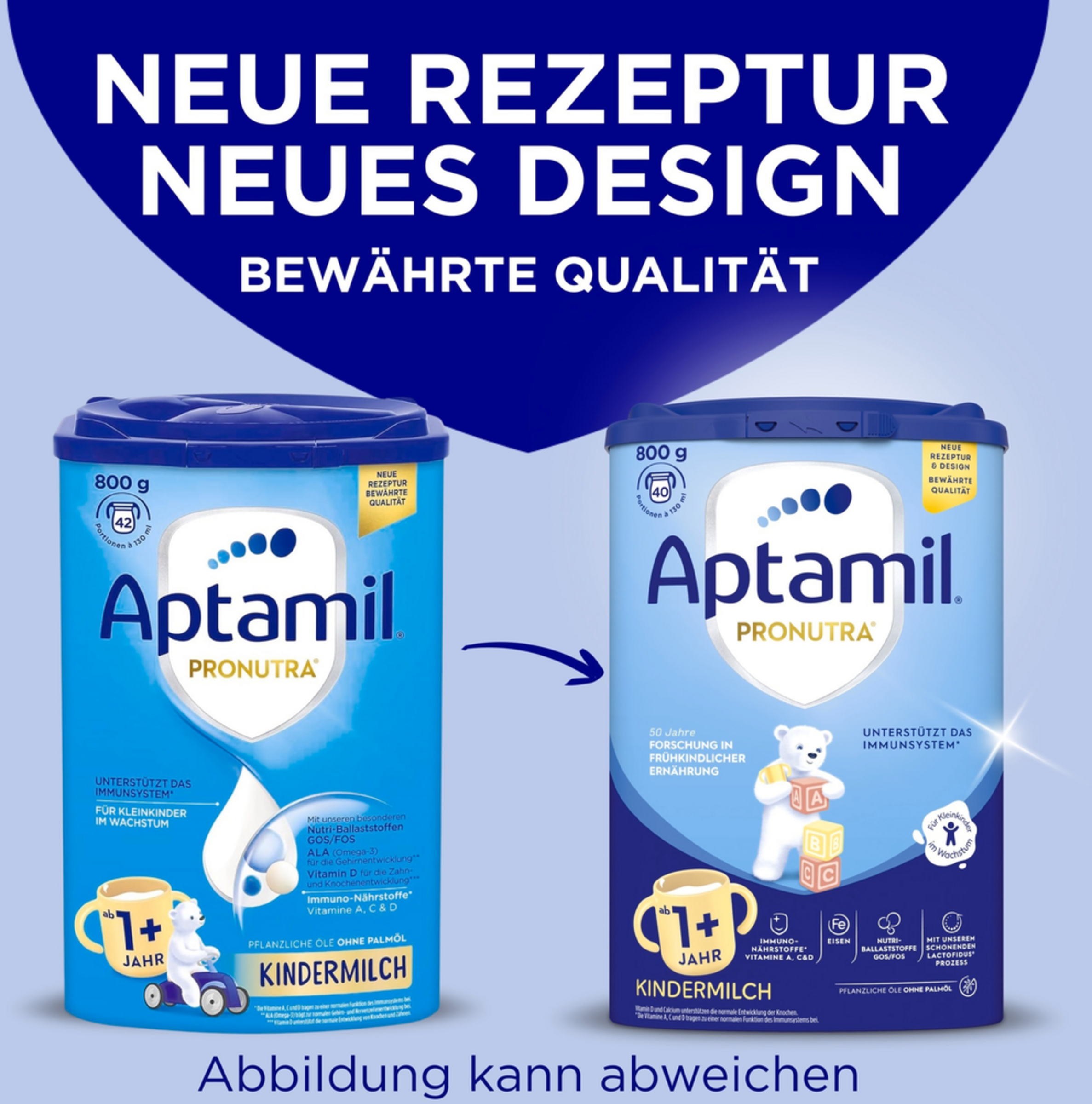 Aptamil® Kindermilch 1+ eignet sich für Kleinkinder ab 1 Jahr als Milchgetränk zum Frühstück, Mittagessen, Abendessen oder zwischendurch. Unsere Kindermilch schmeckt warm oder kalt. Trinkmenge und Anzahl der Portionen variieren individuell. Daher sind die angegebenen Trinkmengen und die Anzahl der Portionen nur Richtwerte.