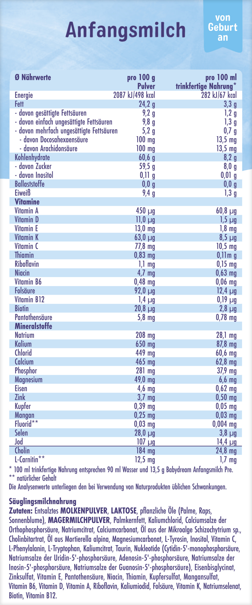 | 100 g Pulver | 100 ml trinkfertige Nahrung (90 ml Wasser und 13,5 g Pulver) | |||