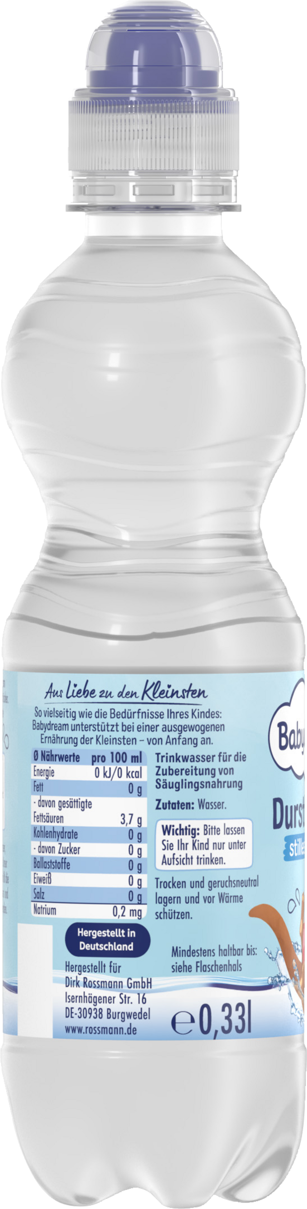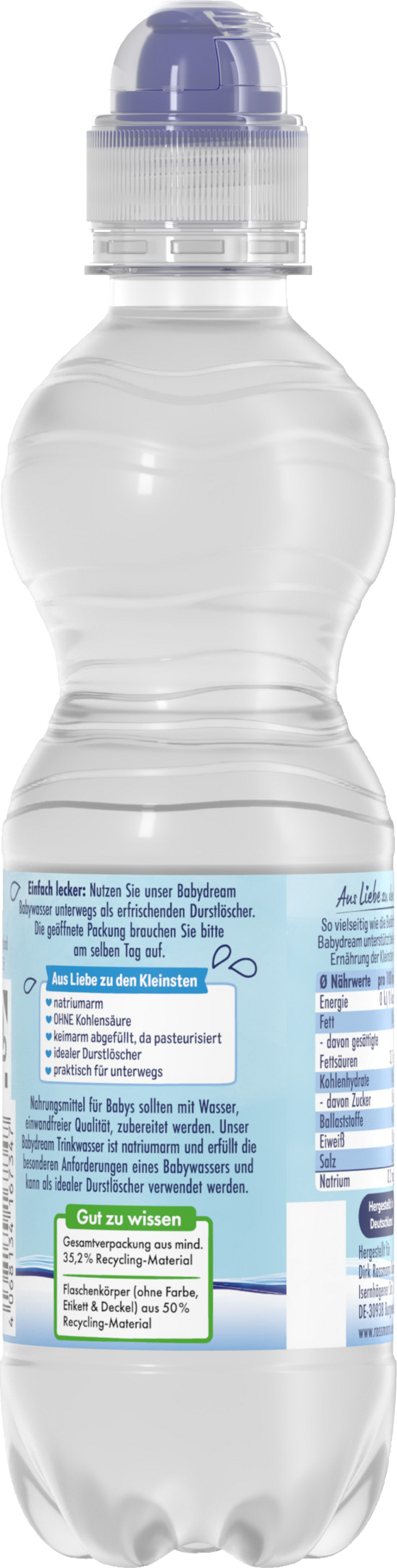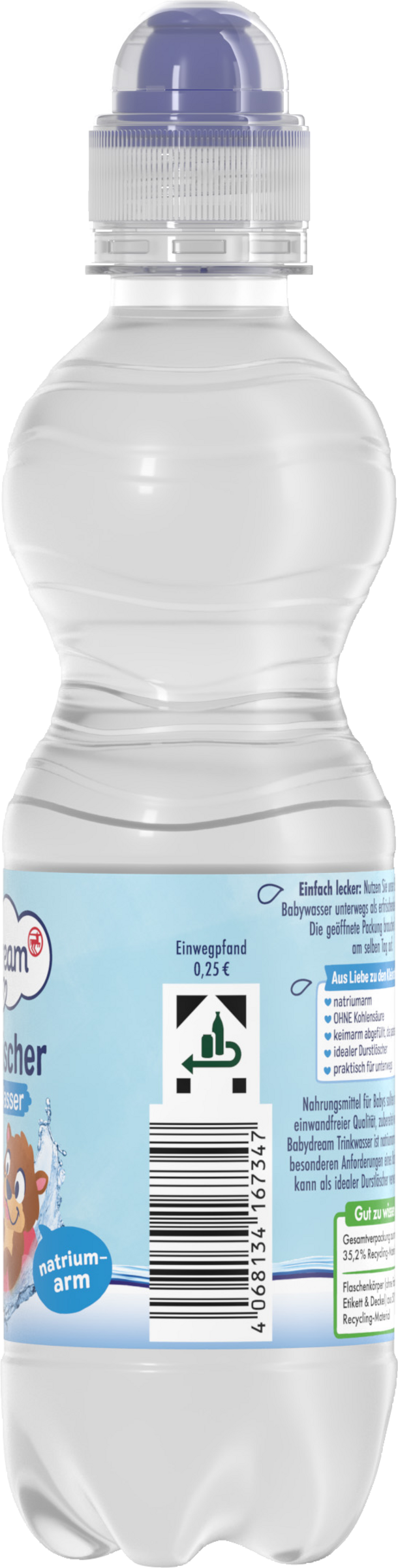 Aus Liebe zu den KleinstenSo vielseitig wie die Bedürfnisse Ihres Kindes: Babydream unterstützt bei einer ausgewogenen Ernährung der Kleinsten – von Anfang an.Einfach lecker: Nutzen Sie unser Babydream Babywasser unterwegs als erfrischenden Durstlöscher. Die geöffnete Packung brauchen Sie bitte am selben Tag auf.Aus Liebe zu den KleinstennatriumarmOHNE Kohlensäurekeimarm abgefüllt, da pasteurisiertidealer Durstlöscherpraktisch für unterwegs Nahrungsmittel für Babys sollten mit Wasser von einwandfreier Qualität zubereitet werden. Unser Babydream Trinkwasser ist natriumarm und erfüllt die besonderen Anforderungen eines Babywassers und kann als idealer Durstlöscher verwendet werden.