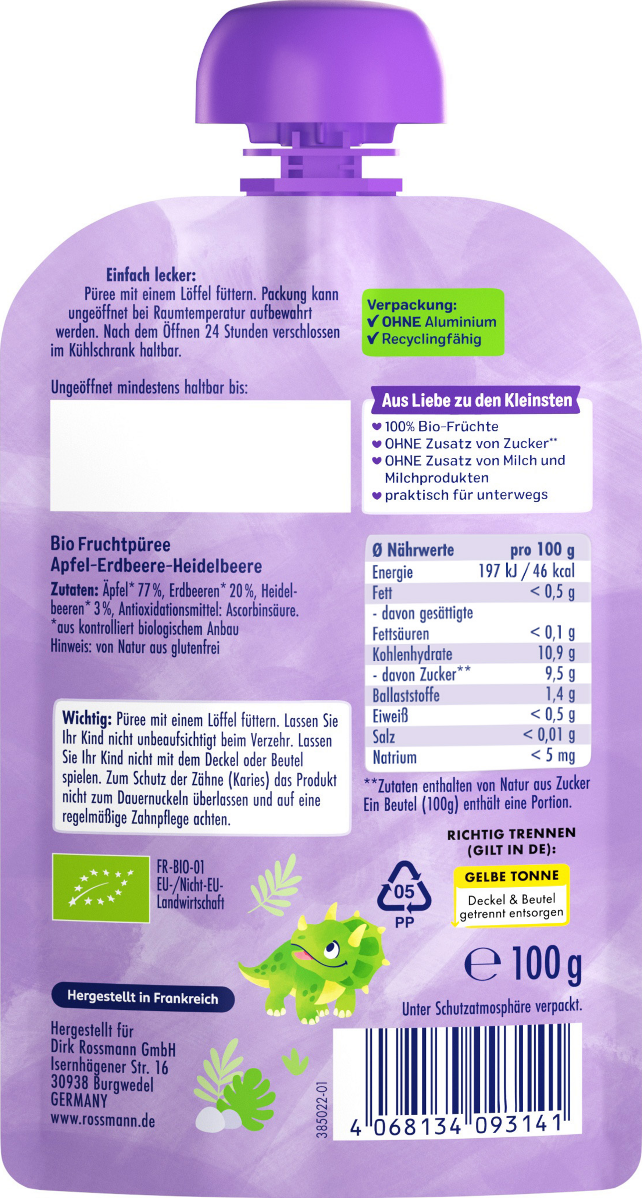 Lassen Sie Ihr Kind nicht unbeaufsichtigt beim Verzehr. Lassen Sie Ihr Kind nicht mit dem Deckel oder Beutel spielen. Zum Schutz der Zähne (Karies) das Produkt nicht zum Dauernuckeln überlassen und auf eine regelmäßige Zahnpflege achten.