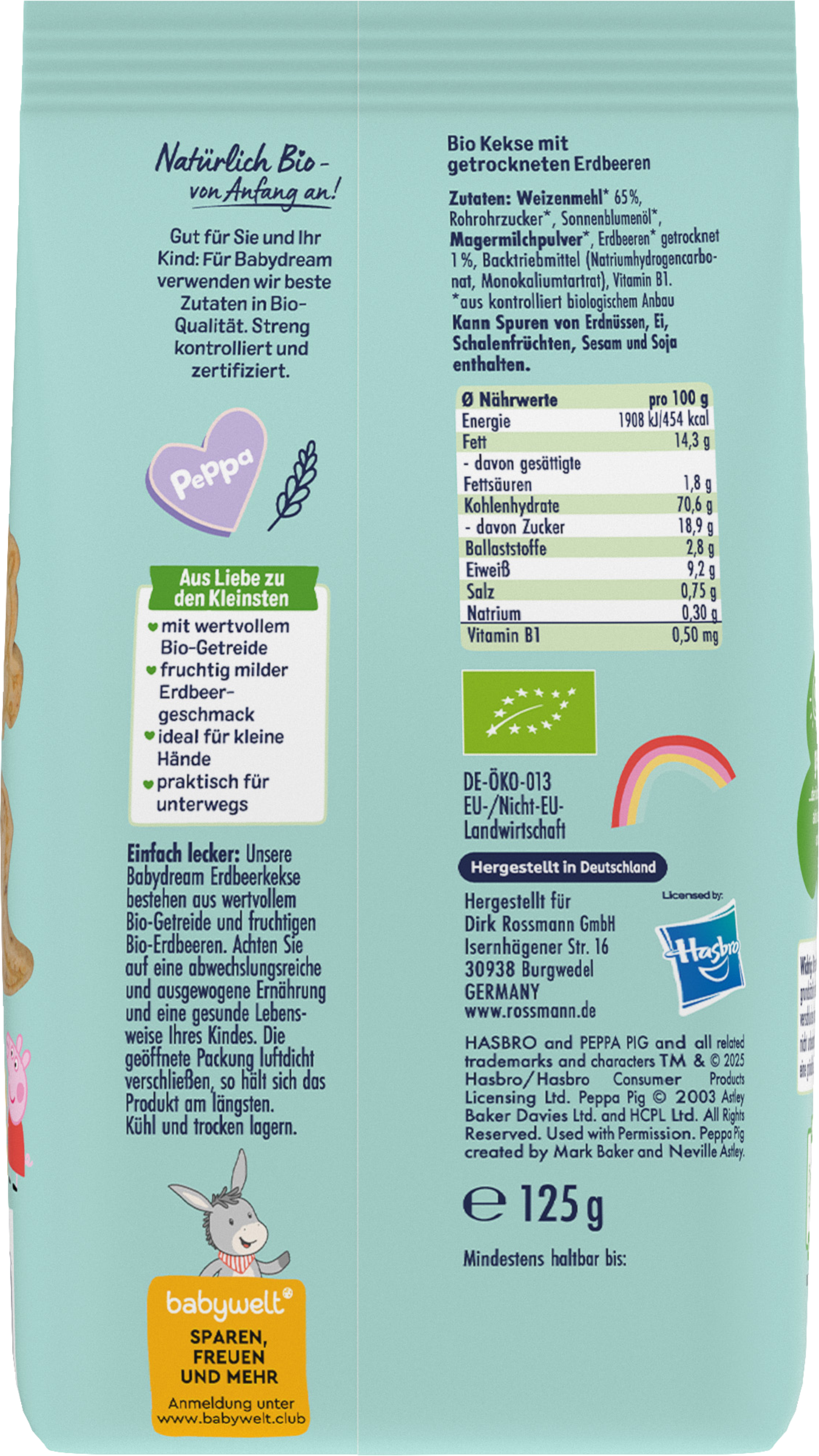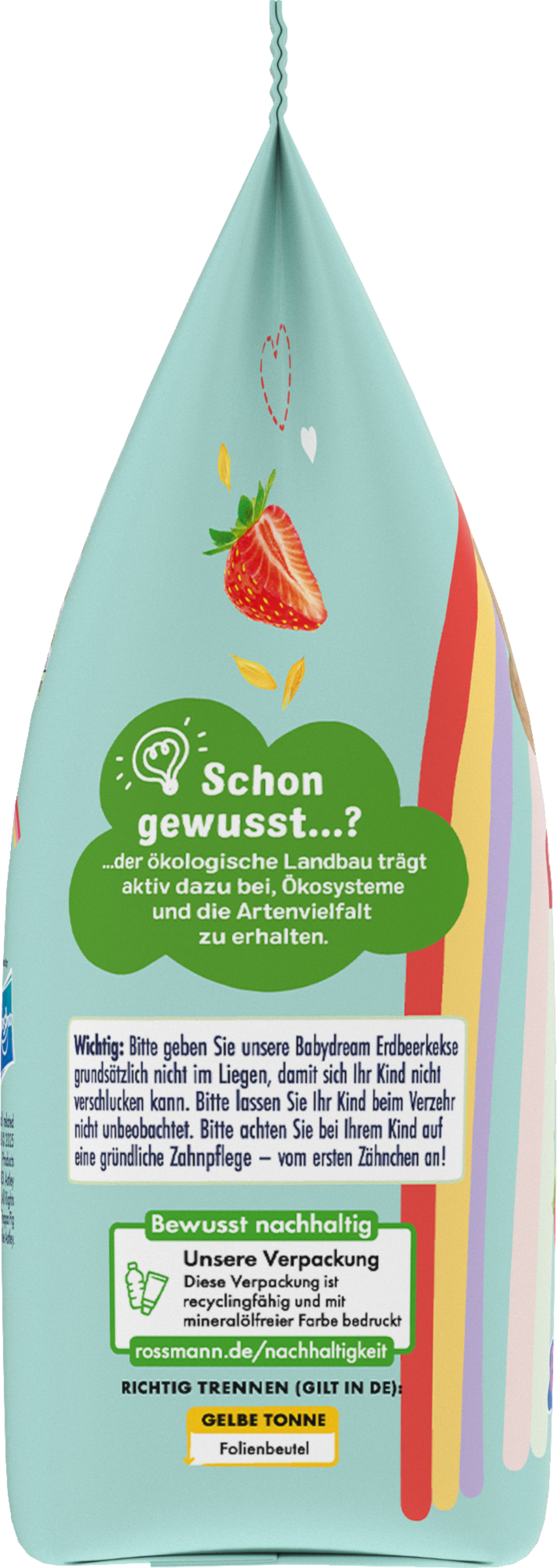 Bitte geben Sie unsere Babydream Erdbeerkekse grundsätzlich nicht im Liegen, damit sich Ihr Kind nicht verschlucken kann. Bitte lassen Sie Ihr Kind beim Verzehr nicht unbeobachtet. Bitte achten Sie bei Ihrem Kind auf eine gründliche Zahnpflege – vom ersten Zähnchen an!