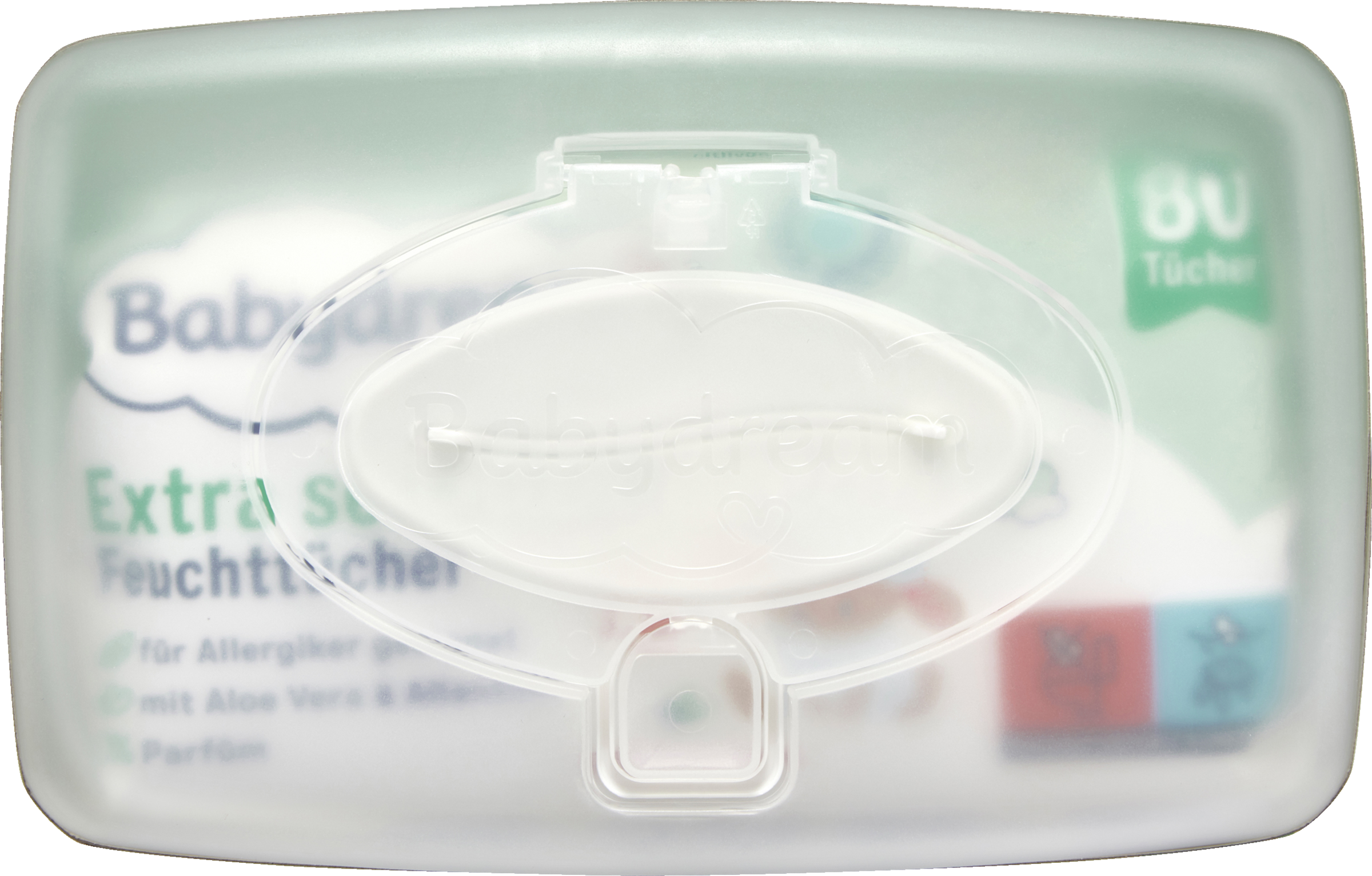 - 2. Feuchttuch herausziehen und durch die Öffnung des Deckels führen.