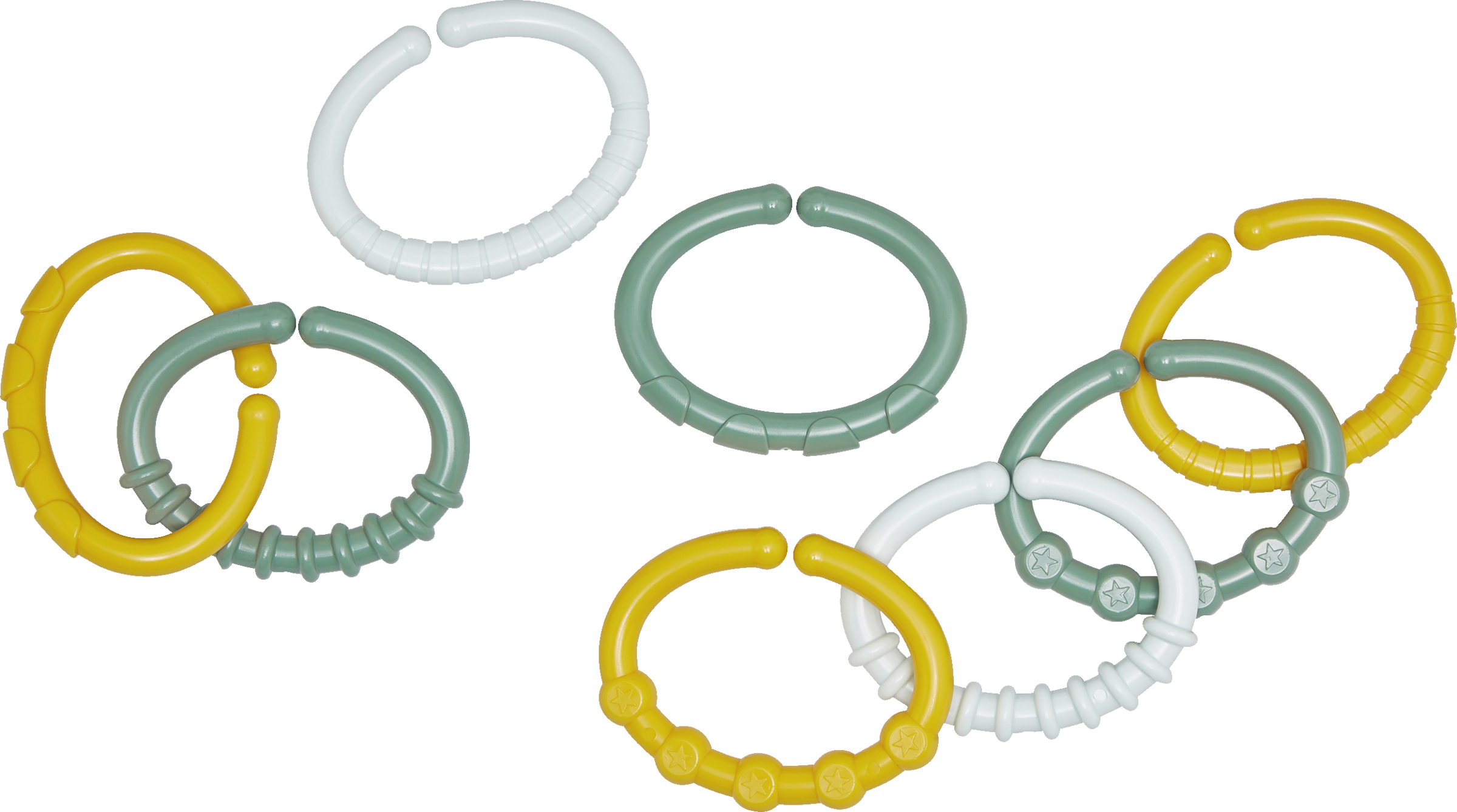 So reinigen Sie die Multifunktions-Ringe:Das Produkt vor dem ersten Gebrauch gründlich reinigen, z. B. unter fließendem warmen Wasser mit mildem Spülmittel abspülen. Vor jedem weiteren Gebrauch den Artikel mit warmem Wasser und mildem Spülmittel reinigen. Eine Reinigung durch Auskochen oder im Vaporisator ist möglich. Keine Desinfektionsmittel verwenden. Nicht in der Geschirrspülmaschine oder der Mikrowelle reinigenZur Sicherheit und Gesundheit Ihres Kindes: ACHTUNG!Vor jeder Benutzung ist das Produkt zu untersuchen. Beim ersten Anzeichen einer Beschädigung oder Schwachstelle ist es wegzuwerfen. Sobald sich das Kind eigenständig bewegen und sitzen kann, die Spielkette aus Multifunktions-Ringen außerhalb der Reichweite des Kindes aufbewahren (Strangulationsgefahr!) und max. vier Ringe als Kette verwenden. Die Kettenglieder nicht über Kinderbetten oder Laufställchen spannen. Keine zusätzlichen Schnüre oder Riemen anbringen. Bitte Produkt- und Gebrauchshinweise aufbewahren. Für den Reklamationsfall: Anschrift, Art. Nr. (EAN-Code) und Verpackung aufbewahren.