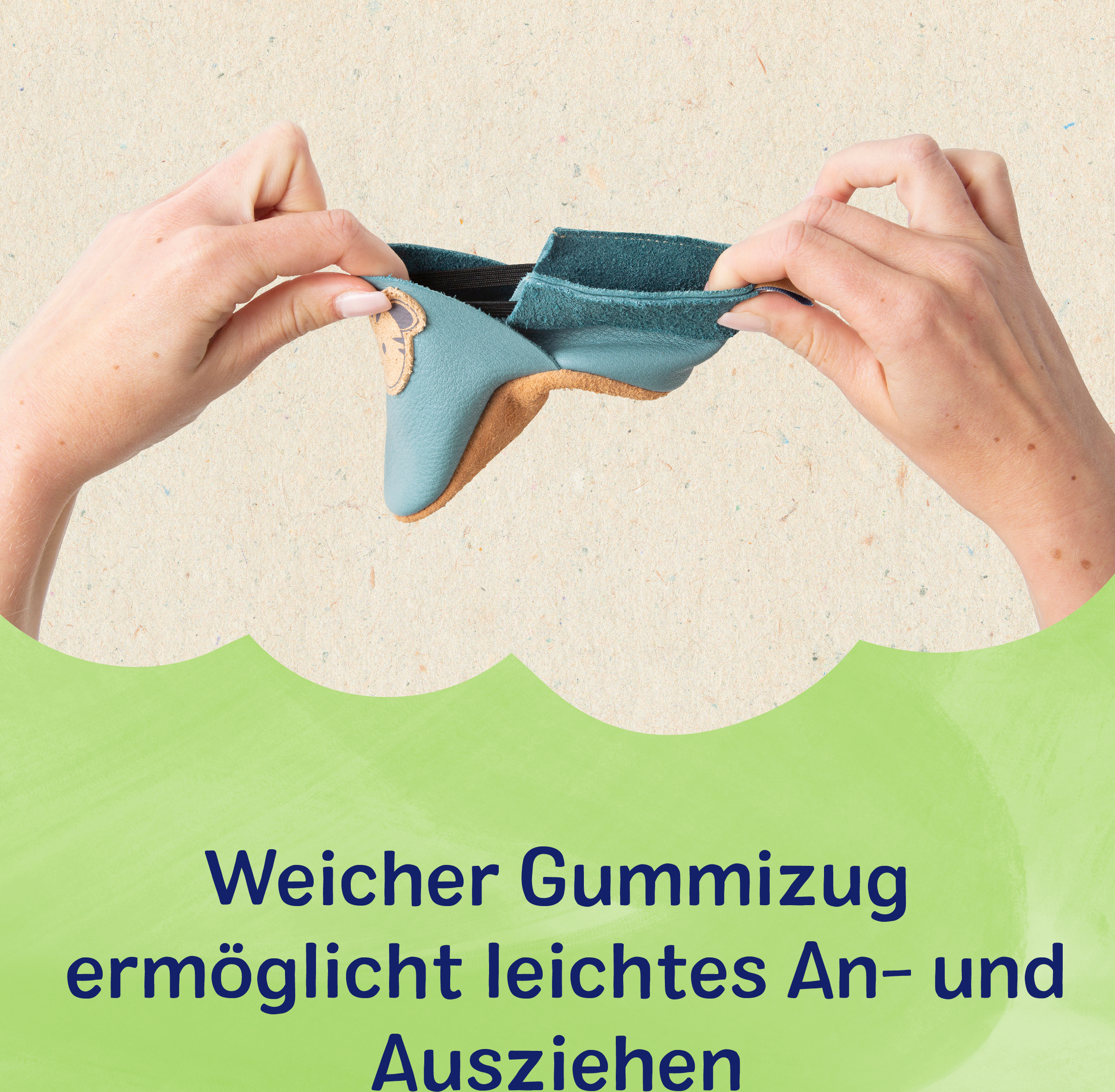 Barfuß oder doch in Schuhen krabbeln?In den ersten Lebensmonaten beginnen die Kleinen damit, sich mit Ihren Beinen überall abzustoßen. Sie trainieren so Ihre Muskeln, Sehnen und Gelenke. Viele Experten empfehlen zwar, Baby-, Kinder- und Erwachsenenfüße nicht ständig in Schuhe zu zwängen, und genau hier knüpfen wir an, denn in unseren Schuhen krabbelt oder läuft man „WIE BARFUSS“! So sind Hausschuhe daheim besonders für krabbelnde Babys und Kleinkinder angebracht, denn so sind die zarten Füßchen und Fußnägel beim Krabbeln und Laufen optimal geschützt.Welche Vorteile haben Krabbelschuhe?Unsere Babyschuhe aus SUPER WEICHEM und trotzdem ROBUSTEM LEDER haben viele Vorteile, die die Kleinen beim Krabbeln unterstützen. Das Material ist so weich sodass es sich bei jeder Bewegung angenehm an die Füßchen schmiegt. Dennoch erlaubt die optimale Passform auch, dass die Zehen viel Raum haben, um sich frei zu bewegen, eben wie BARFUSS-LAUFEN. Darüber hinaus sind unsere Naturlederschühchen mit einer RUTSCHSICHEREN und FLEXIBLEN SOHLE aus Velourleder versehen. Ein Weggleiten auf glatten Bodenbelägen ist daher kaum möglich. Die Schühchen sind somit nicht nur ein komfortabler Wegbegleiter beim Krabbeln und eine wertvolle Unterstützung beim Laufen lernen. Sie fördern auch die Entwicklung der Feinmotorik, da durch das weiche Leder das NATÜRLICHE ABROLLEN der Füße unterstützt wird. Also ganz einfach: Schutz für die Füße, ohne einzuengen!Nur beste Materialien machen einen perfekten Schuh!Bei unseren NATURLEDERSCHÜHCHEN beginnt alles mit der Auswahl der Materialien. Von Anfang an legen wir höchsten Wert auf QUALITÄT und NACHHALTIGKEIT. So werden unsere traumhaft weichen Naturlederschühchen ausschließlich mit CHROMFREI gegerbtem Naturleder hergestellt. Auf diese Weise ist nicht nur sichergestellt, dass die bequemen Schühchen strengen Schadstoffkontrollen unterliegen, sondern auch, dass sie ATMUNGSAKTIV und HAUTFREUNDLICH sind. Wir beziehen diese Leder wie auch unsere Verpackung - aus 100% recyclebarem - Karton, die Ökotex-100 zertifizierten Garne und Verpackungsbänder von deutschen Unternehmen.Beste Handwerkskunst für optimale Passform!„Ein Schuh ist nur so gut, wie der Schuhmacher, der ihn herstellt“. Unsere Naturlederschühchen werden mit viel Liebe zum Detail von erfahrenen und handwerklich versierten Mitarbeitern hergestellt. Alles beginnt mit der sorgfältigen Auswahl der Leder – wir nehmen jedes einzelne in Augenschein und prüfen, ob Sie den hohen Anforderungen von Rossmann gerecht werden. Die erfahrenen Stanzer fertigen dann mit hoher Präzision die verschiedenen Einzelteile, die in liebevoller Handarbeit von qualifizierten Stepperinnen zu unserem Naturlederschühchen zusammengefügt werden.