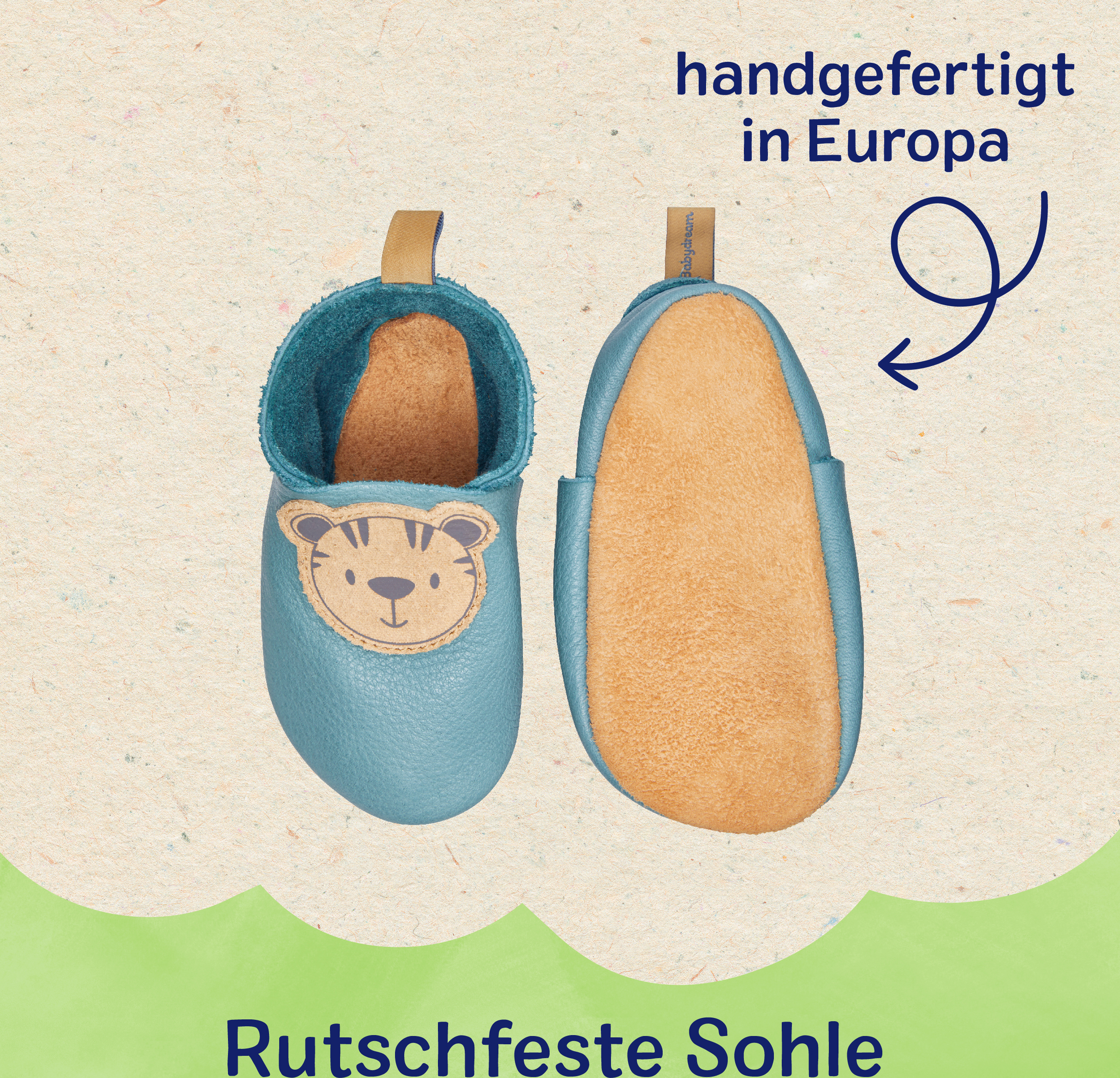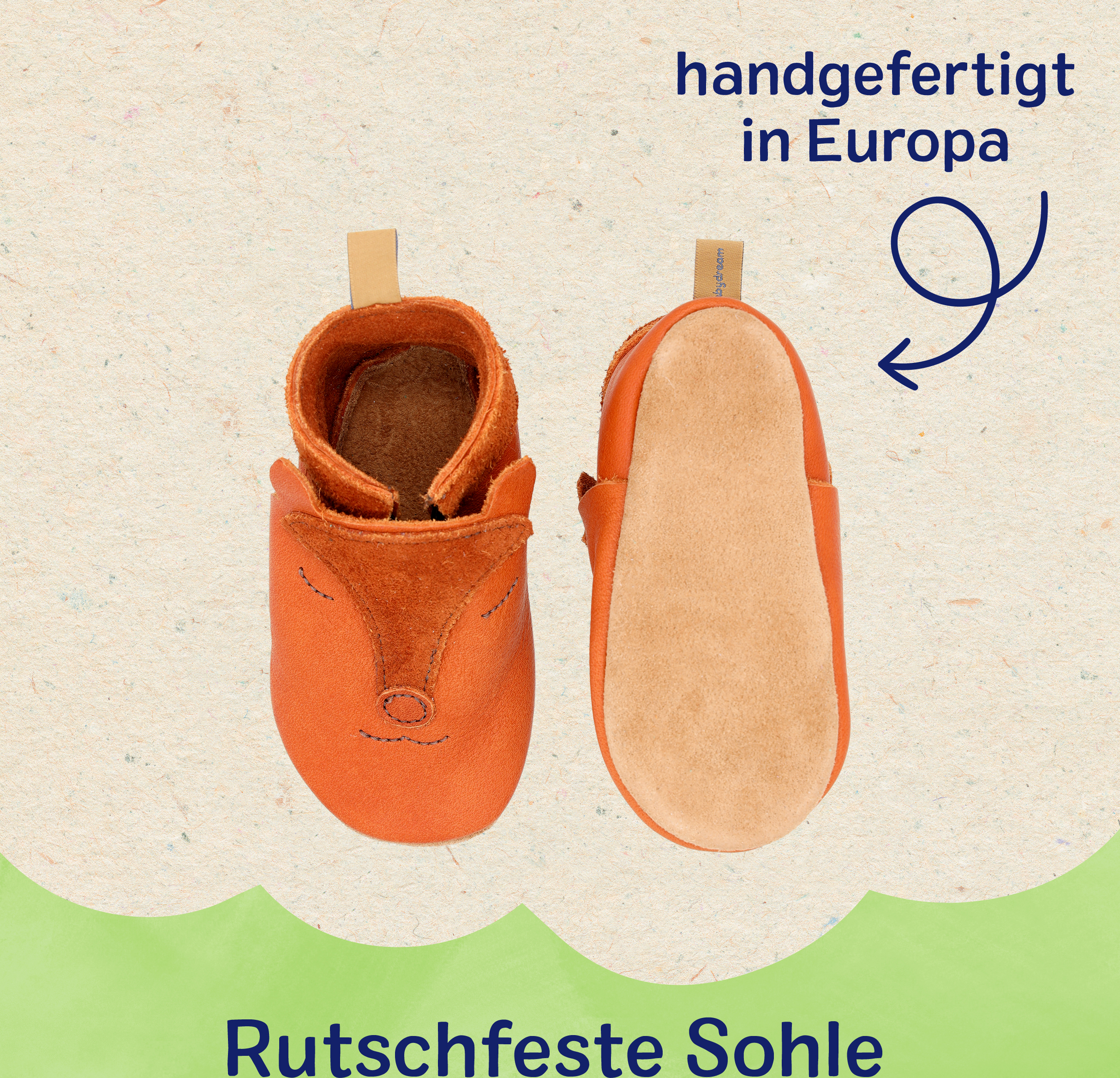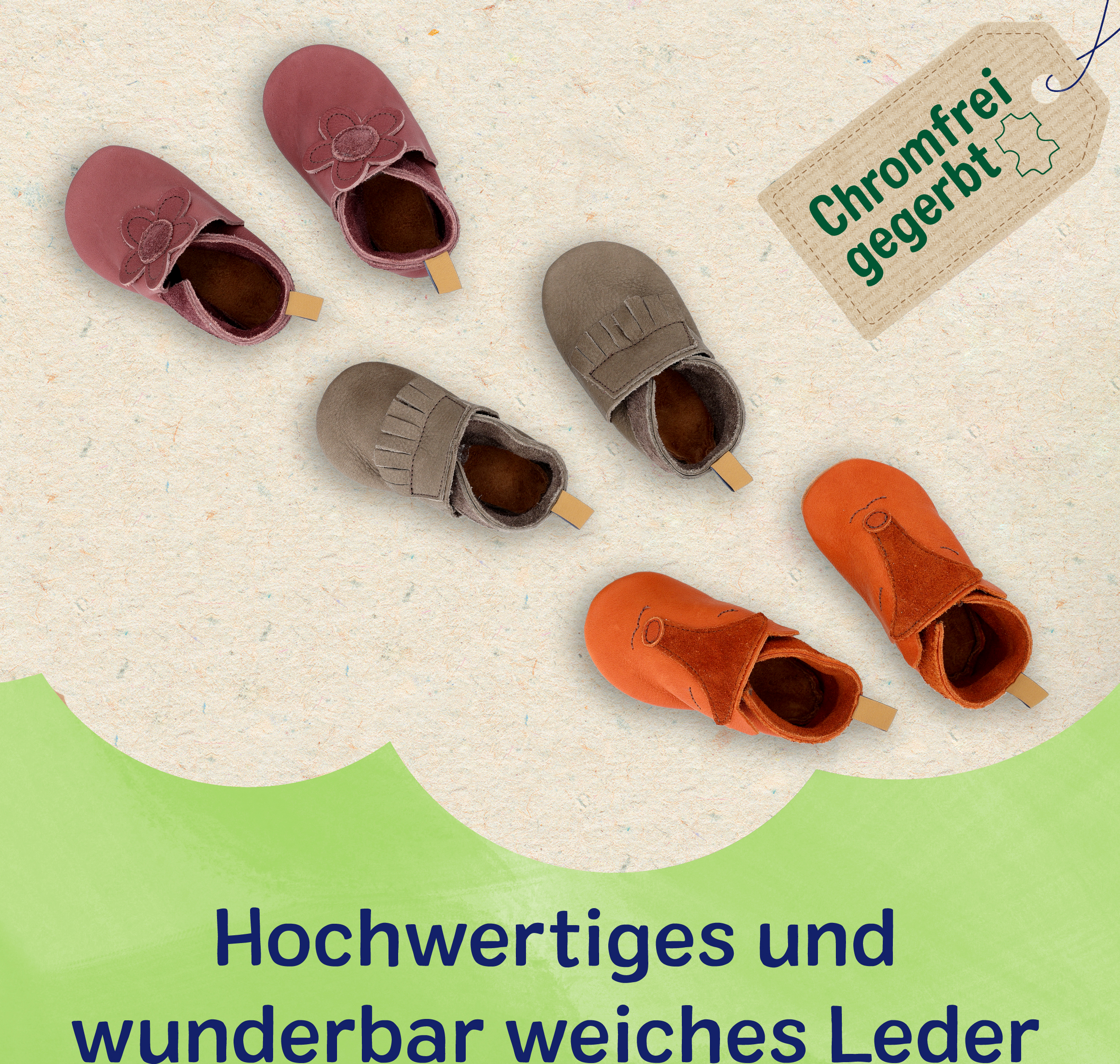 Barfuß oder doch in Schuhen krabbeln?In den ersten Lebensmonaten beginnen die Kleinen damit, sich mit Ihren Beinen überall abzustoßen. Sie trainieren so Ihre Muskeln, Sehnen und Gelenke. Viele Experten empfehlen zwar, Baby-, Kinder- und Erwachsenenfüße nicht ständig in Schuhe zu zwängen, und genau hier knüpfen wir an, denn in unseren Schuhen krabbelt oder läuft man „WIE BARFUSS“! So sind Hausschuhe daheim besonders für krabbelnde Babys und Kleinkinder angebracht, denn so sind die zarten Füßchen und Fußnägel beim Krabbeln und Laufen optimal geschützt.Welche Vorteile haben Krabbelschuhe?Unsere Babyschuhe aus SUPER WEICHEM und trotzdem ROBUSTEM LEDER haben viele Vorteile, die die Kleinen beim Krabbeln unterstützen. Das Material ist so weich sodass es sich bei jeder Bewegung angenehm an die Füßchen schmiegt. Dennoch erlaubt die optimale Passform auch, dass die Zehen viel Raum haben, um sich frei zu bewegen, eben wie BARFUSS-LAUFEN. Darüber hinaus sind unsere Naturlederschühchen mit einer RUTSCHSICHEREN und FLEXIBLEN SOHLE aus Velourleder versehen. Ein Weggleiten auf glatten Bodenbelägen ist daher kaum möglich. Die Schühchen sind somit nicht nur ein komfortabler Wegbegleiter beim Krabbeln und eine wertvolle Unterstützung beim Laufen lernen. Sie fördern auch die Entwicklung der Feinmotorik, da durch das weiche Leder das NATÜRLICHE ABROLLEN der Füße unterstützt wird. Also ganz einfach: Schutz für die Füße, ohne einzuengen!Nur beste Materialien machen einen perfekten Schuh!Bei unseren NATURLEDERSCHÜHCHEN beginnt alles mit der Auswahl der Materialien. Von Anfang an legen wir höchsten Wert auf QUALITÄT und NACHHALTIGKEIT. So werden unsere traumhaft weichen Naturlederschühchen ausschließlich mit CHROMFREI gegerbtem Naturleder hergestellt. Auf diese Weise ist nicht nur sichergestellt, dass die bequemen Schühchen strengen Schadstoffkontrollen unterliegen, sondern auch, dass sie ATMUNGSAKTIV und HAUTFREUNDLICH sind. Wir beziehen diese Leder wie auch unsere Verpackung - aus 100% recyclebarem - Karton, die Ökotex-100 zertifizierten Garne und Verpackungsbänder von deutschen Unternehmen.Beste Handwerkskunst für optimale Passform!„Ein Schuh ist nur so gut, wie der Schuhmacher, der ihn herstellt“. Unsere Naturlederschühchen werden mit viel Liebe zum Detail von erfahrenen und handwerklich versierten Mitarbeitern hergestellt. Alles beginnt mit der sorgfältigen Auswahl der Leder – wir nehmen jedes einzelne in Augenschein und prüfen, ob Sie den hohen Anforderungen von Rossmann gerecht werden. Die erfahrenen Stanzer fertigen dann mit hoher Präzision die verschiedenen Einzelteile, die in liebevoller Handarbeit von qualifizierten Stepperinnen zu unserem Naturlederschühchen zusammengefügt werden.