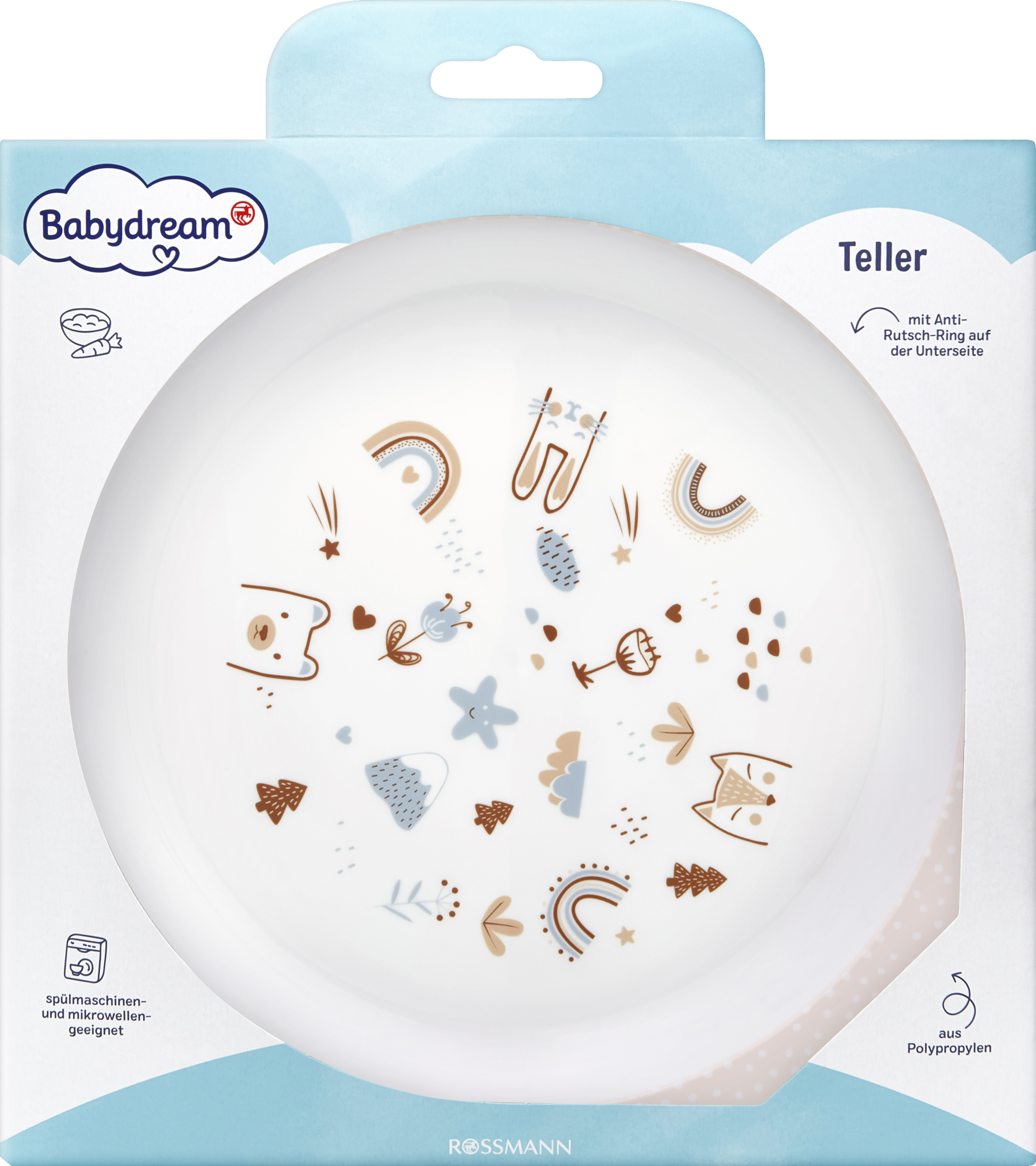 Unser Babydream Teller aus hochwertigem PP ist vielseitig einsetzbar. Der rutschfeste Ring auf der Unterseite verleiht dem Teller Standsicherheit - damit macht Essen lernen Spaß! Wir empfehlen den Teller für Kinder ab 6 Monaten.