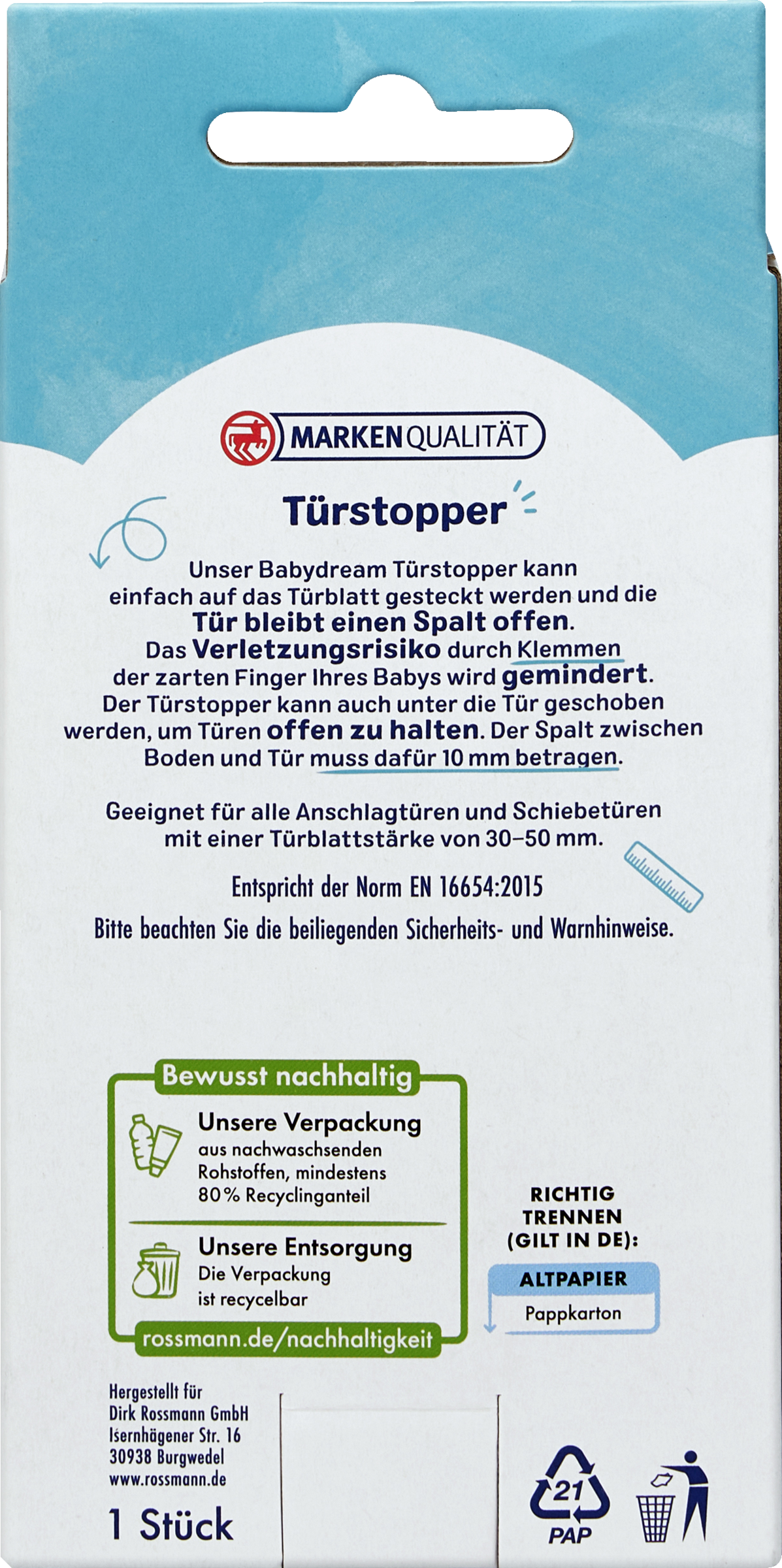 Unser Babydream Türstopper kann einfach auf das Türblatt gesteckt werden und die Tür bleibt einen Spalt offen. Das Verletzungsrisiko durch Klemmen der zarten Finger Ihres Babys wird gemindert. Der Türstopper kann auch unter die Tür geschoben werden, um Türen offen zu halten. Der Spalt zwischen Boden und Tür muss dafür 10 mm betragen.Geeignet für alle Anschlagtüren und Schiebetüren mit einer Türblattstärke von 30 - 50 mm.Entspricht der Norm EN 16654:2015. Bitte beachten Sie die beiliegenden Sicherheits- und Warnhinweise.