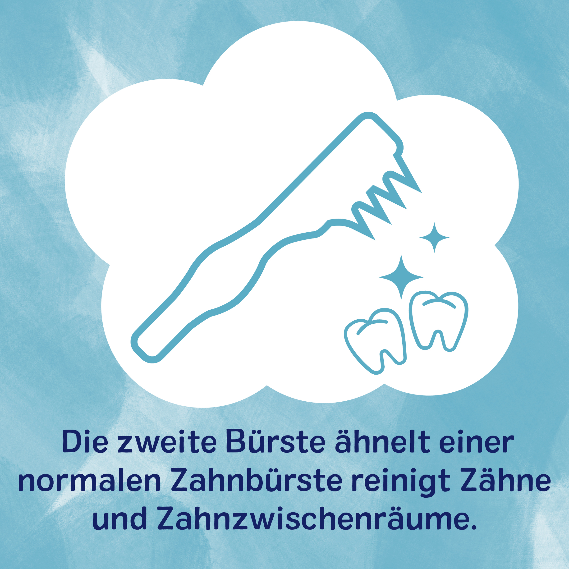 - mit der zweiten Bürste kann sich Ihr Kind schon ganz groß fühlen, denn sie ähnelt schon deutlich einer normalen Zahnbürste. Mit ihr lernt Ihr Kind die richtigen Putzbewegungen und reinigt damit die Zähne und Zahnzwischenräume, ganz nach dem Vorbild von Mama und Papa