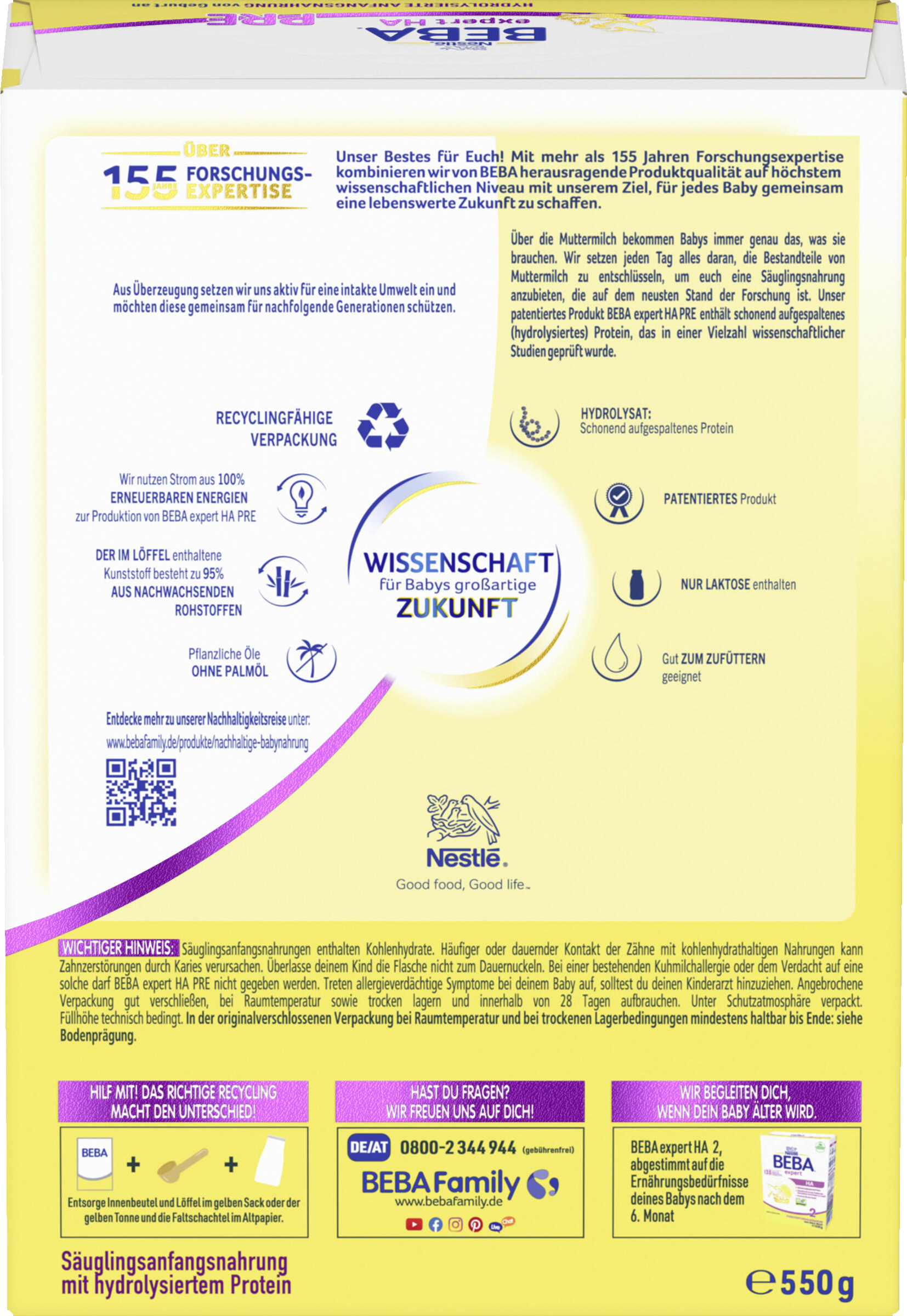Stillen ist die beste Ernährung für dein Baby – gerade auch, wenn dein Baby ein erhöhtes Allergierisiko hat. Daher sollte so lange wie möglich gestillt werden. Bitte sprich mit deinem Kinderarzt oder deiner Hebamme, wenn du eine Säuglingsanfangsnahrung verwenden möchtest. Säuglingsanfangsnahrungen enthalten Kohlenhydrate. Häufiger oder dauernder Kontakt der Zähne mit kohlenhydrathaltigen Nahrungen kann Zahnzerstörungen durch Karies verursachen. Überlasse deinem Kind die Flasche nicht zum Dauernuckeln. Bei einer bestehenden Kuhmilchallergie oder dem Verdacht auf eine solche darf BEBA expert HA PRE nicht gegeben werden. Treten allergieverdächtige Symptome bei deinem Baby auf, solltest du deinen Kinderarzt hinzuziehen. Füllhöhe technisch bedingt.