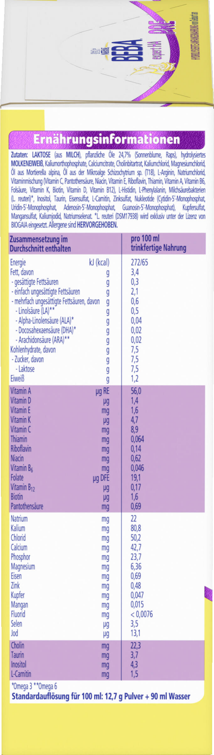 LAKTOSE (aus MILCH), pflanzliche Öle 24,7%, (Sonnenblume, Raps), hydrolysiertes MOLKENEIWEISS, Kaliumorthophosphate, Calciumcitrate, Cholinbitartrat, Kaliumchlorid, Magnesiumchlorid, Öl aus Mortierella alpina, Öl aus der Mikroalge Schizochytrium sp. (T18), L-Arginin, Natriumchlorid, Vitaminmischung (Vitamin C, Pantothensäure, Niacin, Vitamin E, Riboflavin, Thiamin, Vitamin A, Vitamin B6, Folsäure, Vitamin K, Biotin, Vitamin D, Vitamin B12), L-Histidin, L-Phenylalanin, Milchsäurebakterien (L. reuteri)*, Inositol, Taurin, Eisensulfat, L-Carnitin, Zinksulfat, Nukleotide (Cytidin-5'-Monophosphat, Uridin-5'-Monophosphat, Adenosin-5'-Monophosphat, Guanosin-5'-Monophosphat), Kupfersulfat, Mangansulfat, Kaliumjodid, Natriumselenat. *L. reuteri (DSM17938) wird exklusiv unter der Lizenz von BioGaia eingesetzt.