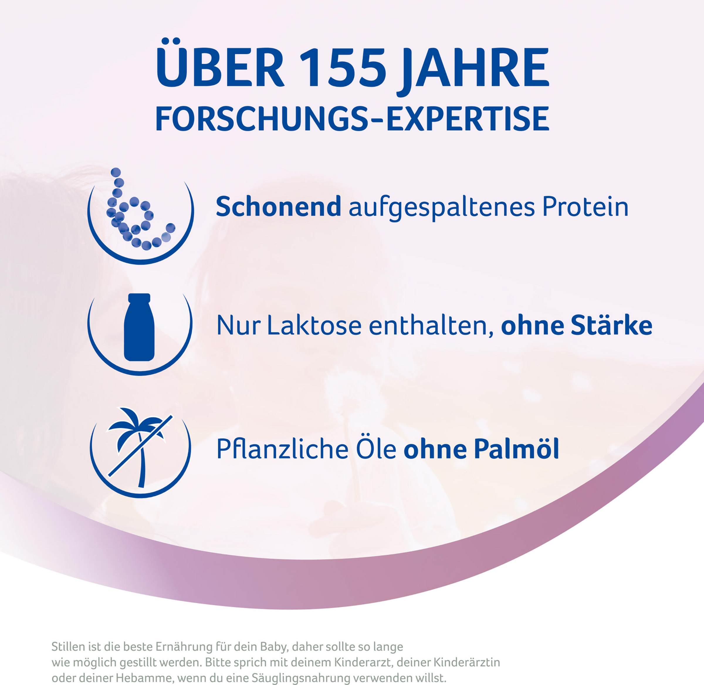 Beachte bei der Zubereitung von Säuglingsnahrung genau die Gebrauchsanweisung. Unsachgemäße Zubereitung und Lagerung kann zu gesundheitlichen Beeinträchtigungen durch Wachstum unerwünschter Keime führen. Bereite die Nahrung vor jeder Mahlzeit frisch zu und füttere diese sofort. Nahrungsreste nicht wiederverwenden. Flasche, Sauger und Ring gründlich reinigen und 5 Minuten auskochen. Erwärme die Säuglingsnahrung nicht in der Mikrowelle (Verbrühungsgefahr).