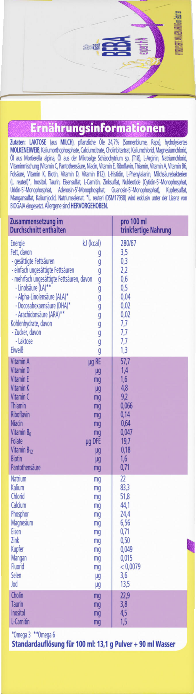 LAKTOSE (aus MILCH), pflanzliche Öle 24,7%, (Sonnenblume, Raps), hydrolysiertes MOLKENEIWEISS, Kaliumorthophosphate, Calciumcitrate, Cholinbitartrat, Kaliumchlorid, Magnesiumchlorid, Öl aus Mortierella alpina, Öl aus der Mikroalge Schizochytrium sp. (T18), L-Arginin, Natriumchlorid, Vitaminmischung (Vitamin C, Pantothensäure, Niacin, Vitamin E, Riboflavin, Thiamin, Vitamin A, Vitamin B6, Folsäure, Vitamin K, Biotin, Vitamin D, Vitamin B12), L-Histidin, L-Phenylalanin, Milchsäurebakterien (L. reuteri)*, Inositol, Taurin, Eisensulfat, L-Carnitin, Zinksulfat, Nukleotide (Cytidin-5'-Monophosphat, Uridin-5'-Monophosphat, Adenosin-5'-Monophosphat, Guanosin-5'-Monophosphat), Kupfersulfat, Mangansulfat, Kaliumjodid, Natriumselenat.